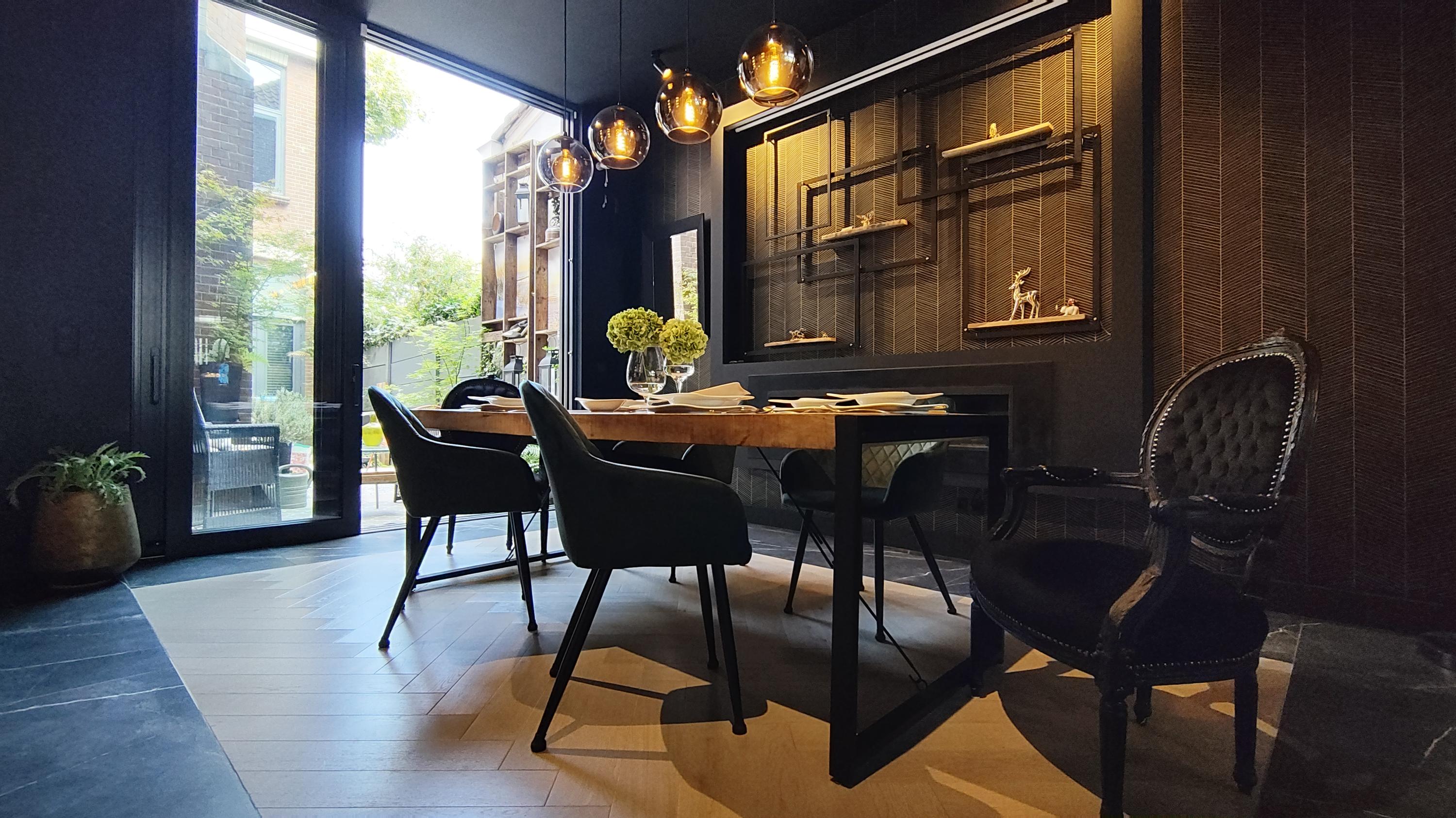 The dining room opens directly onto the sunny garden through a floor-to-ceiling sliding door, seamlessly connecting indoors and outdoors. A concealed electric projection screen allows you to transform the space into your own private cinema. Underfloor heating, together with stylish fireplaces, adds to the comfort and atmosphere of the living areas.