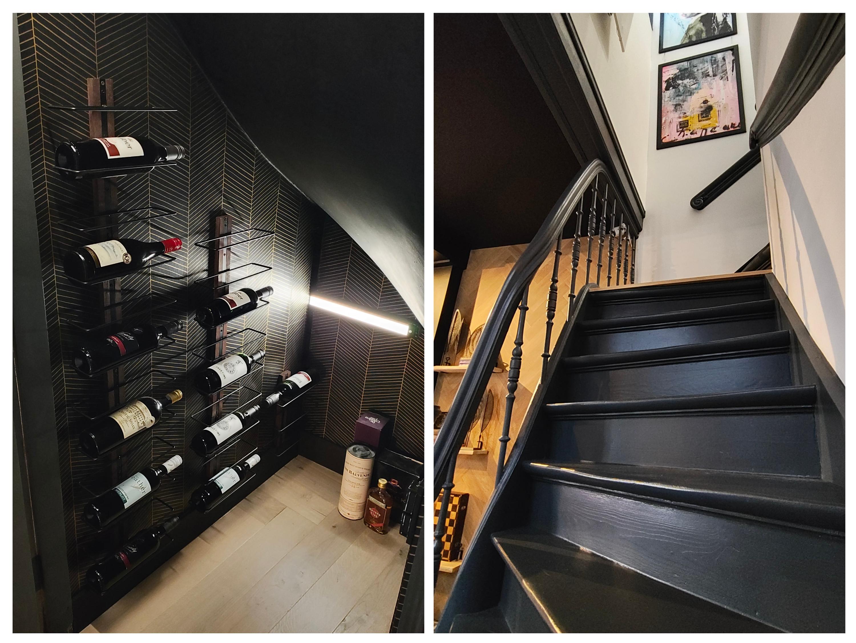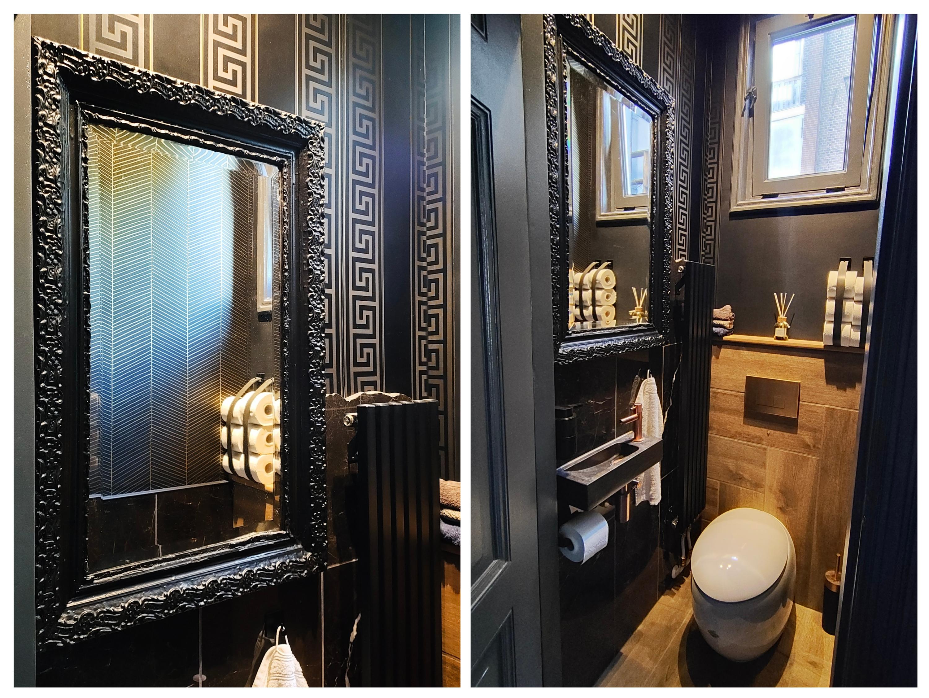 The master bedroom exudes grandeur, with mahogany parquet flooring, elegant period details, and direct access to the garden. A second room on this level – currently used as a study – also opens onto the garden through French doors. Both luxurious bathrooms are fitted with a freestanding bathtub, walk-in rain shower, and double sinks, finished with high-end materials and chic herringbone floor tiles.