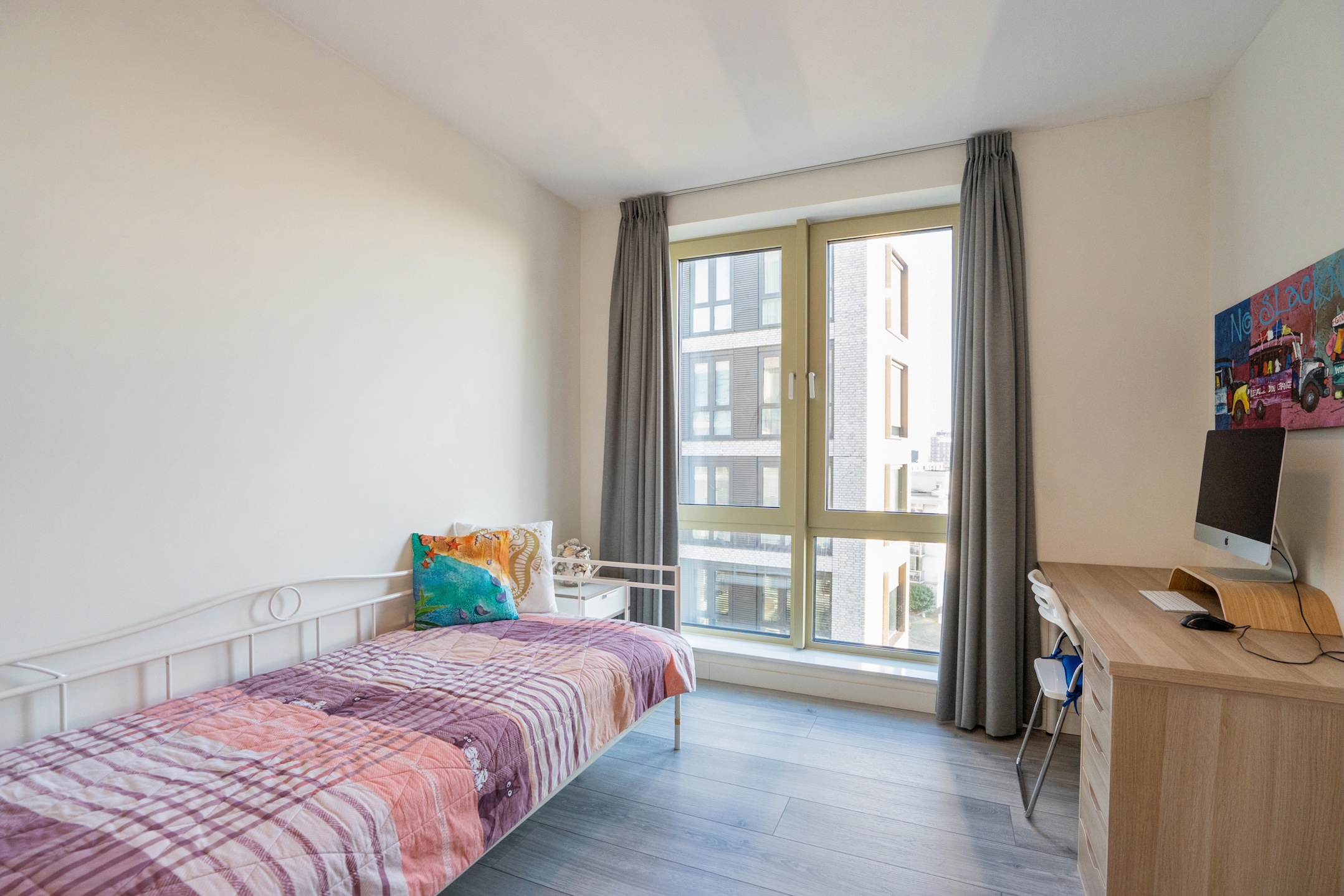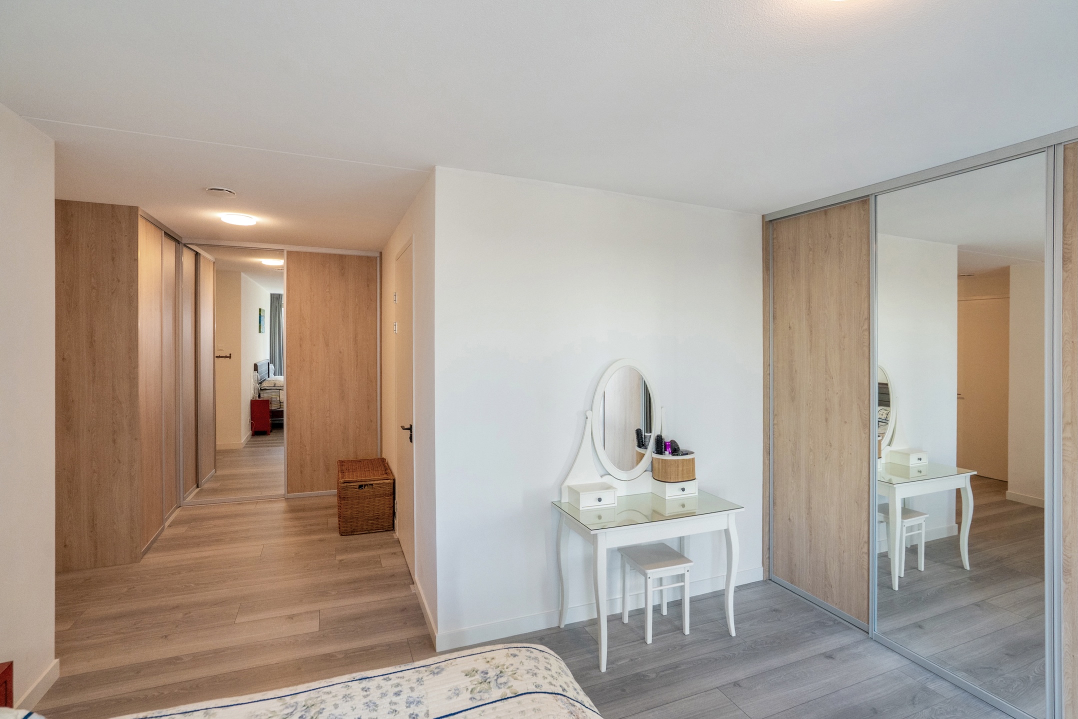 This property has 3 full-sized bedrooms. Immediately on the right side of the hallway, you will find the first 2 bright bedrooms. The described hallway leads to a spacious hall with double wardrobes arranged in a corner setup, access to a bathroom, and a generous master bedroom, which also has a large wardrobe wall and 2 large windows. Then there is the spacious bathroom, featuring a dark gray tiled floor, towel radiator, wide vanity unit with double sinks and faucets, a bathtub, a deep walk-in shower, and the 3rd wall-mounted toilet.