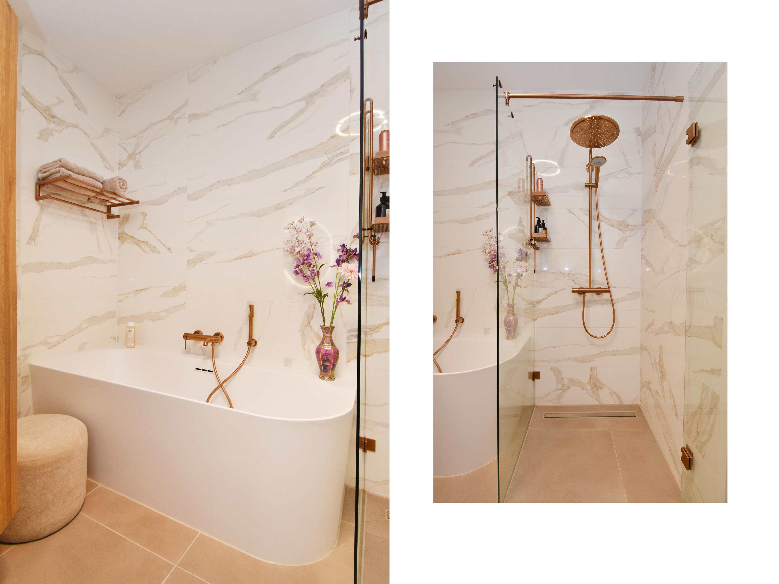 At the front is the seating area with a stylish custom-made wall unit featuring a closable workspace. At the rear you’ll find the designer kitchen with cooking island and every imaginable luxury built-in appliance, including an induction hob with integrated extractor, Quooker, dishwasher, combi-oven, spacious refrigerator, and separate freezer. From the kitchen, the large sliding doors open onto the generous balcony, where you can peacefully enjoy the afternoon and evening sun.