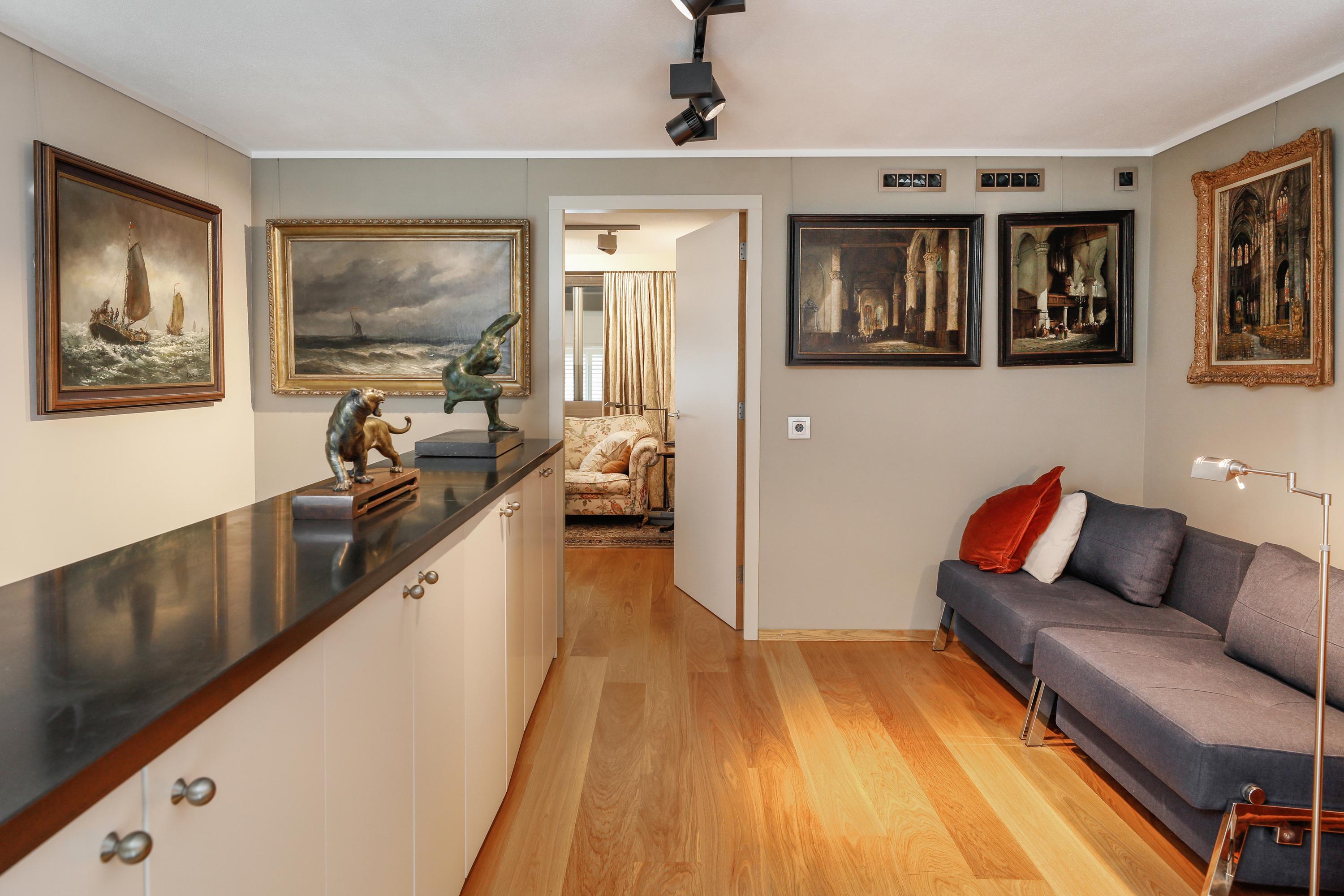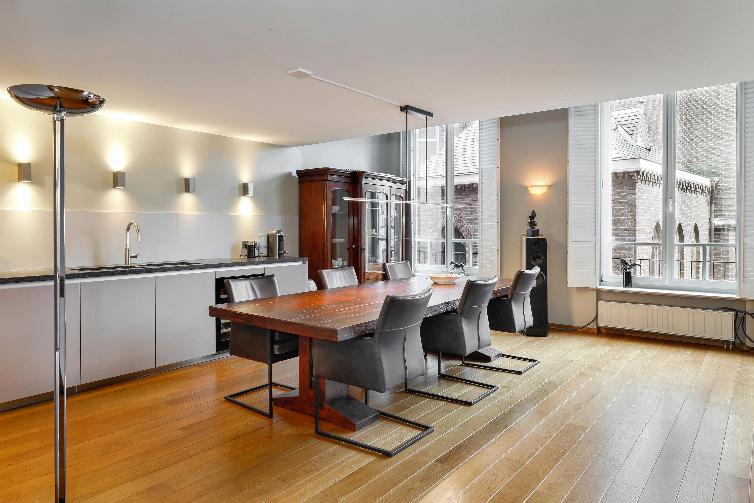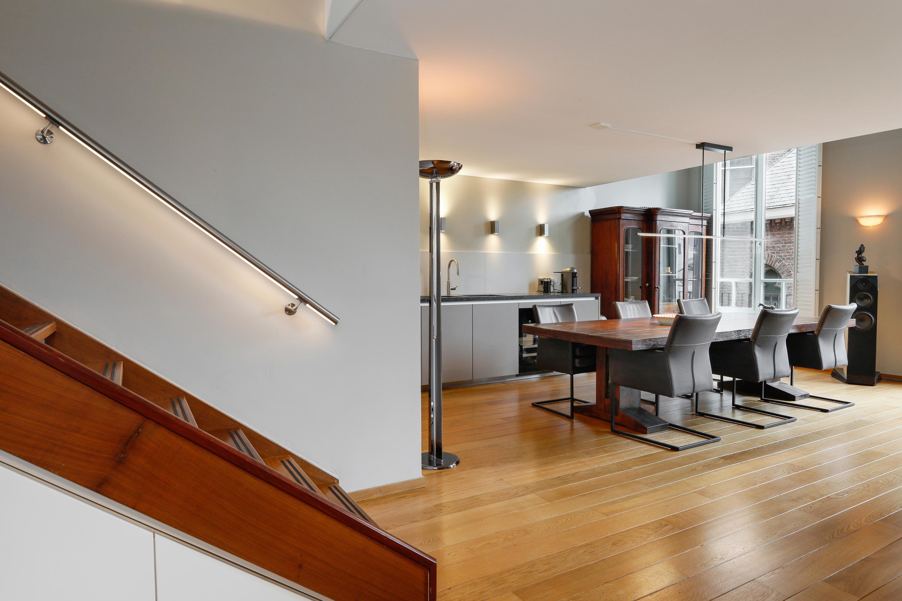 It's quite special to find this modern home behind the historic facade. During the renovation/reconstruction, only the front facade remained. With the tall windows, that history still permeates your luxury apartment. And thankfully so. The ceiling height on the facade is still approximately 580 cm. Beautiful, and it allows light to penetrate deeply into your home. Where a loggia was planned in 2001, there's now a space that can be used year-round. So even on a summer day, it can be used as a loggia by opening the large, tall windows. A cozy seating area and the kitchen are located downstairs.