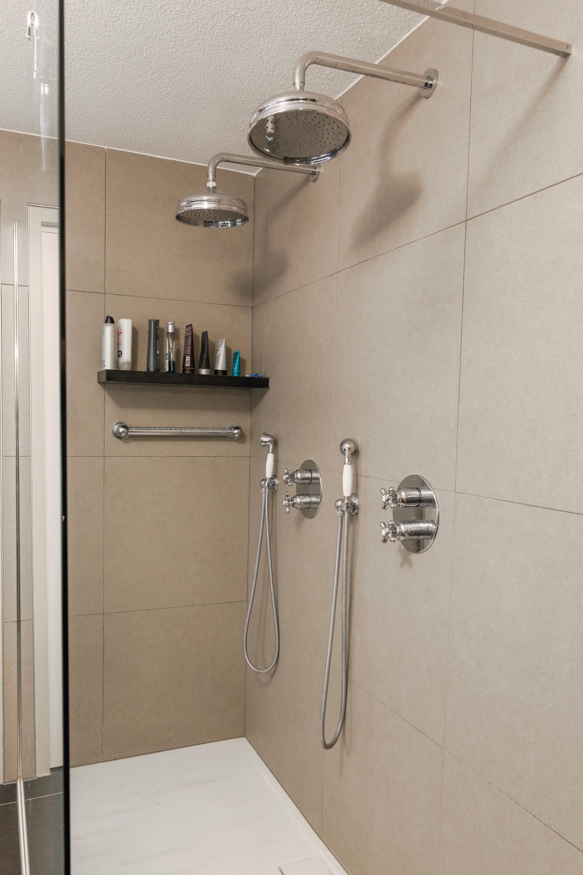 With soft tones, large tiles, and a well-designed layout, a double walk-in shower was installed in 2018, which you'll thoroughly enjoy. The floor is tiled with non-slip underfloor heating. The Geberit Mera AquaClean toilet is placed behind a low wall for privacy. There's a double shower and a slightly raised vanity with two sinks and a heated mirror. Towels and other bathroom utensils can be conveniently stored in cupboards and on open glass shelves.