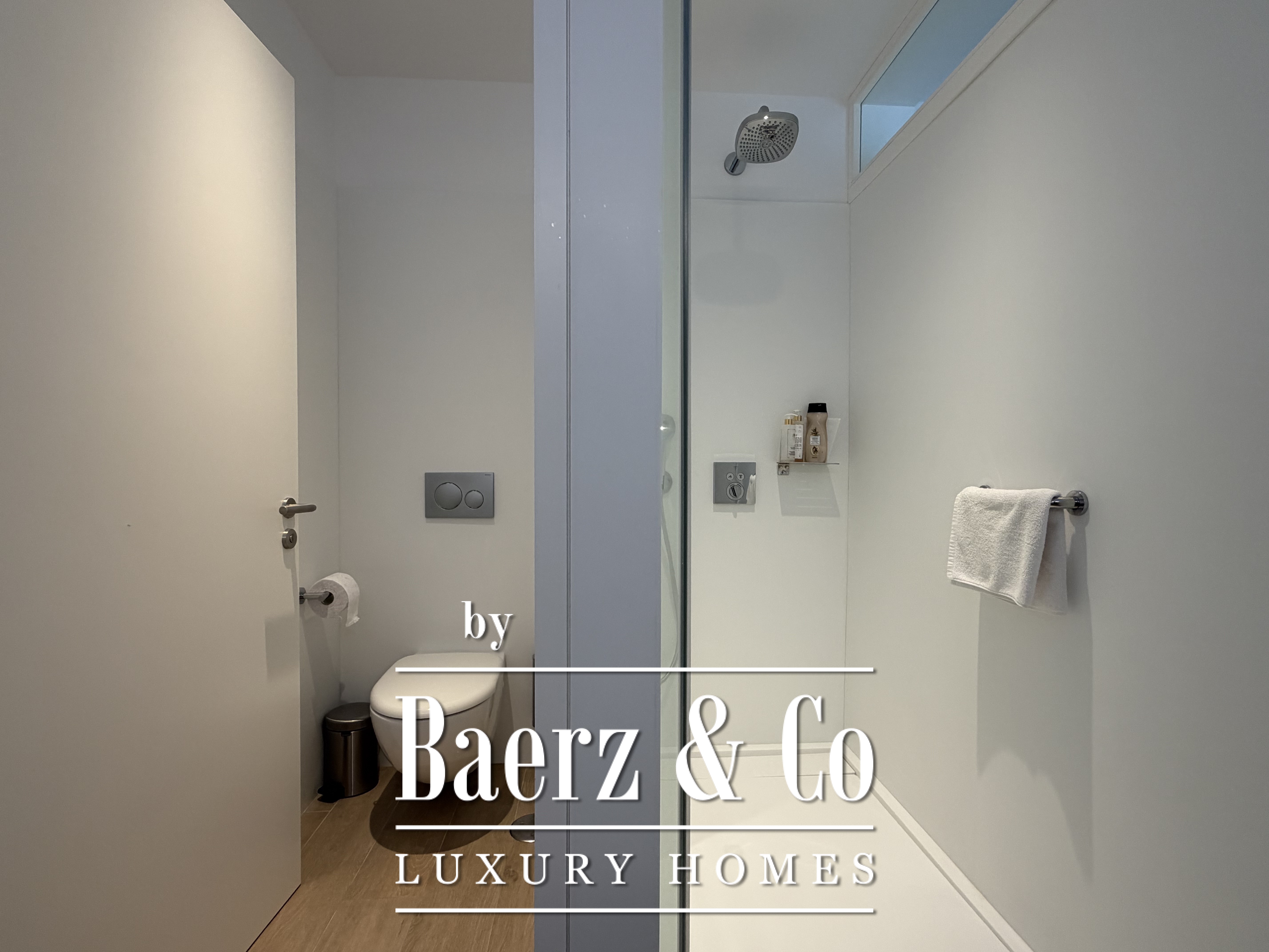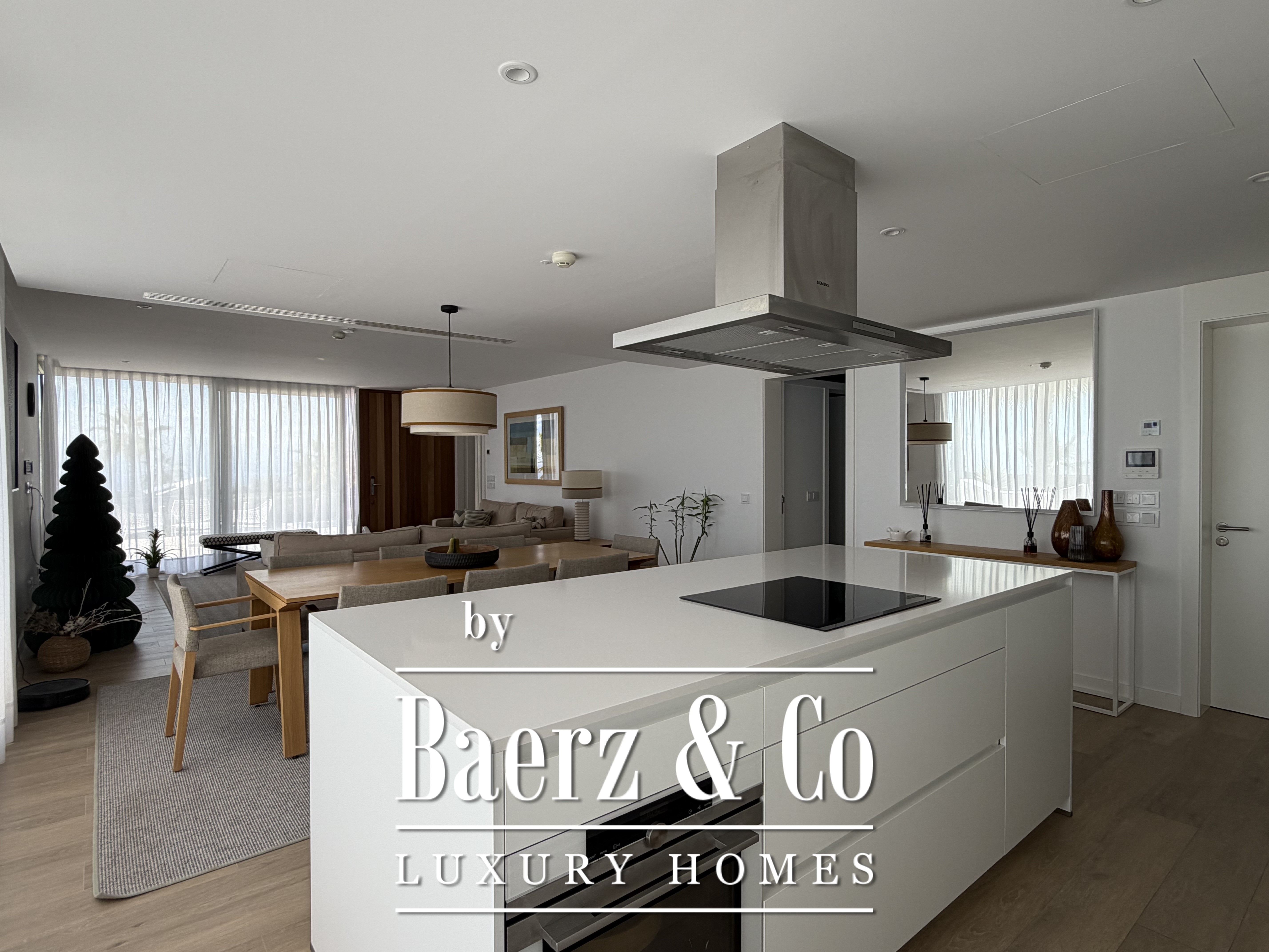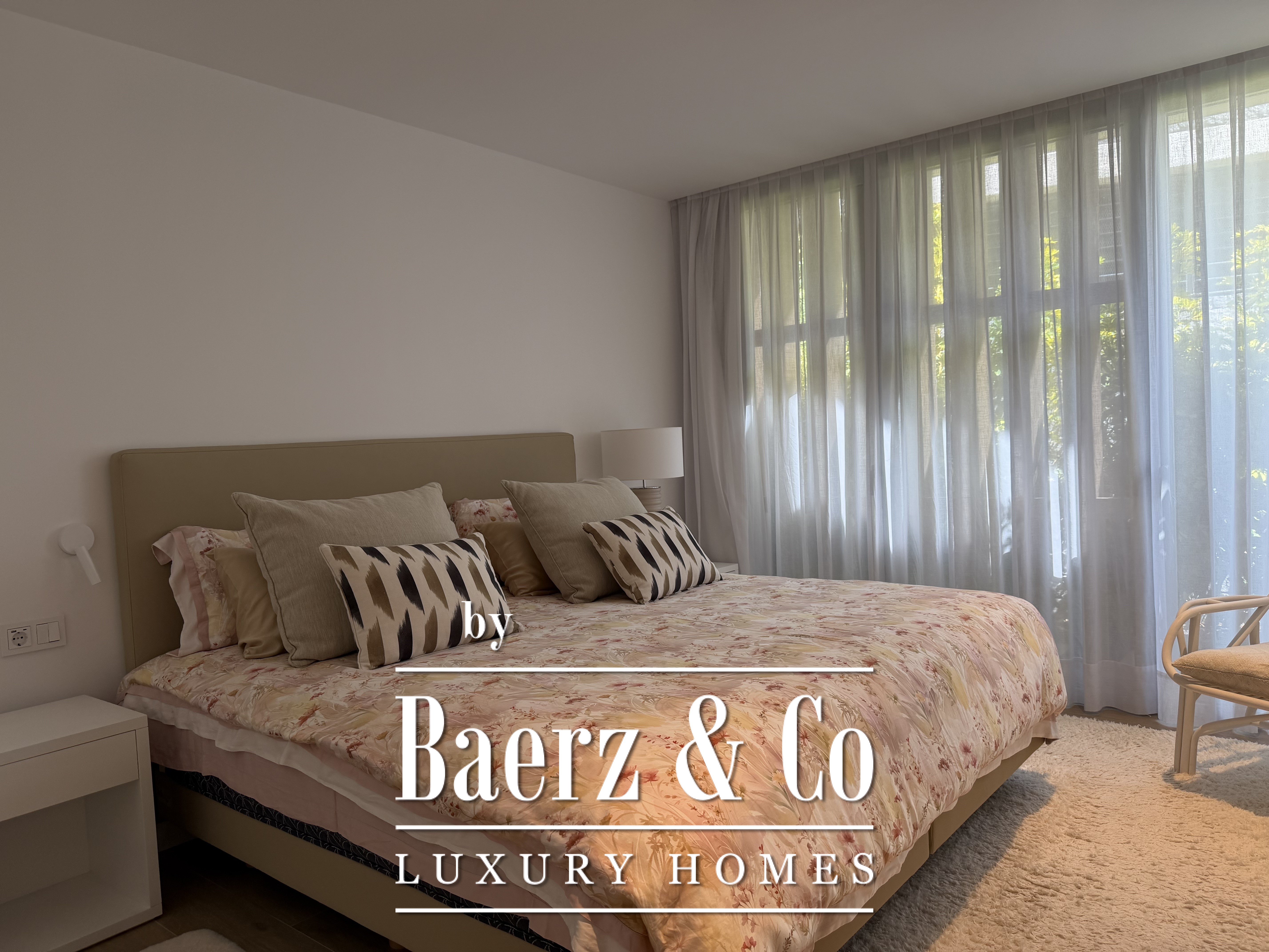 Natural light fills the interiors through expansive windows, framing the horizon and creating seamless access to the terrace and landscaped garden. Three bedrooms offer dressing rooms, while two bathrooms feature modern showers, underscoring the emphasis on refined functionality. The bright living room invites relaxation, whether enjoying a quiet moment or sharing the space with guests.