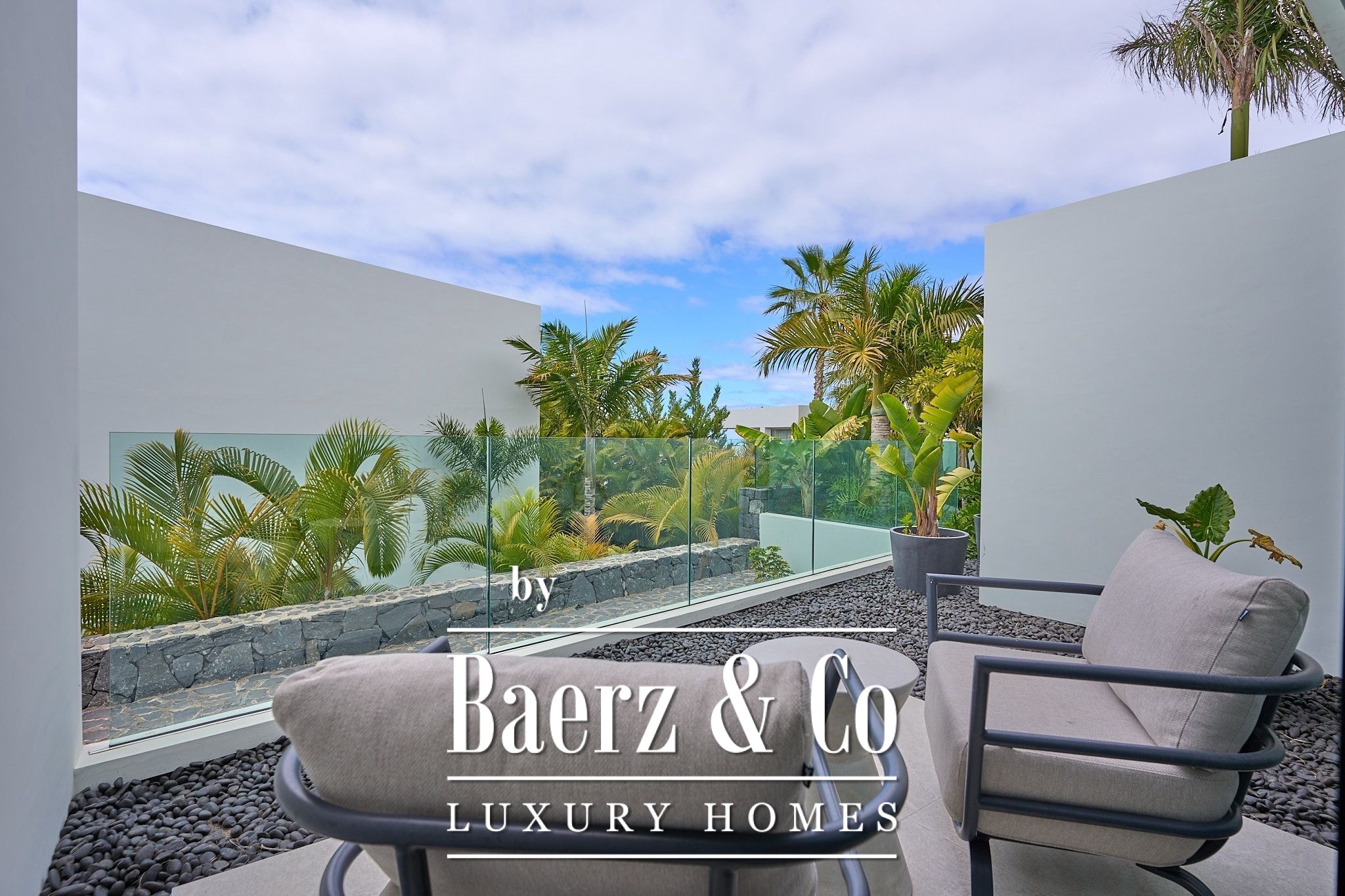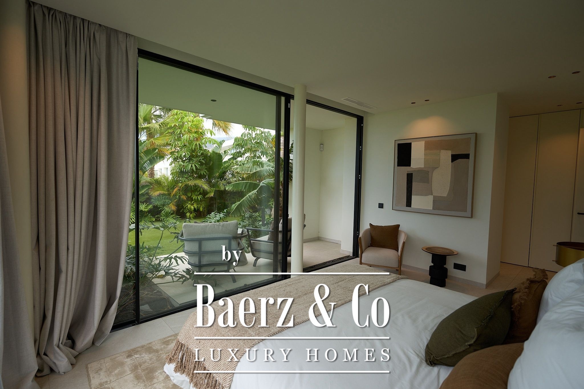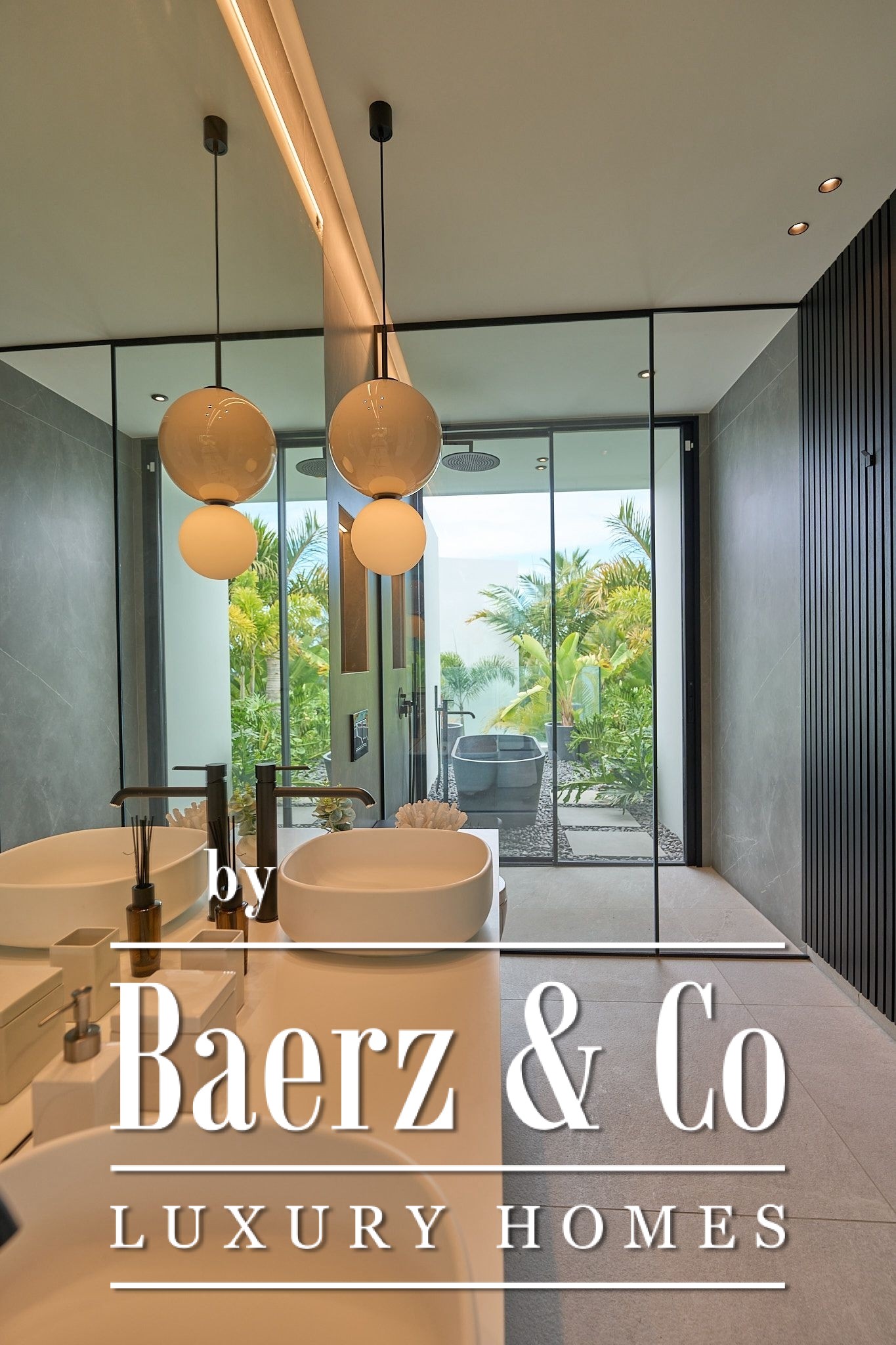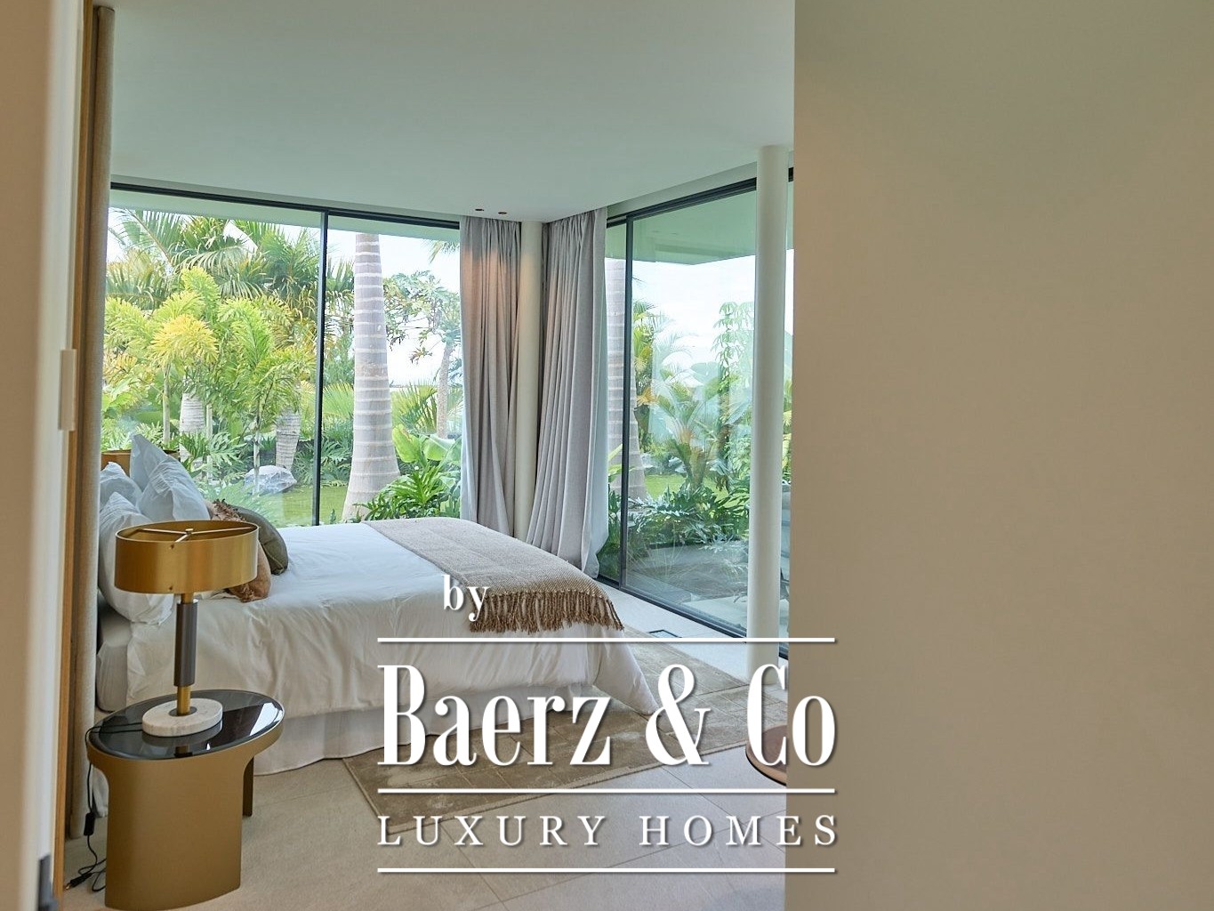 The villa features four en-suite bedrooms, each with built-in wardrobes and private access to lush tropical gardens that elevate the sense of space and tranquility. Upstairs, the spacious living and dining area flows naturally into a modern, fully equipped kitchen complemented by a climate-controlled wine cellar, while expansive windows amplify natural light and connect seamlessly to the exterior.