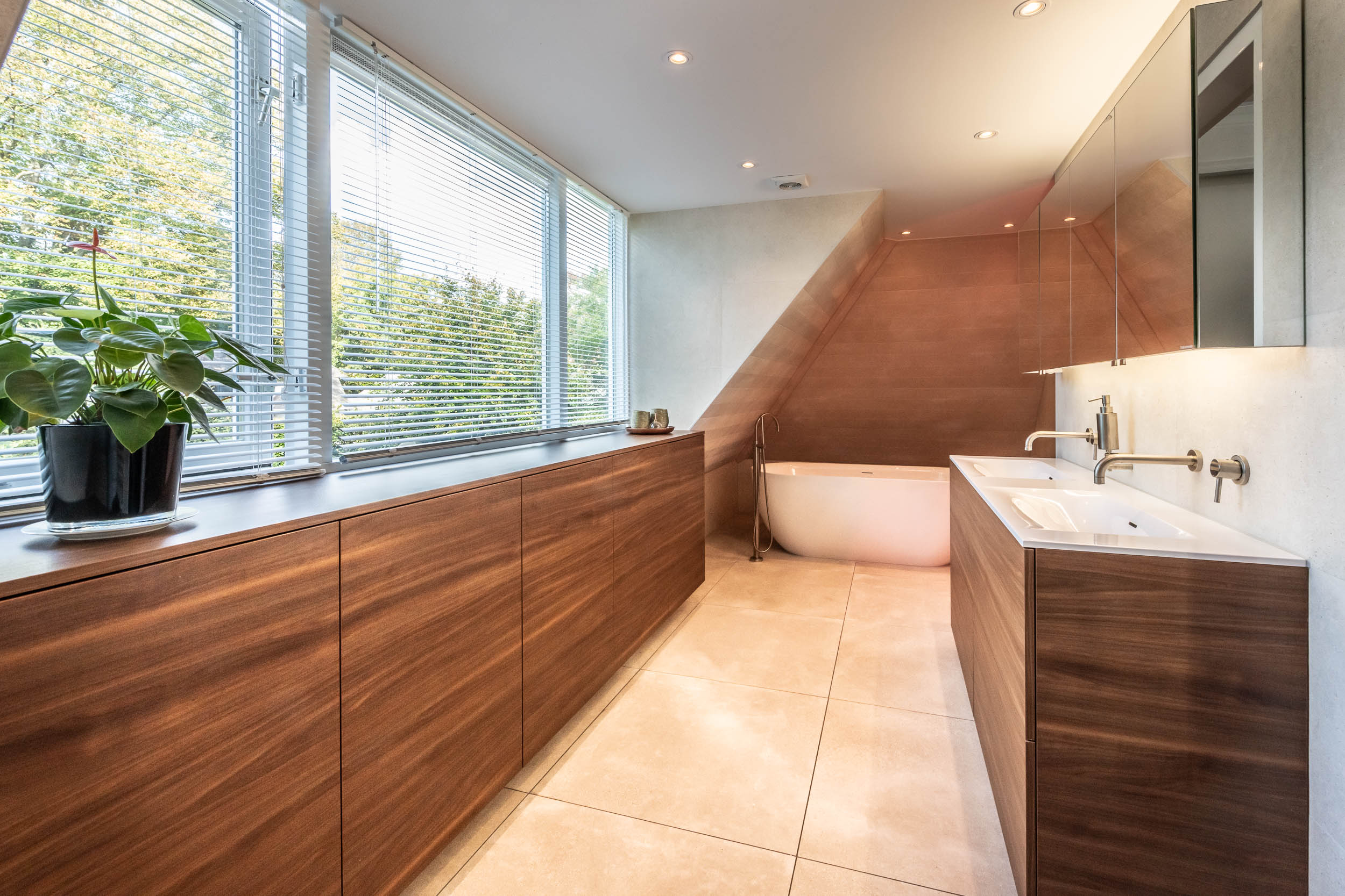 Landing, three bedrooms, including the spacious master bedroom (formerly two rooms) with walk-in wardrobes on both sides. Modern, tailor-made bathroom (’t Spant in Heemstede, 2022) with large dormer window, double washbasin unit, toilet, ample cupboard space, underfloor heating, freestanding bathtub, walk-in shower with Sunshower and hand shower.