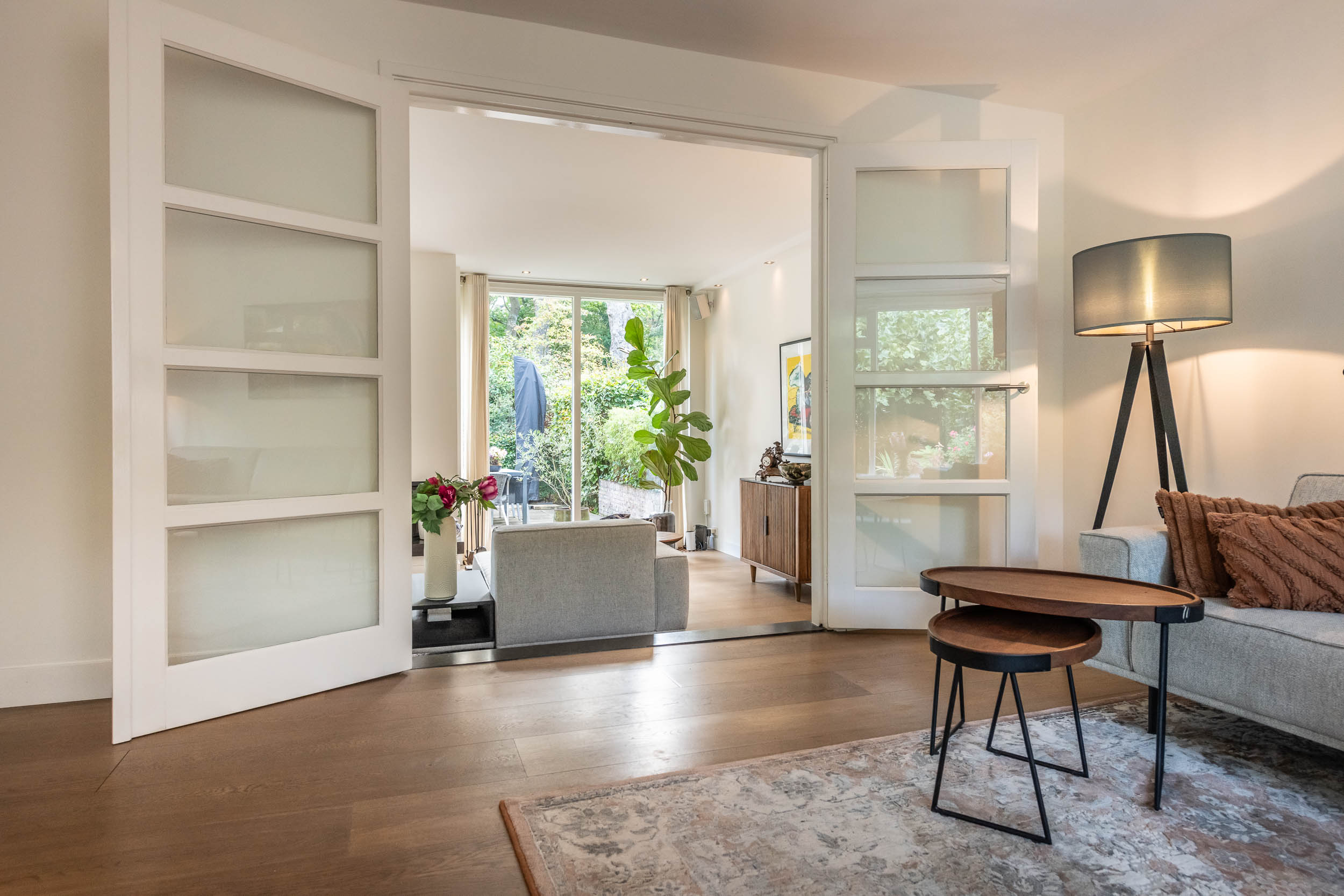 Entrance hall, spacious hallway with toilet and urinal, bright and spacious living room with fireplace, oak flooring and doors to the front terrace. A double door connects to the second living room/TV room with large windows and a view of the back garden. Luxurious, tailor-made kitchen-diner (’t Spant in Heemstede, 2022) featuring underfloor heating, a sink/kitchen island and various built-in appliances: wine climate cabinet, ovens, Quooker with sparkling water feature, coffee machine, Bora electric hob with flex zones and dishwasher. Door to the side garden.