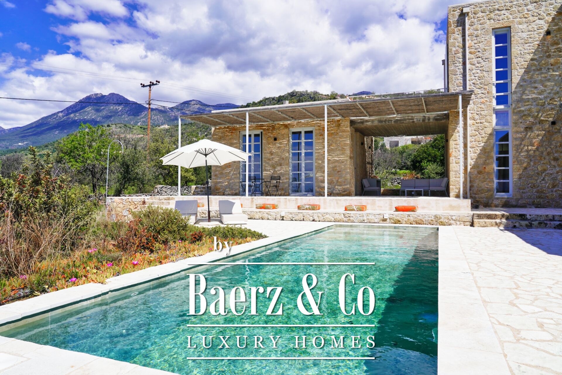 Stone villa Agios Nikolaos offers an exceptional blend of privacy, luxury, and the elemental beauty of the Greek coastline.