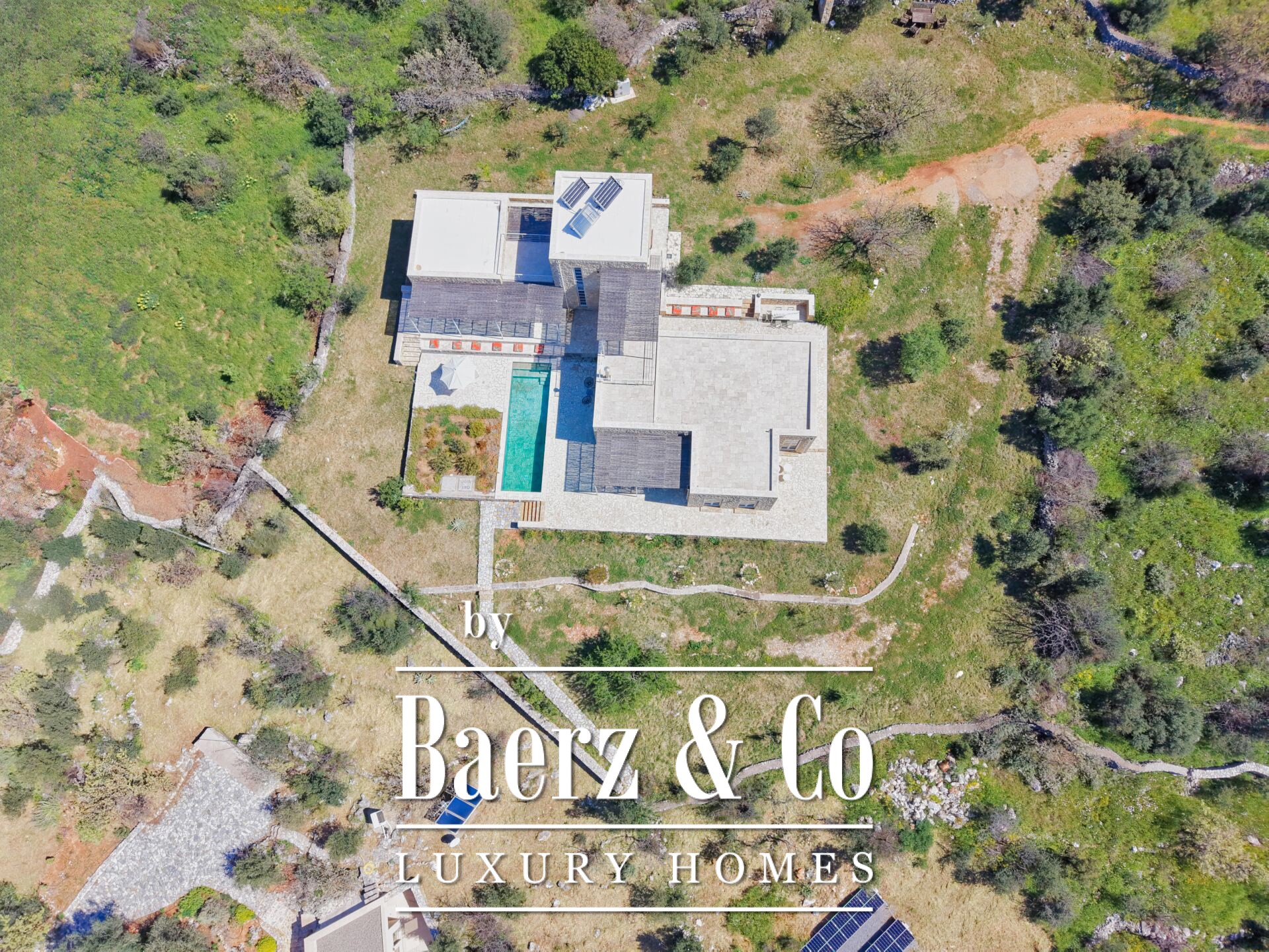Outside, a landscaped garden of trees surrounds a private 30 m² swimming pool and barbeque area. Security cameras, internet connectivity, water tanks, a storage room, insect screens, and electrical appliances complete the amenities. Just 2.5 km from the nearest beach and 2.9 km from the center of Agios Nikolaos, the location balances seclusion with access.