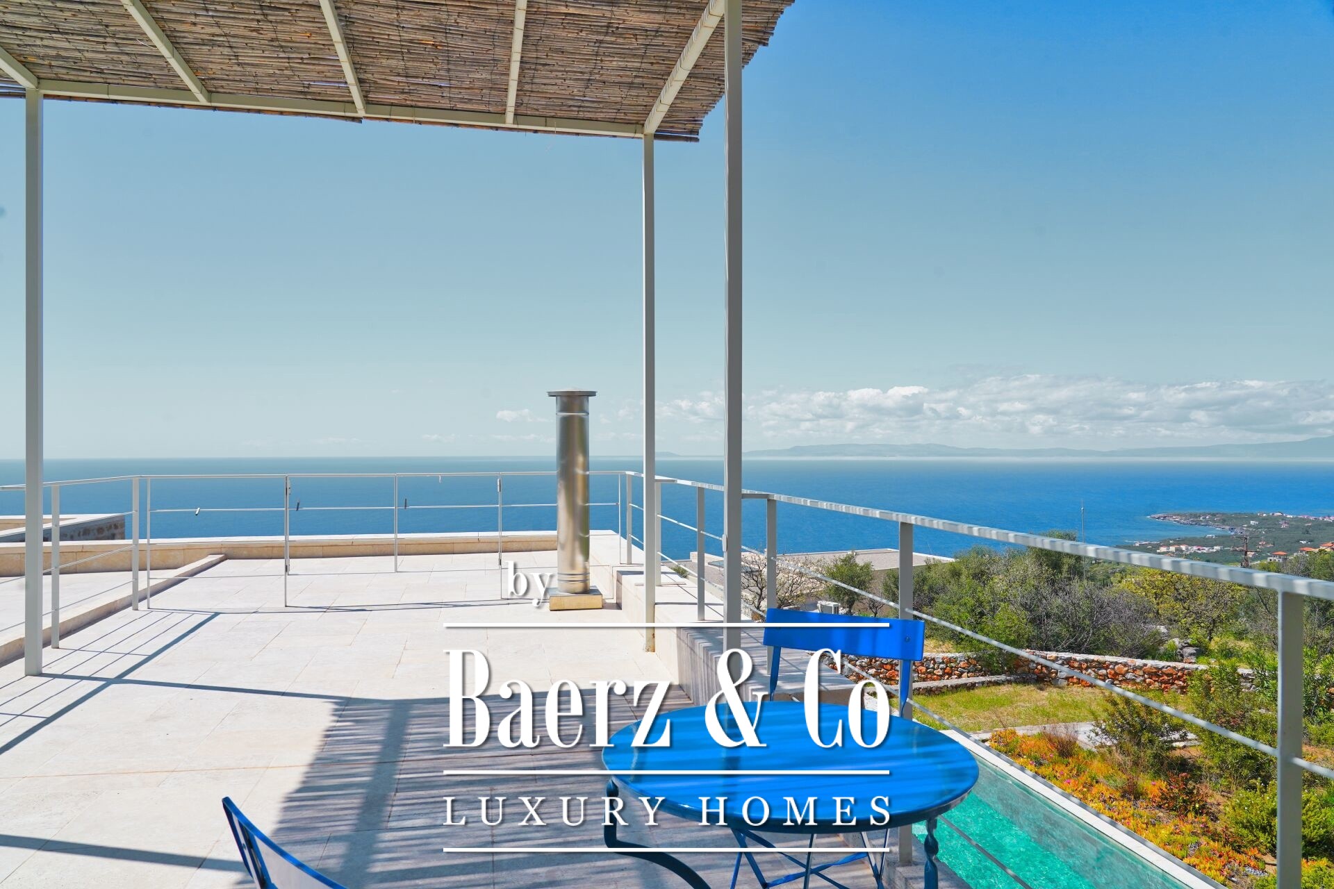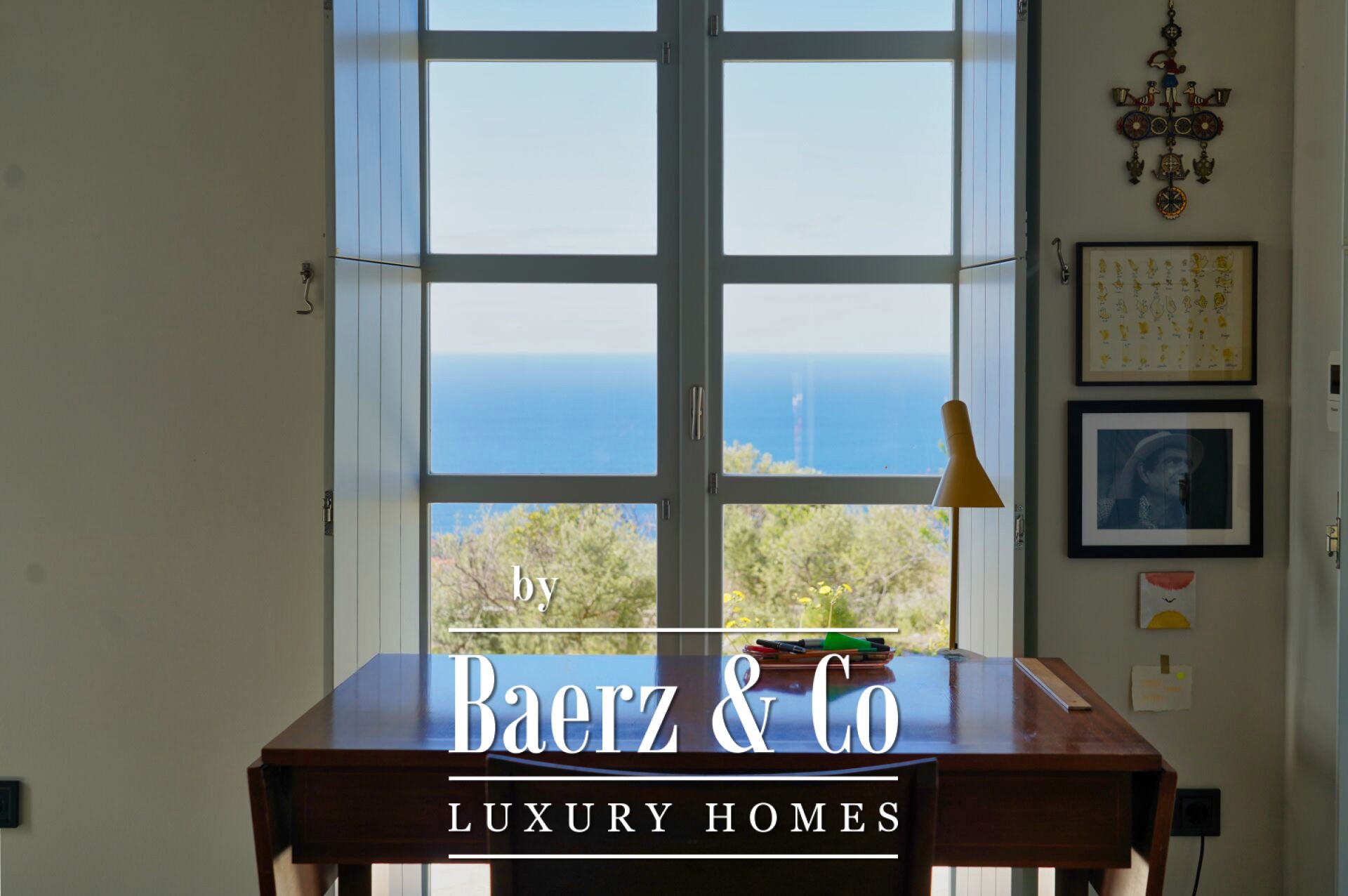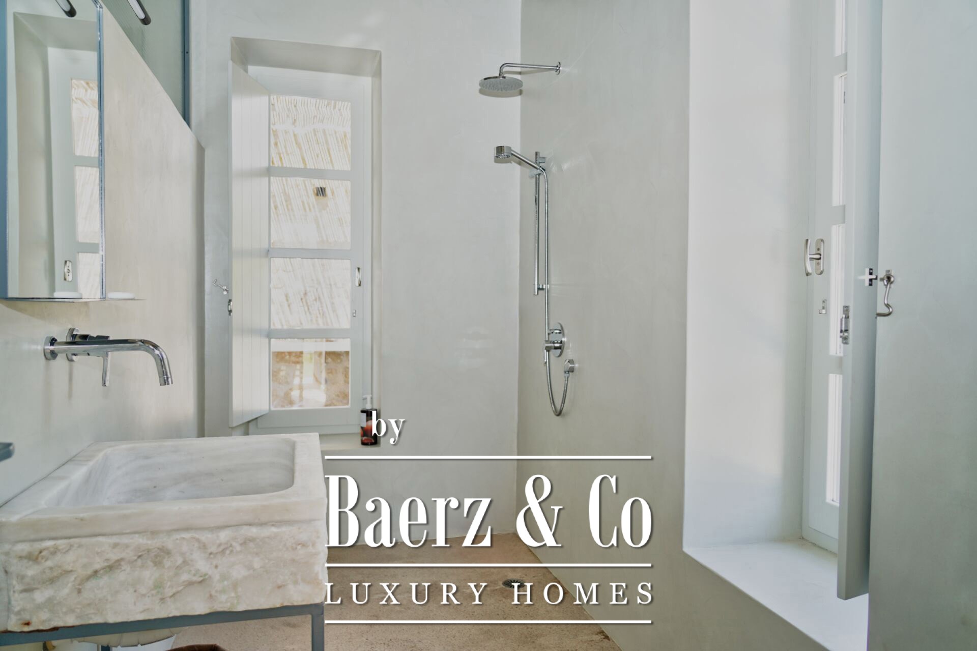 With four bedrooms and five bathrooms in total, the layout is designed for flexible use: spaces for guests, independent living quarters, and a generous main residence. The interiors are bright and sunlit, finished with stone flooring and wooden window frames, and comfort is ensured through underfloor heating, heat pump, per-level climate control, and full air conditioning. The villa is rated energy class B+ and features double glazing for insulation.