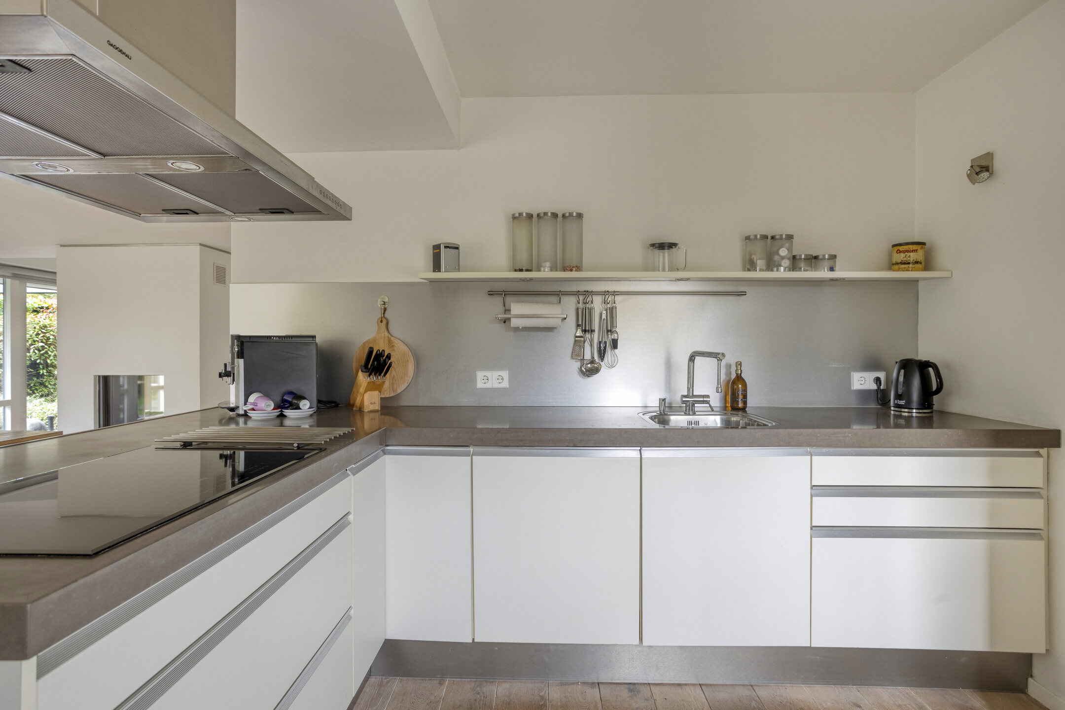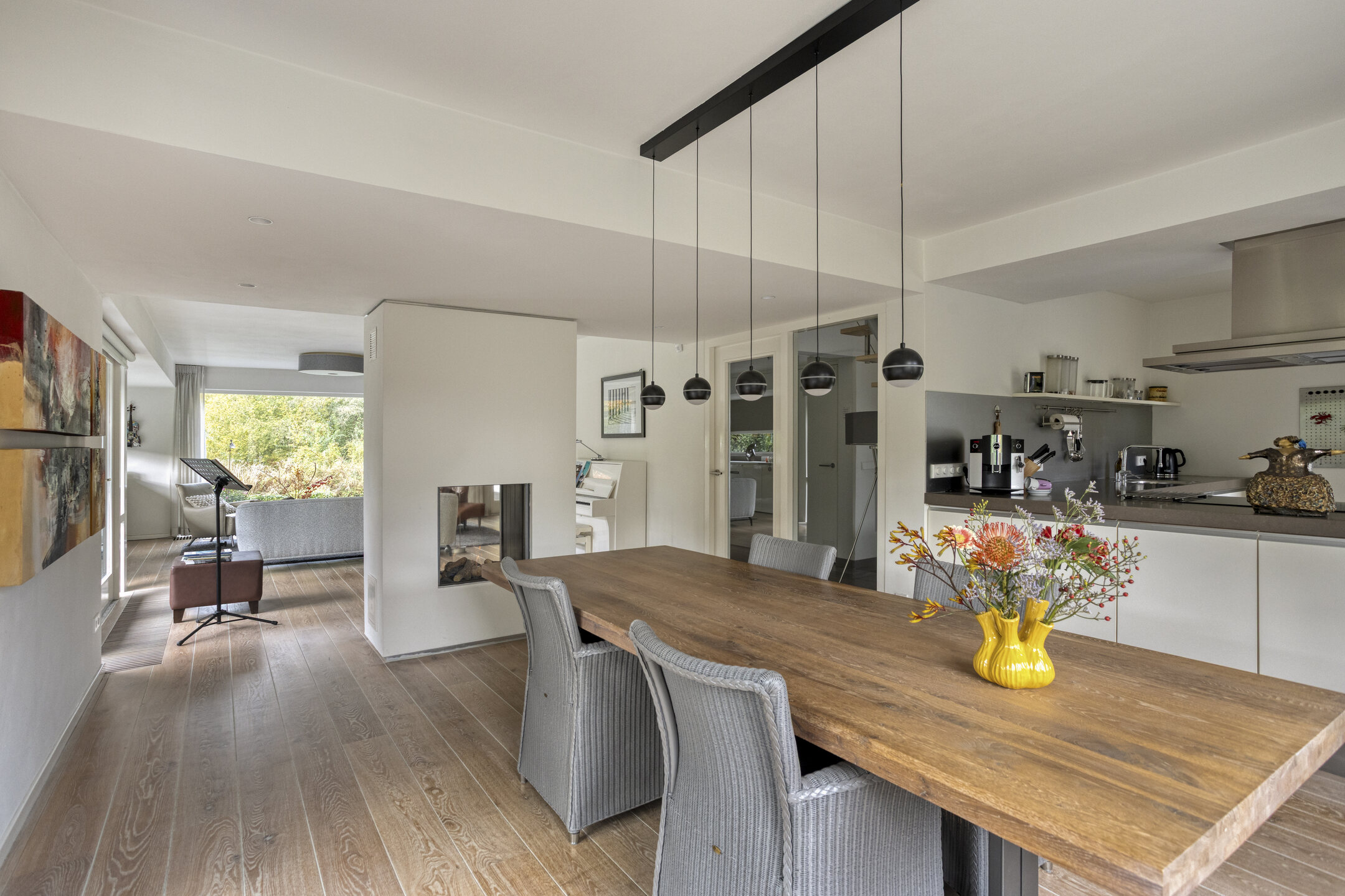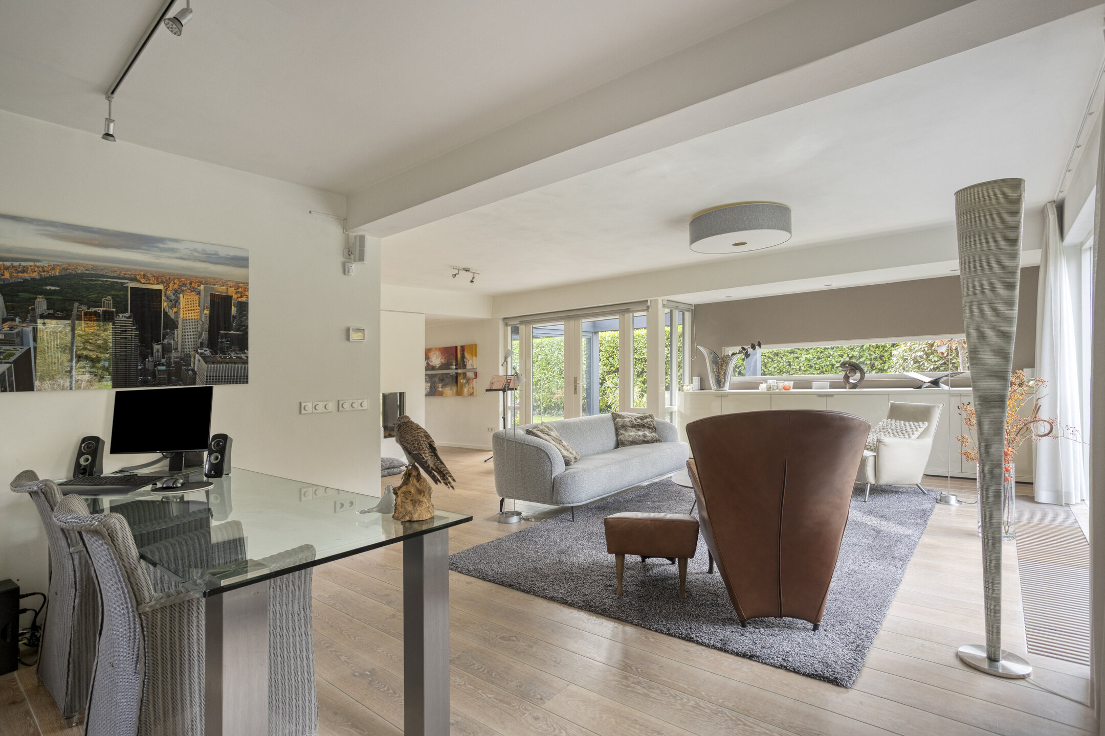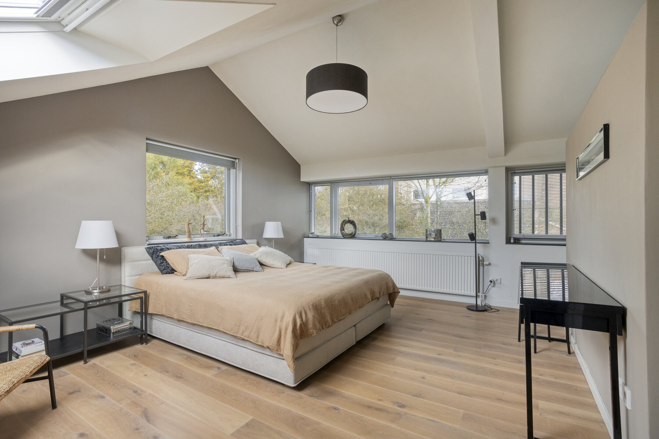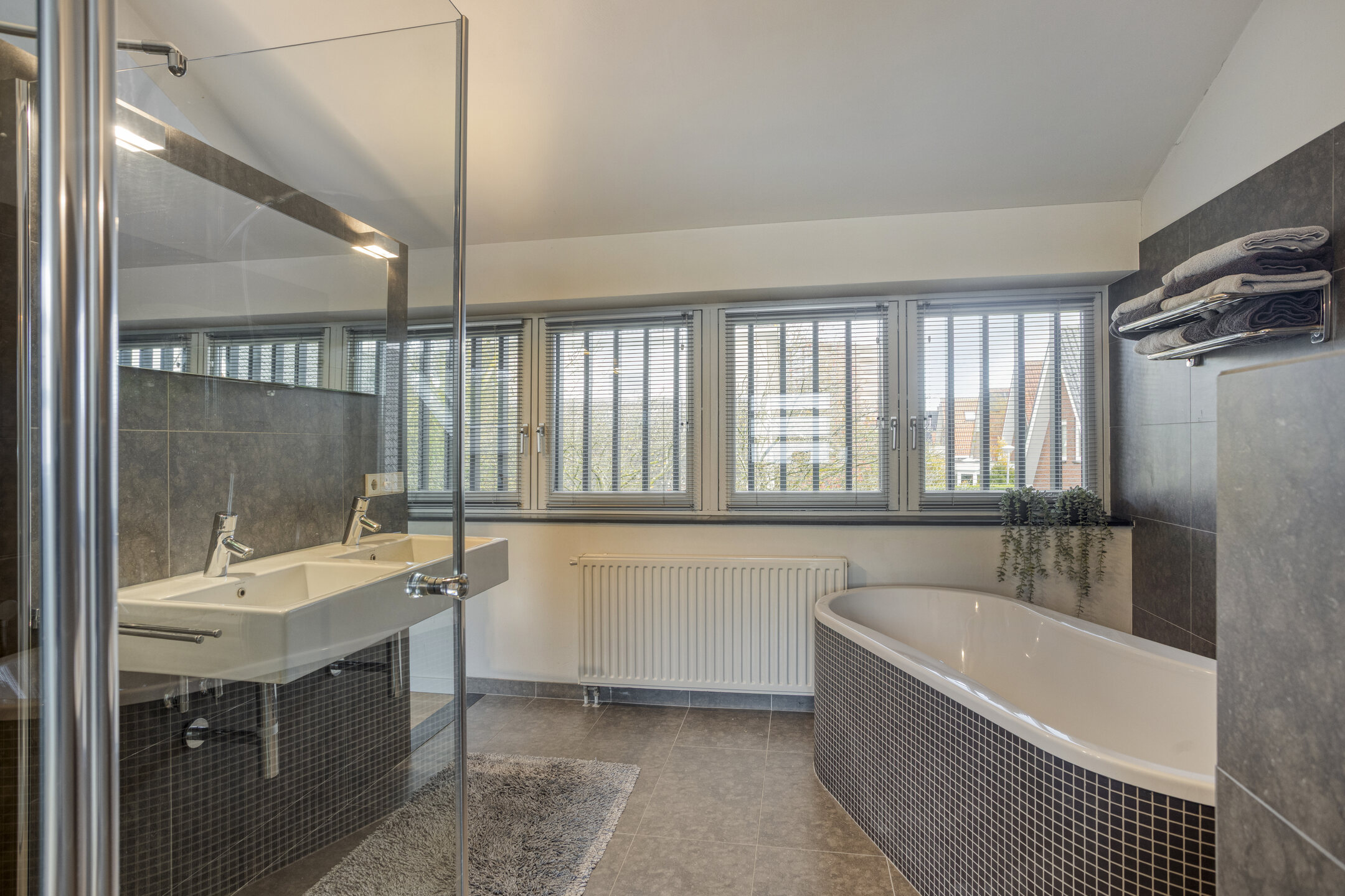Upon arrival, a spacious hallway opens to oak floors and clean-lined glass doors. The living room and kitchen-diner are divided by a Bellfire double-sided fireplace, anchoring the space with quiet warmth. A luxury kitchen, outfitted with top-grade appliances and a Belgian bluestone worktop, offers both function and ceremony for daily living. The rear façade, defined by expansive glazing, frames the garden’s rhythm and the protected landscape of Egmonderhout beyond.