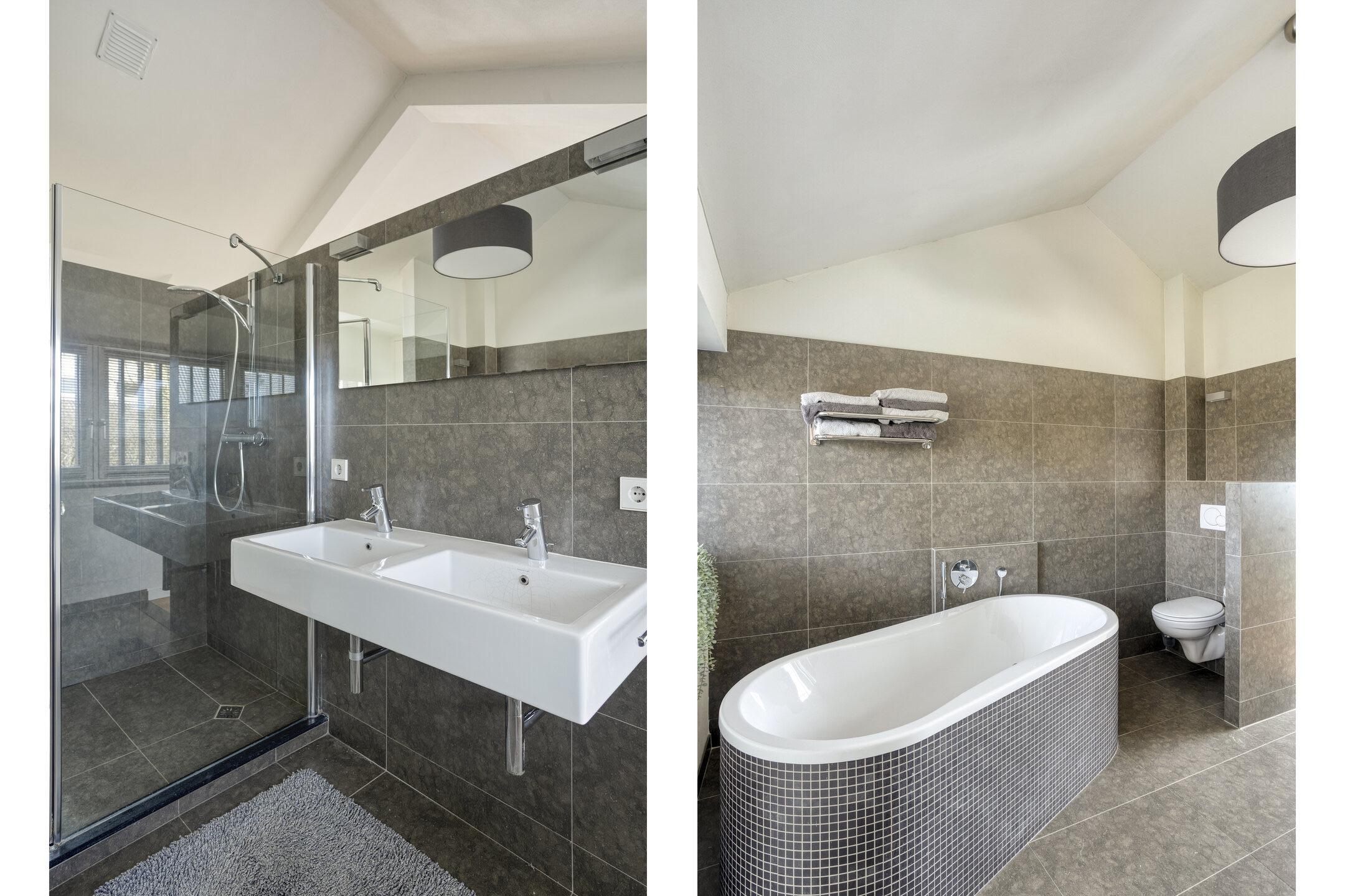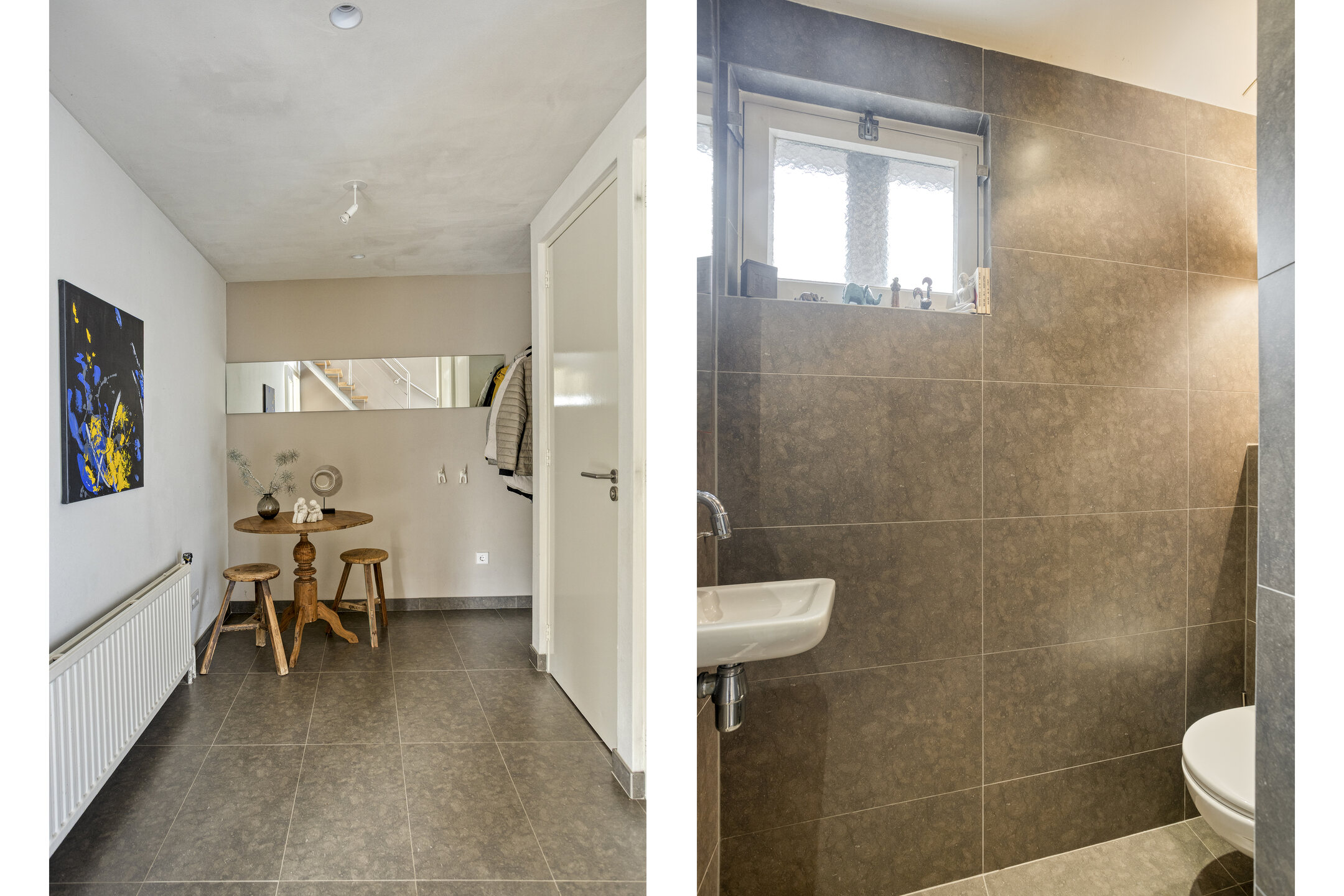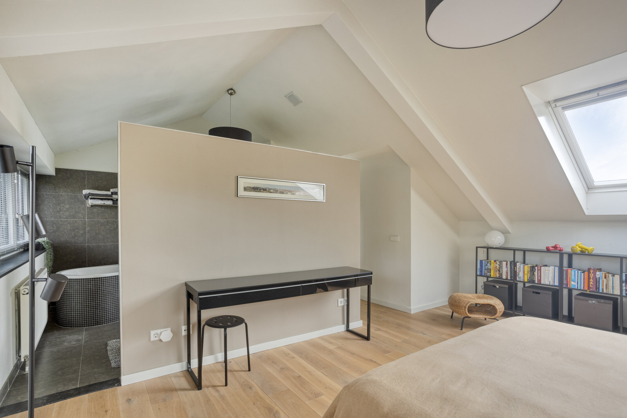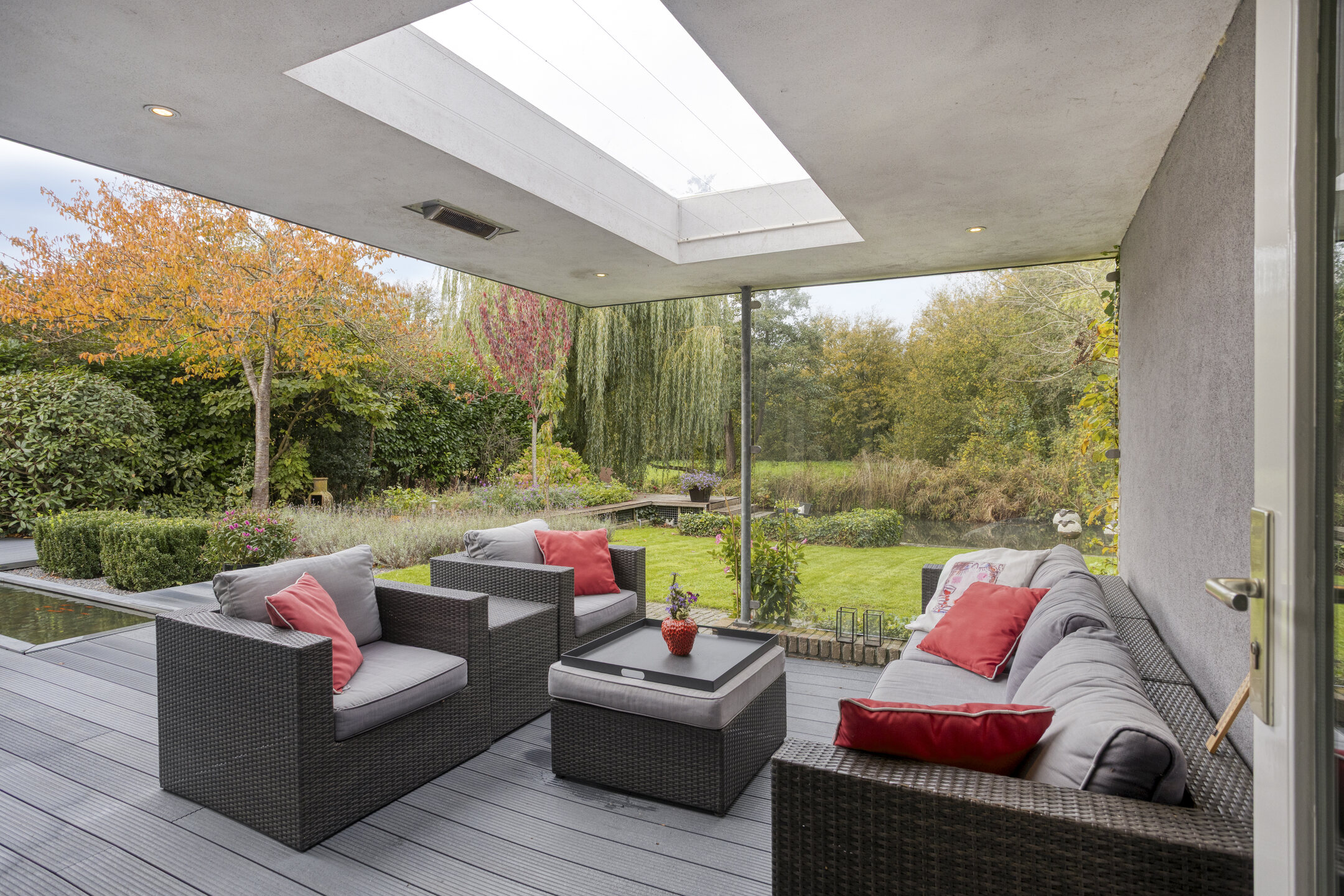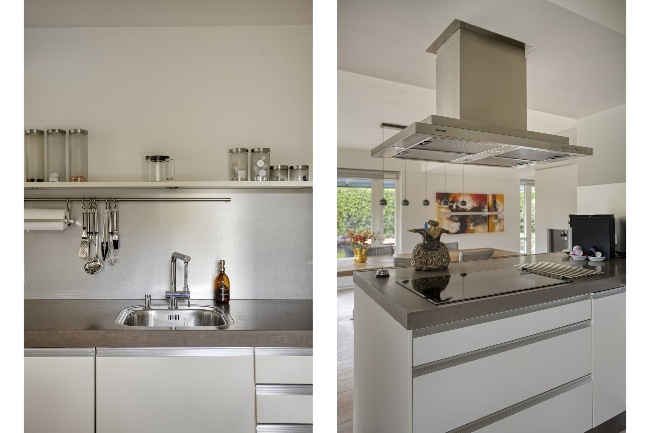 Upon arrival, a spacious hallway opens to oak floors and clean-lined glass doors. The living room and kitchen-diner are divided by a Bellfire double-sided fireplace, anchoring the space with quiet warmth. A luxury kitchen, outfitted with top-grade appliances and a Belgian bluestone worktop, offers both function and ceremony for daily living. The rear façade, defined by expansive glazing, frames the garden’s rhythm and the protected landscape of Egmonderhout beyond.