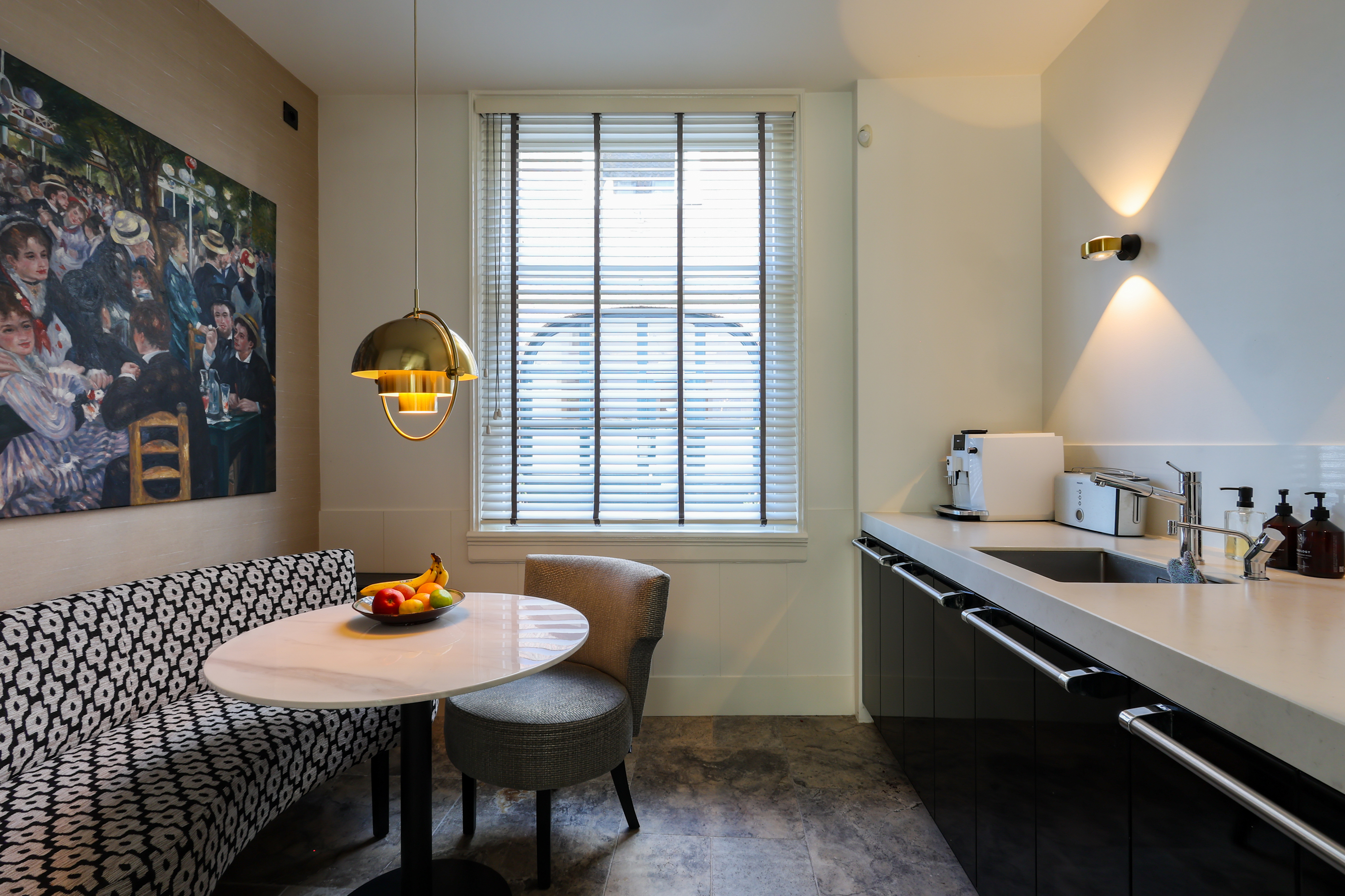 Stepping inside, the atmosphere is defined by light, volume, and original detail. The living room’s open fireplace and traditional windows frame city views, while the Lodder kitchen and breakfast nook overlook the storied avenue. A striking conservatory opens directly to the private garden, where a terrace sits softly above the Zuidsingel canal—cultivating a sense of peace just steps from the city’s rhythm.