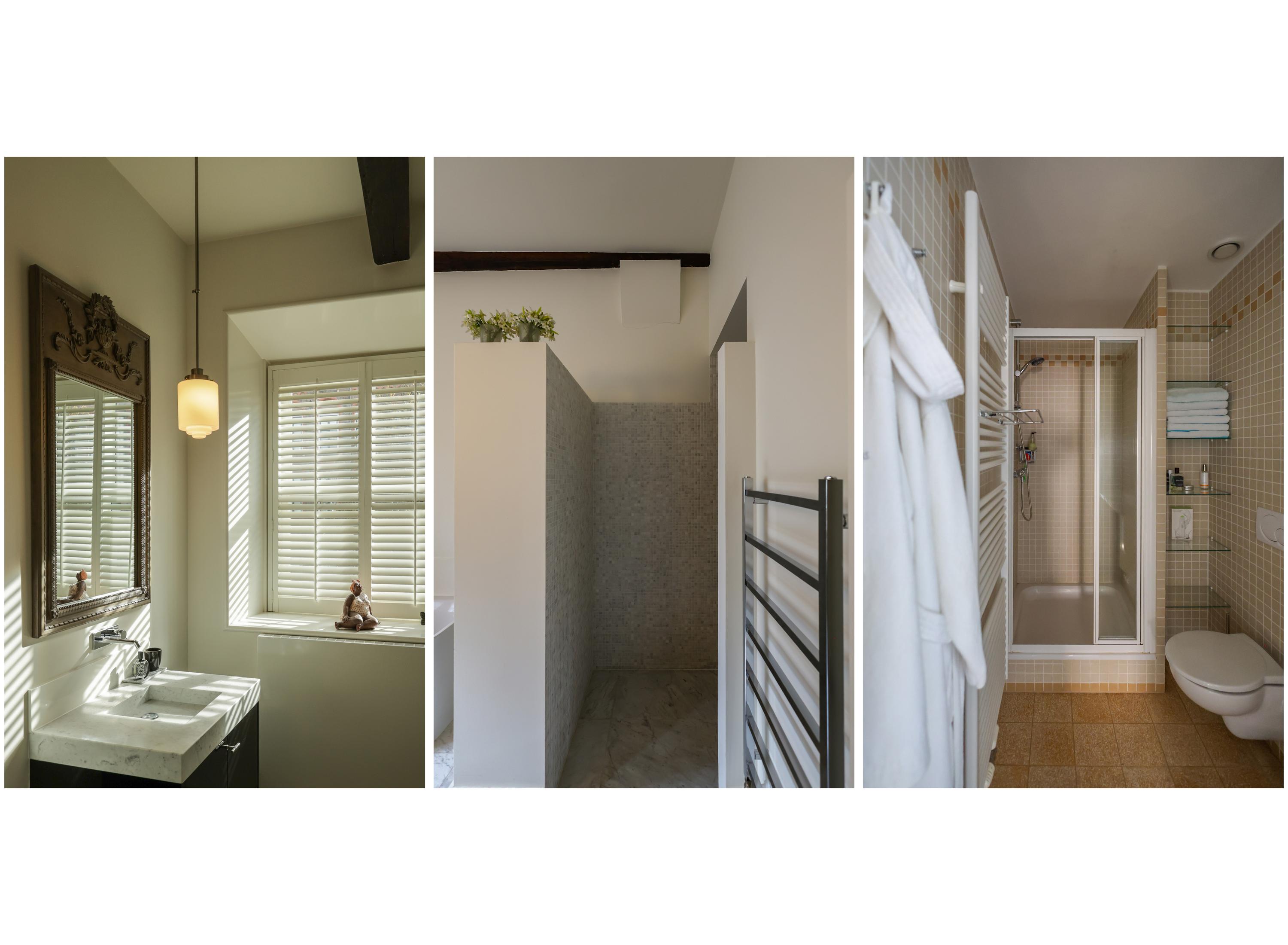 The first floor offers a spacious primary bedroom with a walk-in closet fitted with custom cabinetry, and a modern, stylish bathroom with double sinks, a bathtub, and a walk-in shower. On the landing, you’ll also find a practical laundry room/toilet. The impressive work/play/bedroom, with its exposed section of the old city wall and full-width skylights, is a wonderful space to work, play, or unwind.