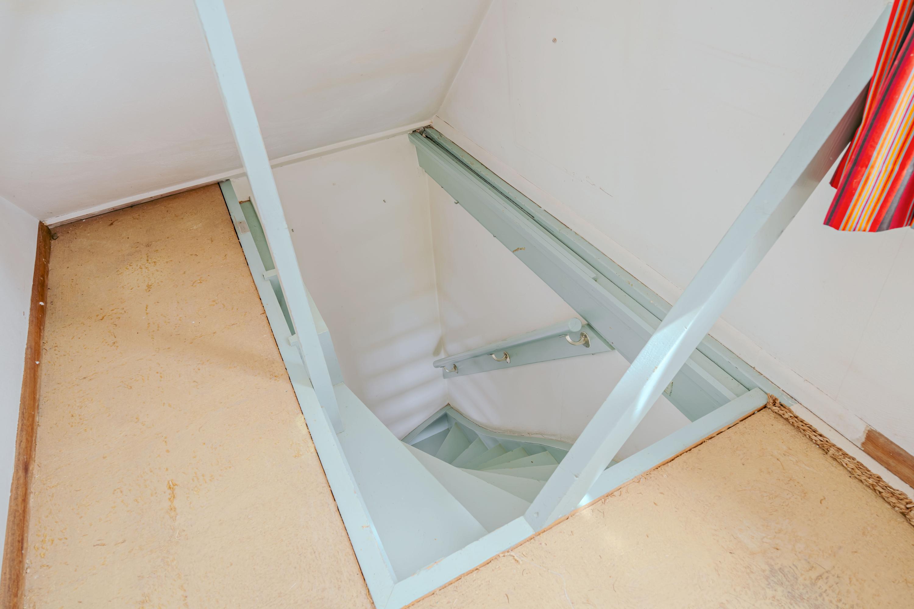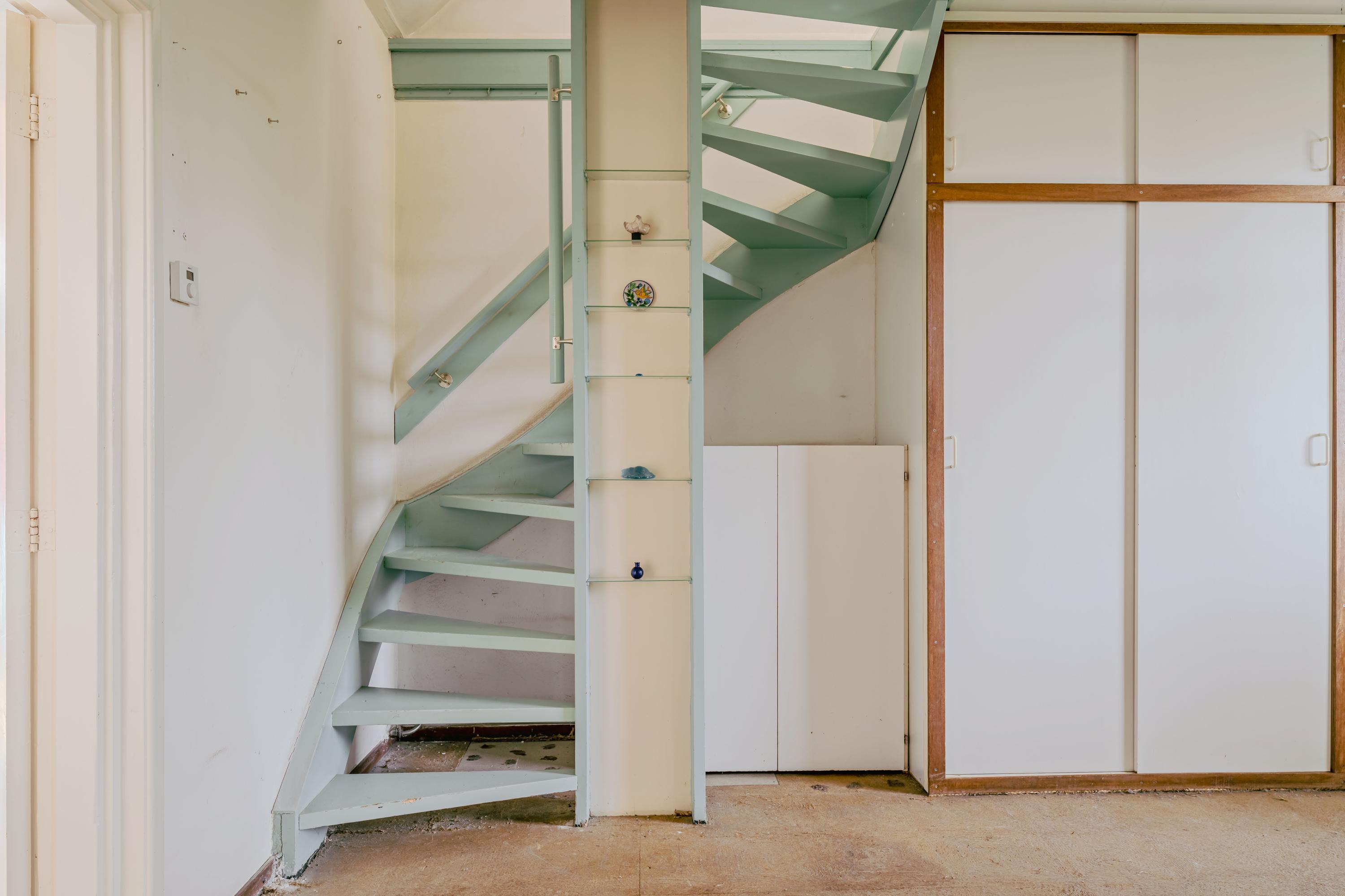 A wooden spiral staircase leads to the first floor, where a landing provides access to a spacious bedroom occupying the entire level. The room offers beautiful views over the River Amstel and the surrounding landscape. Practical storage spaces have been created beneath the sloping roofs. At the front, a window alcove provides a seating area with a view of the river.