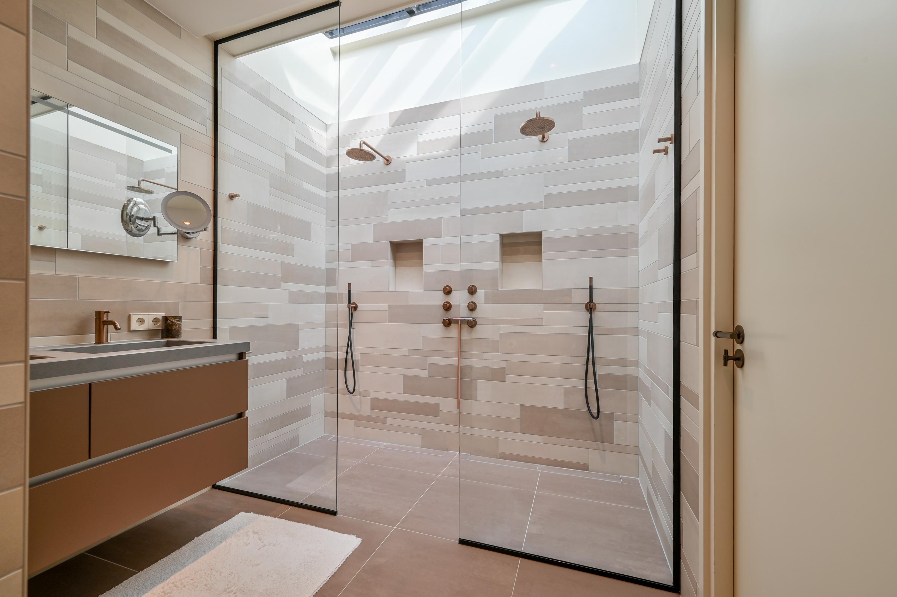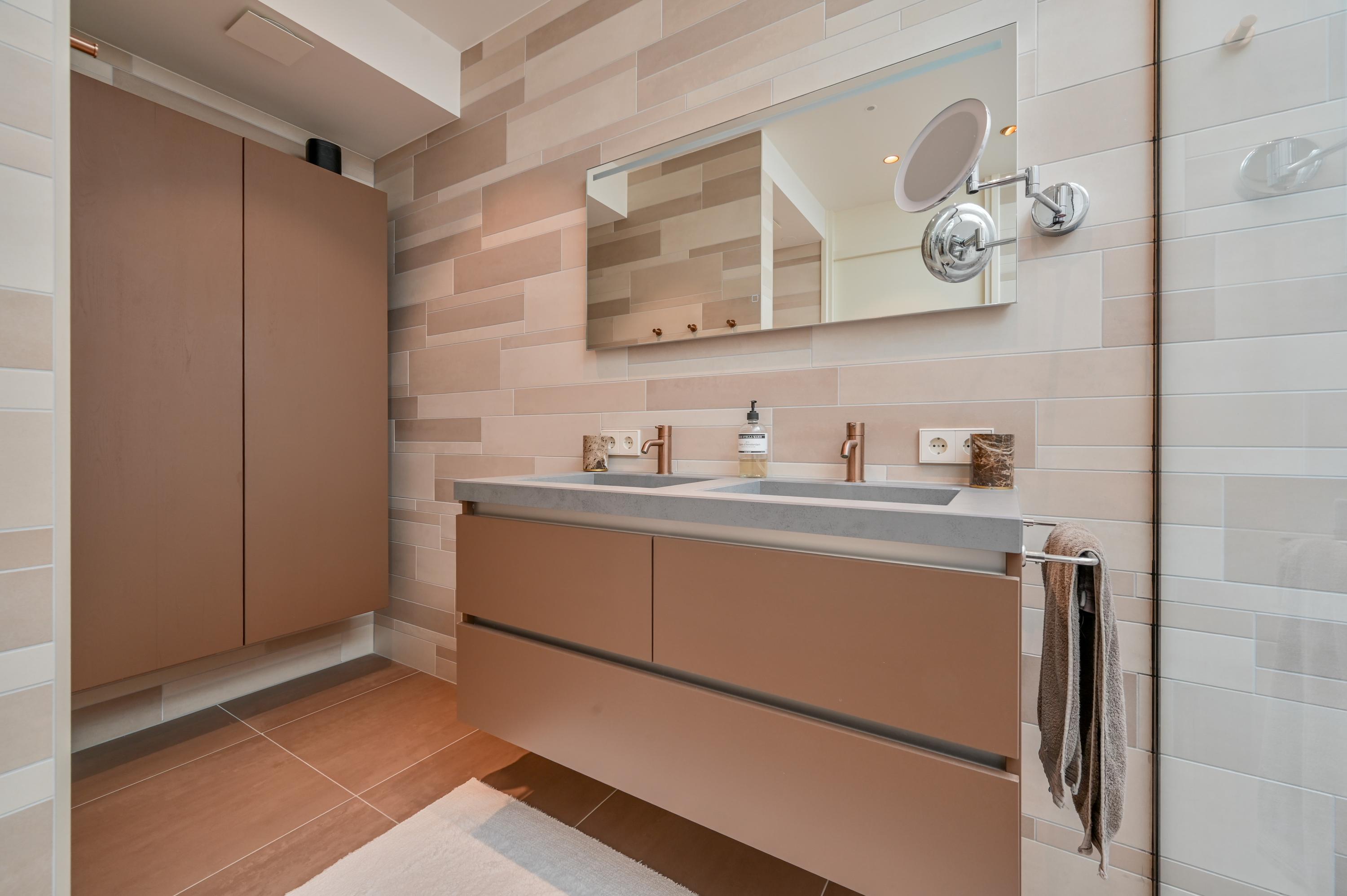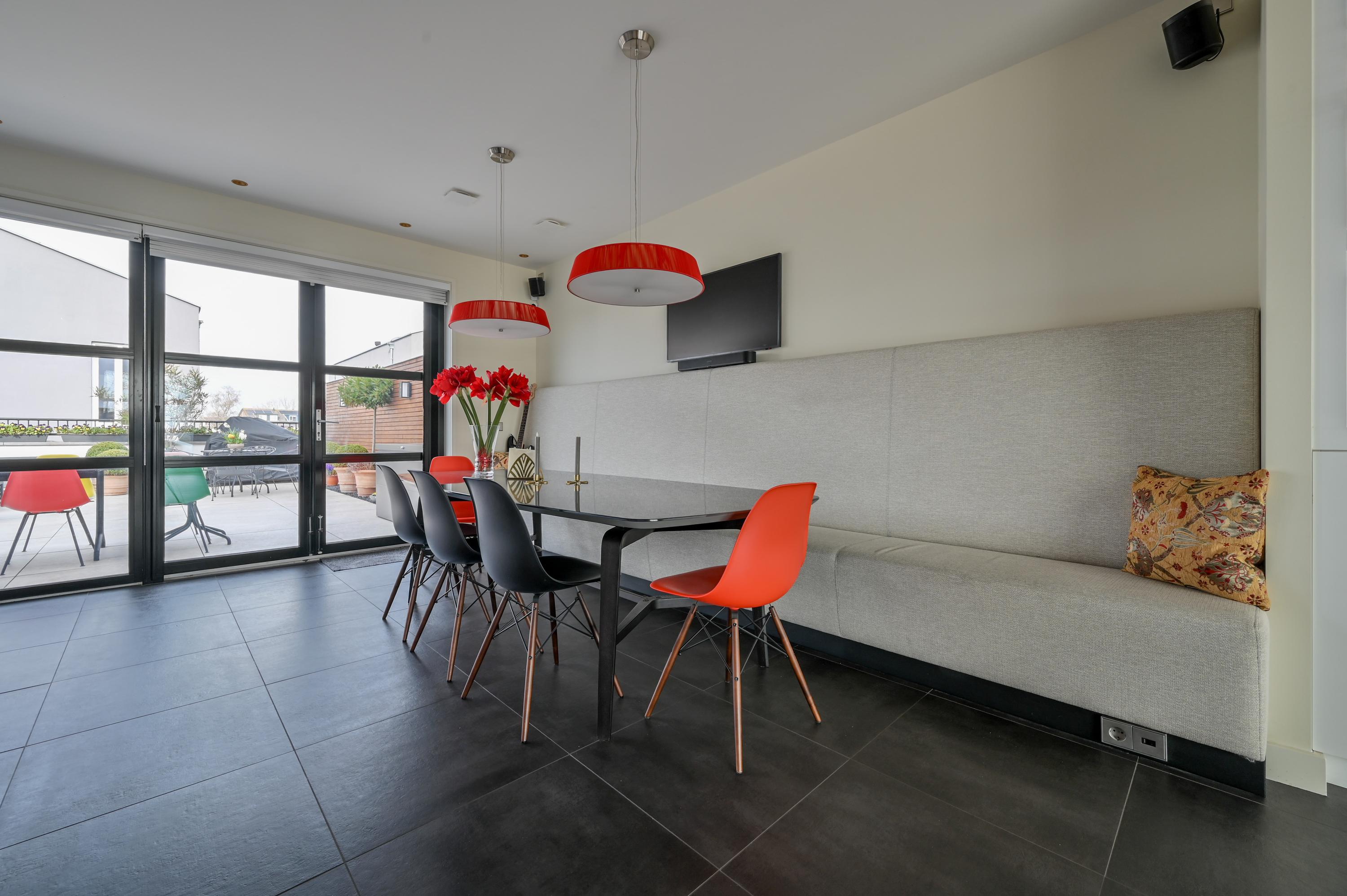 At the rear of the home, you will find the generous and luxurious open-plan kitchen, designed for both cooking and living. The kitchen features a central island with sink, a Quooker, dishwasher, combi ovens, induction hob with extractor, a large LG refrigerator with freezer and ice maker, a Liebherr wine climate cabinet, and extensive storage space. A built-in bench at the large dining table creates a cozy seating area, while double French doors provide access to the spacious terrace garden, where light, space, and tranquility come together.