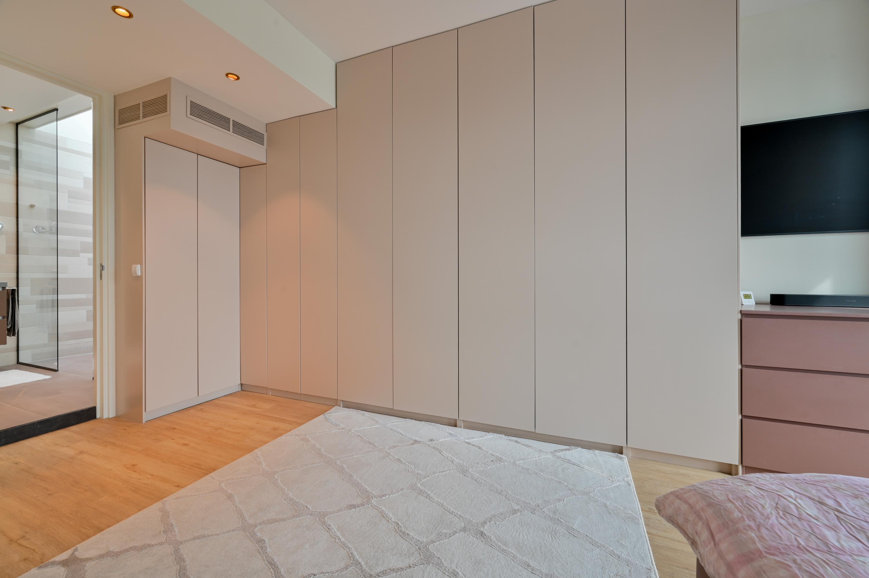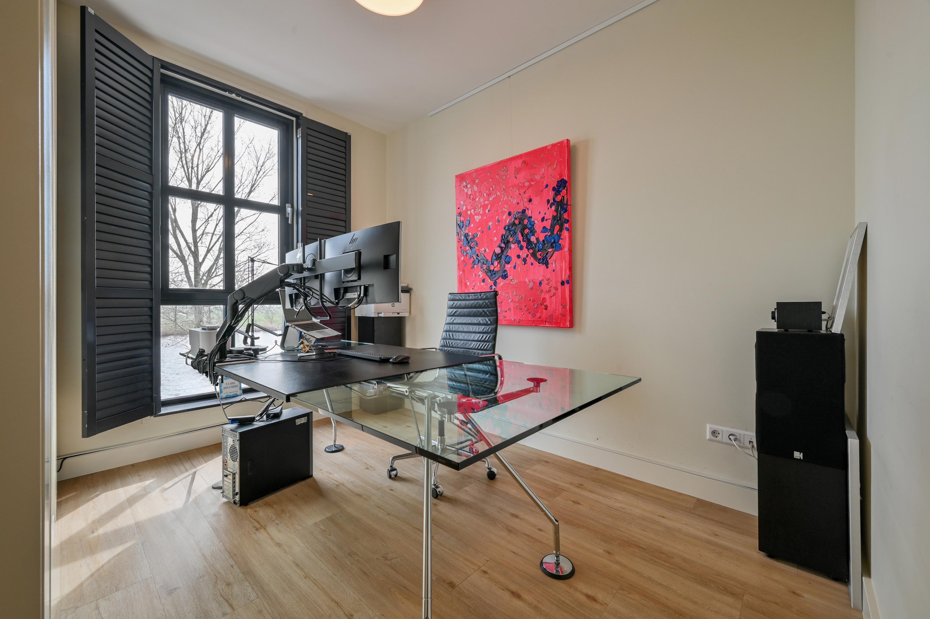 Via the driveway, you reach the front door and the spacious entrance hall, which features a wardrobe, toilet, and staircase to the upper floor. The living room is located at the front of the house and offers breathtaking views over the Amstel. Large windows allow an abundance of natural light to flood in, while the motorized curtains can be operated via an app. Luxaflex Silhouette blinds (motorized, with memory function) are also installed here. The stylish black tiled floor with underfloor heating, built-in dimmable Modular spotlights, and large custom-designed cabinets complete the space.