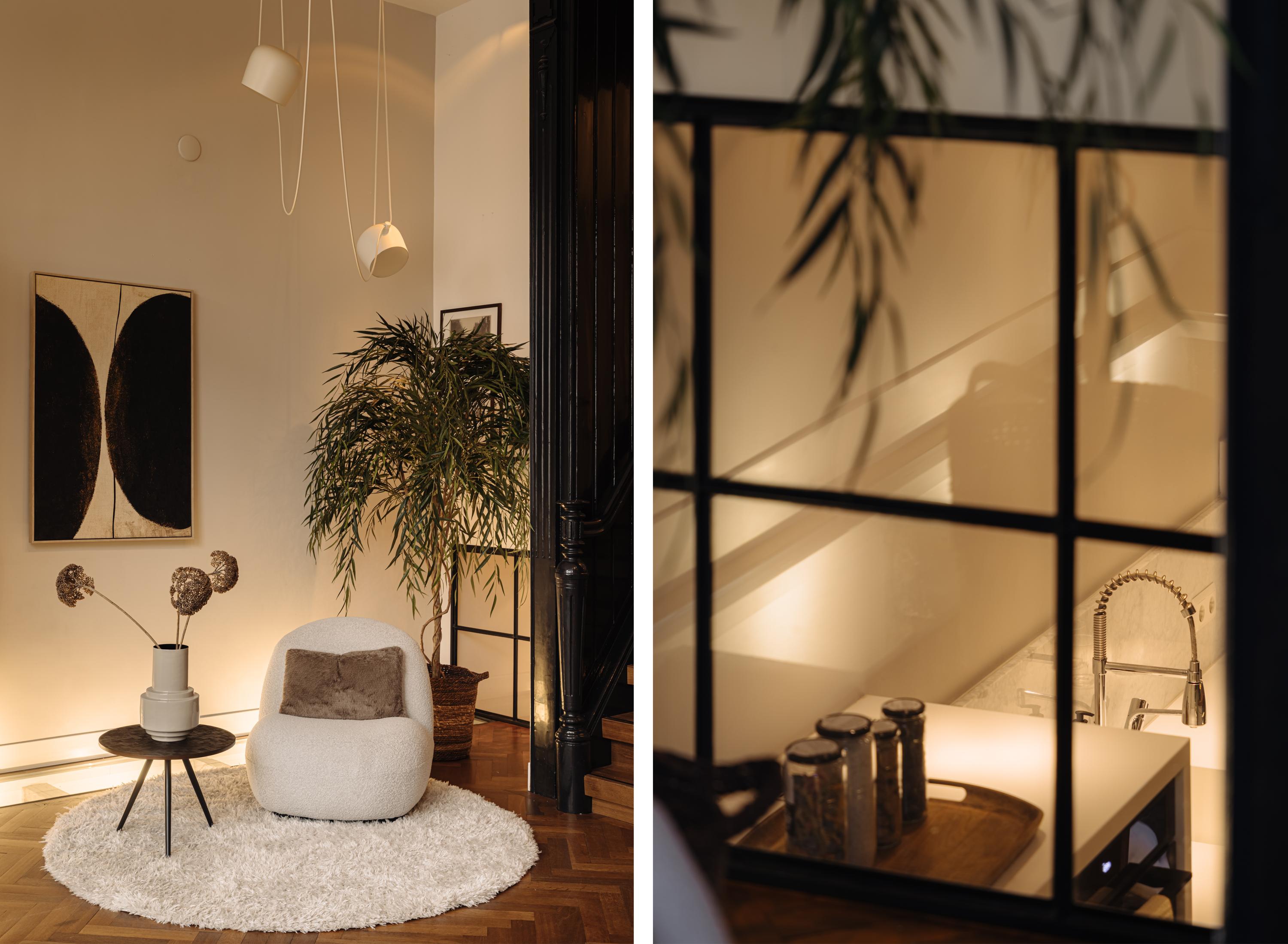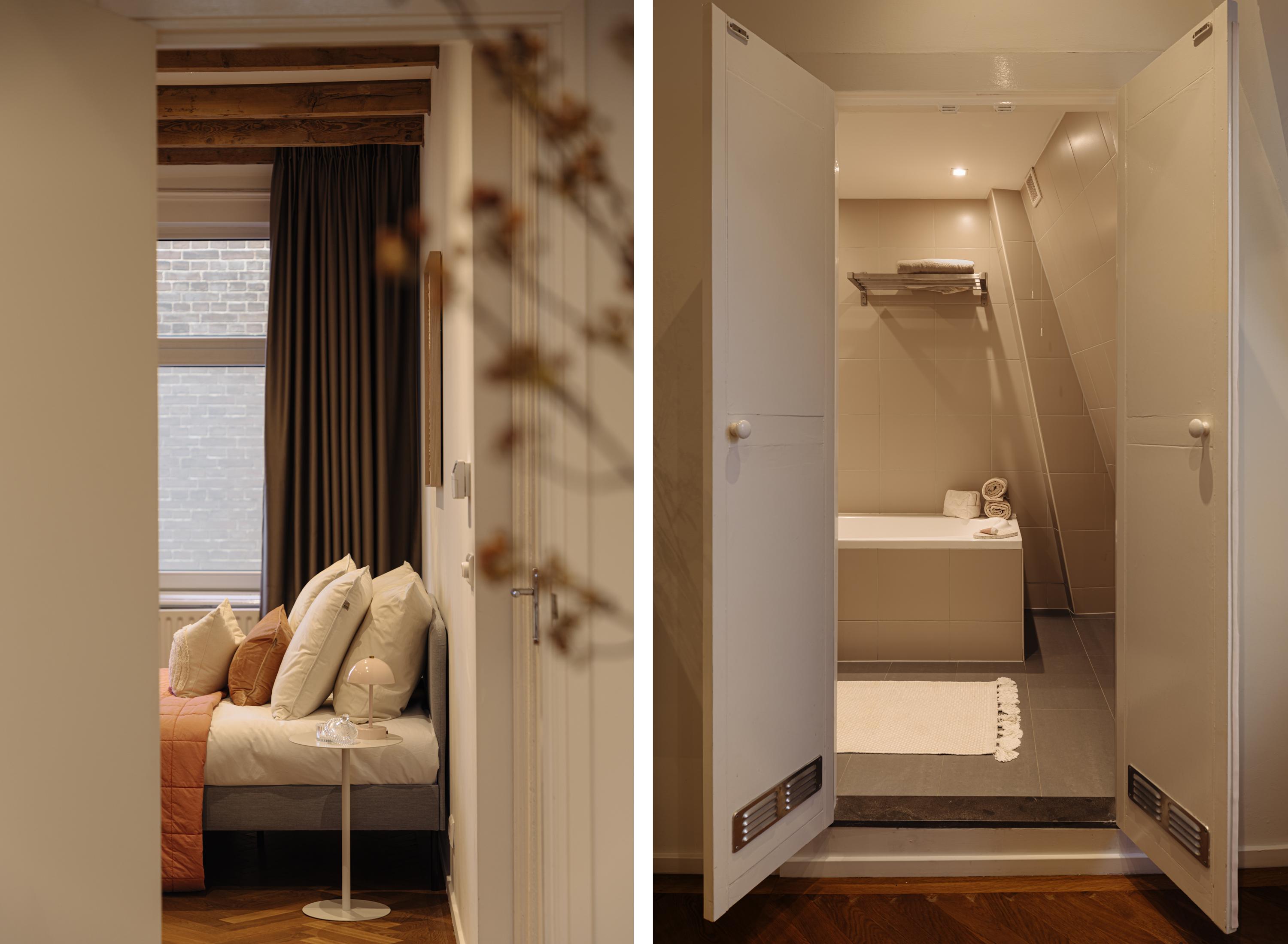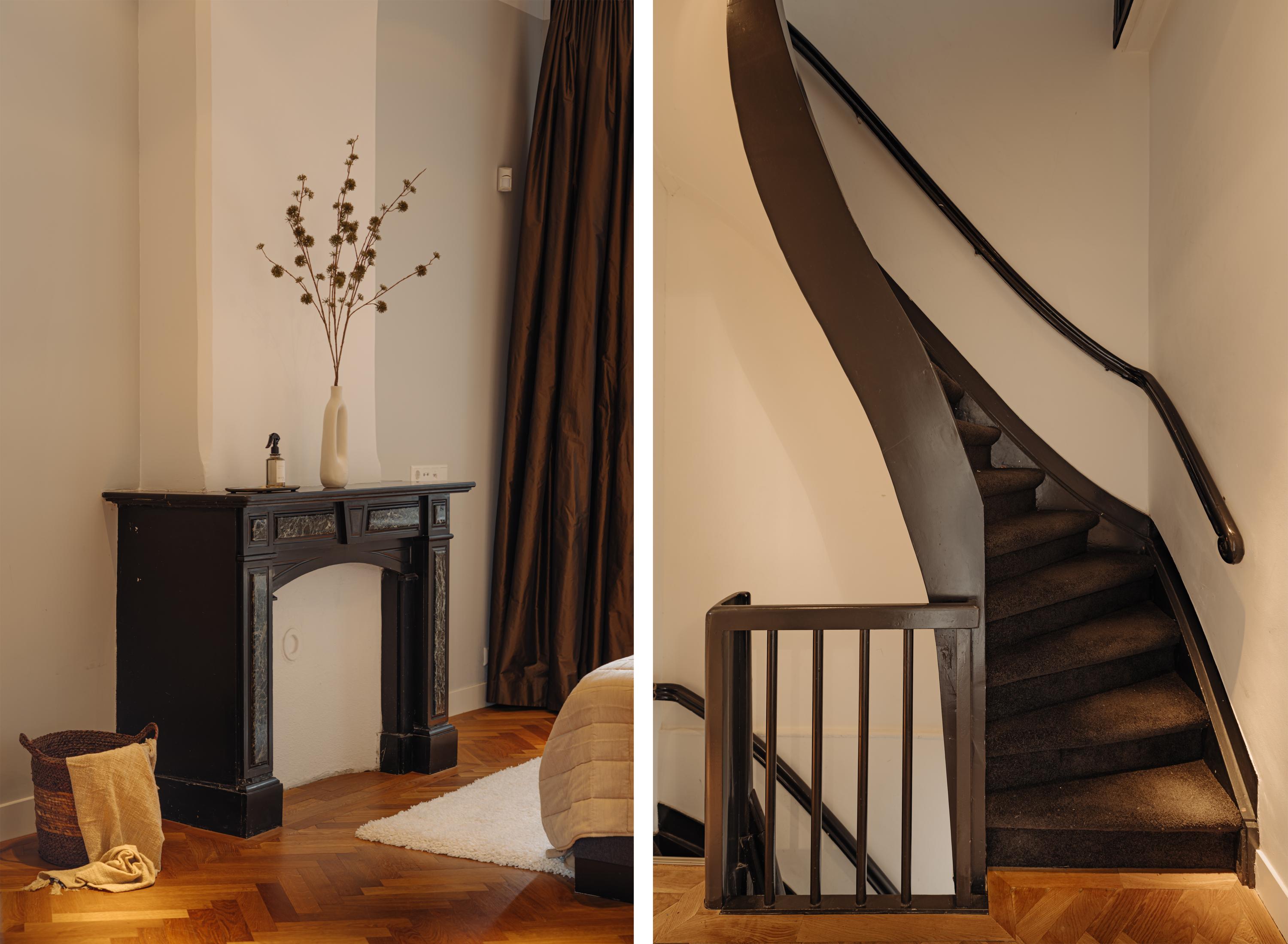 The restored façade references Amsterdam’s architectural heritage, while interiors unfold in a sequence of high-ceilinged rooms with herringbone floors, ornate mantels and luminous French balconies. On the ground floor, an inviting entry transitions to a series of living areas, each enhanced by custom storage and classical details. The souterrain is dedicated to leisure and gathering, with an open kitchen-diner beneath exposed beams, seamlessly connecting indoor spaces to a tranquil patio. Modern amenities such as double glazing and natural ventilation ensure year-round comfort.