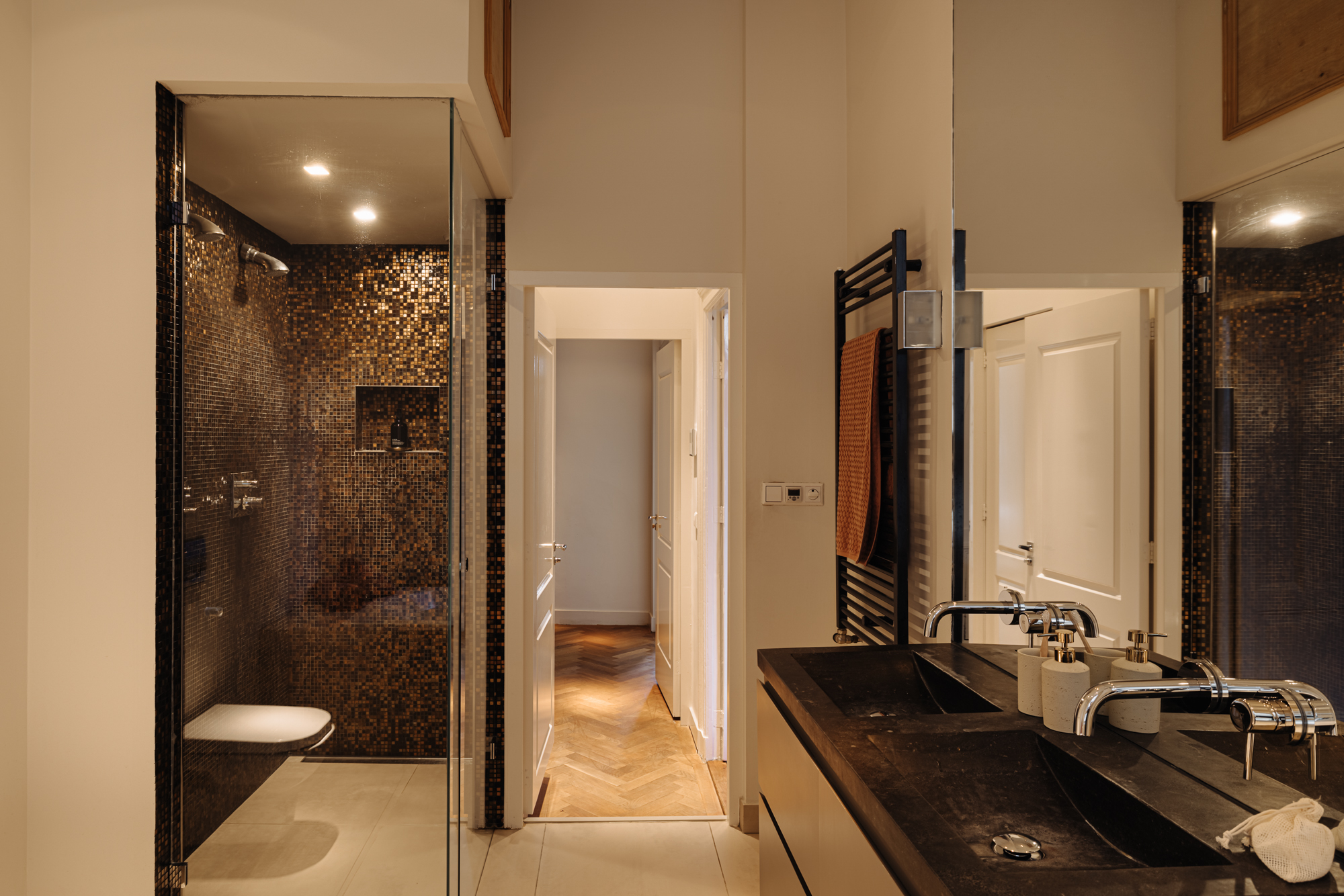Upstairs, sleeping quarters are arranged for solitude and ease, with bespoke cabinetry and integrated lighting in the principal suite. Bathrooms balance natural stone, mosaic, and refined fixtures. The uppermost floor opens directly to a private terrace, suffused by daylight and shielded for quiet contemplation above city life. Parking operates via municipal permit. Located moments from Museumplein’s renowned cultural venues, yet insulated by the district’s calm, the home captures the spirit of Amsterdam Zuid. This luxury townhouse for sale in the Museum Quarter reflects a lifestyle that values art, provenance and the enduring pleasure of thoughtful design.