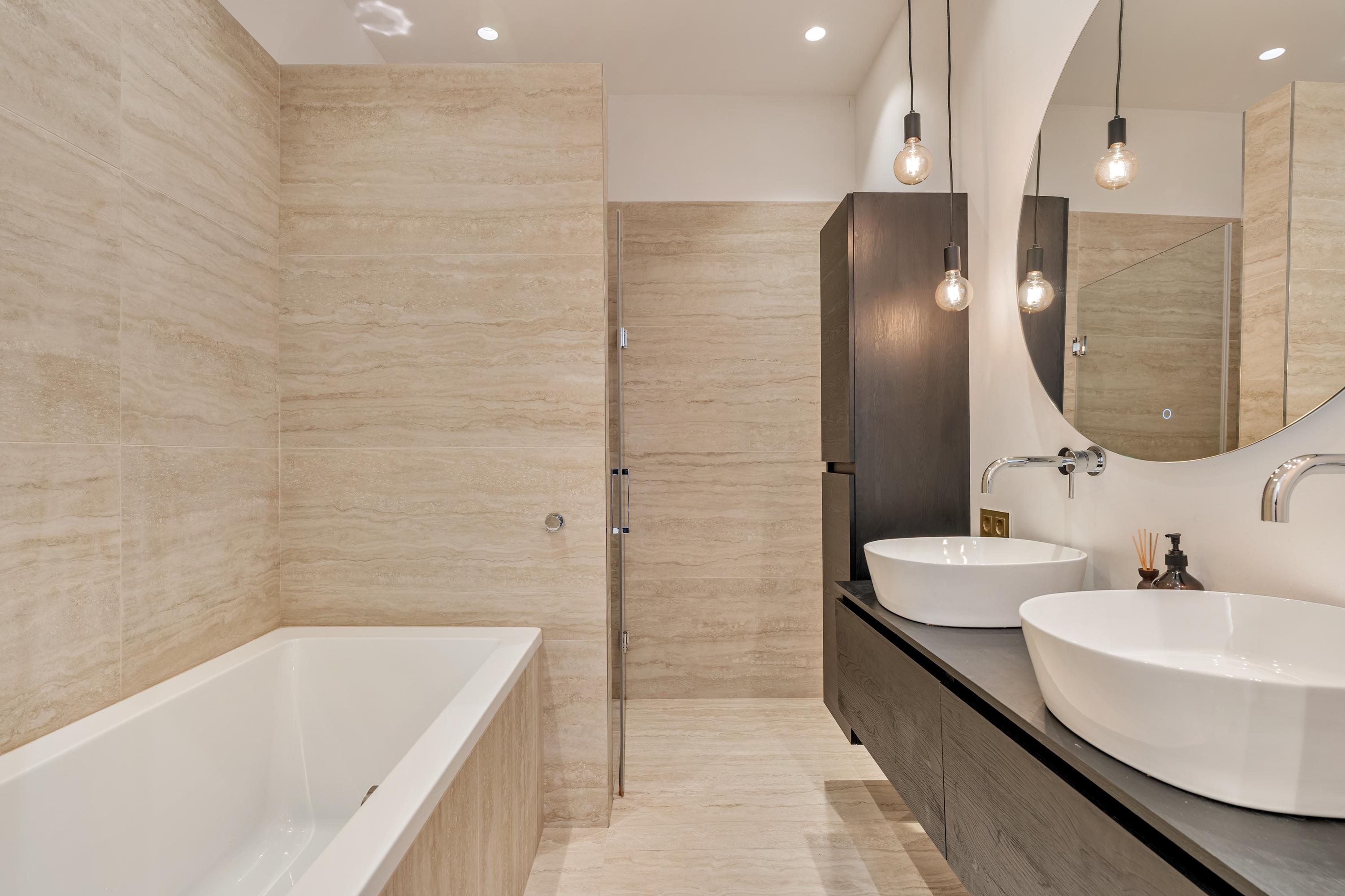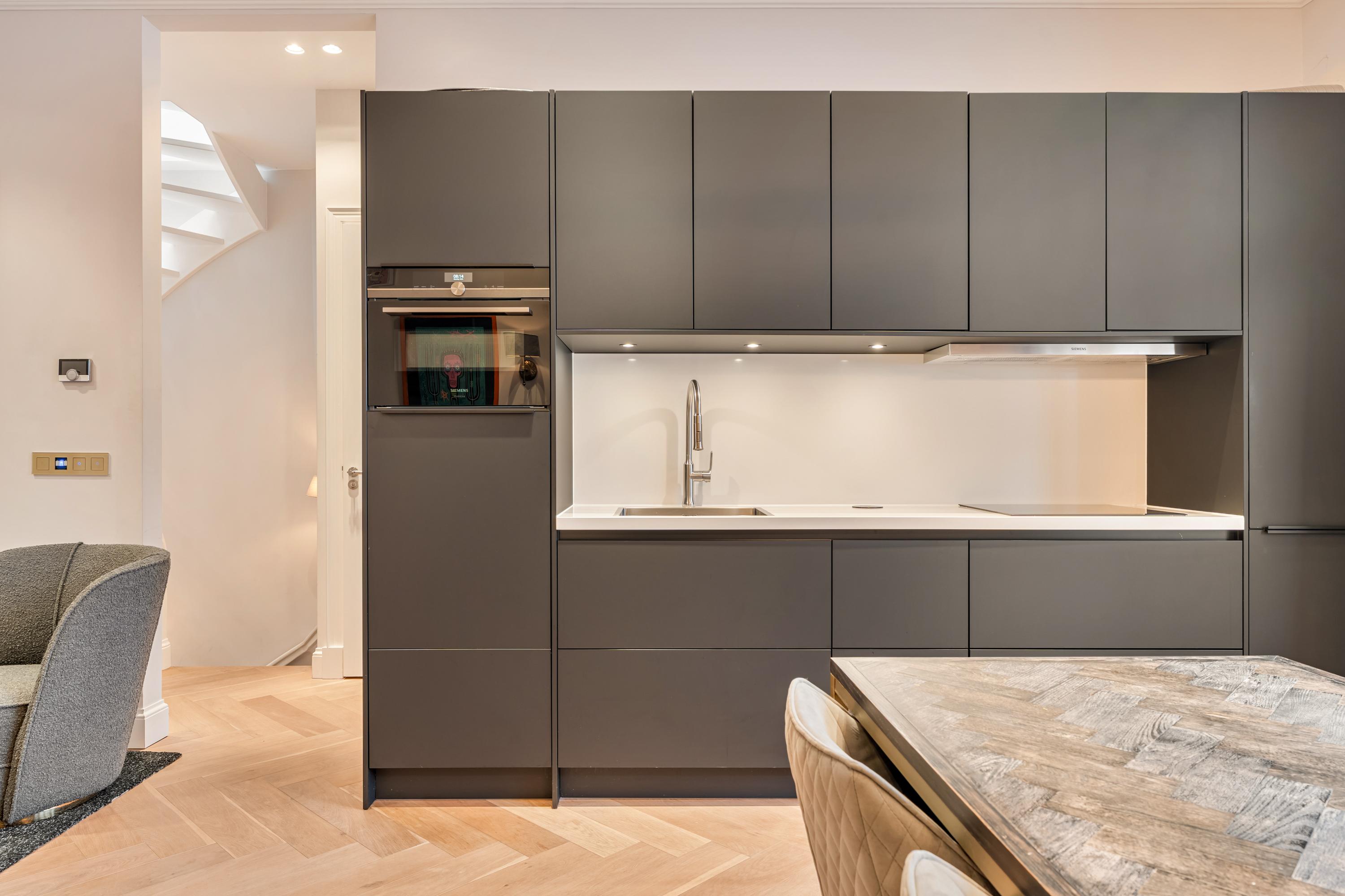 No expense has been spared during the renovation, with high-quality materials used throughout the luxurious finishes. The entire apartment features an oak herringbone floor with underfloor heating and elegant high skirting boards. All rooms are fitted with recessed spotlights, wall lighting, and decorative mouldings.