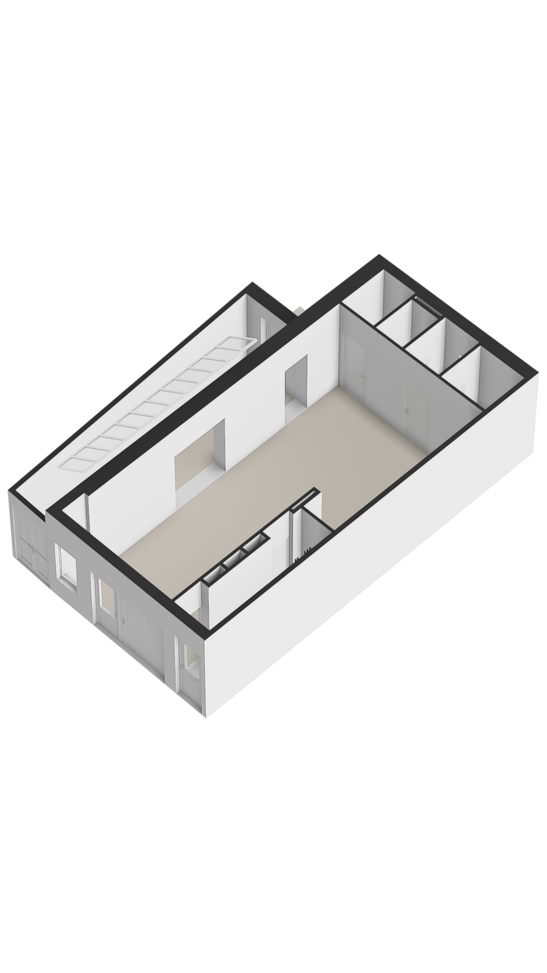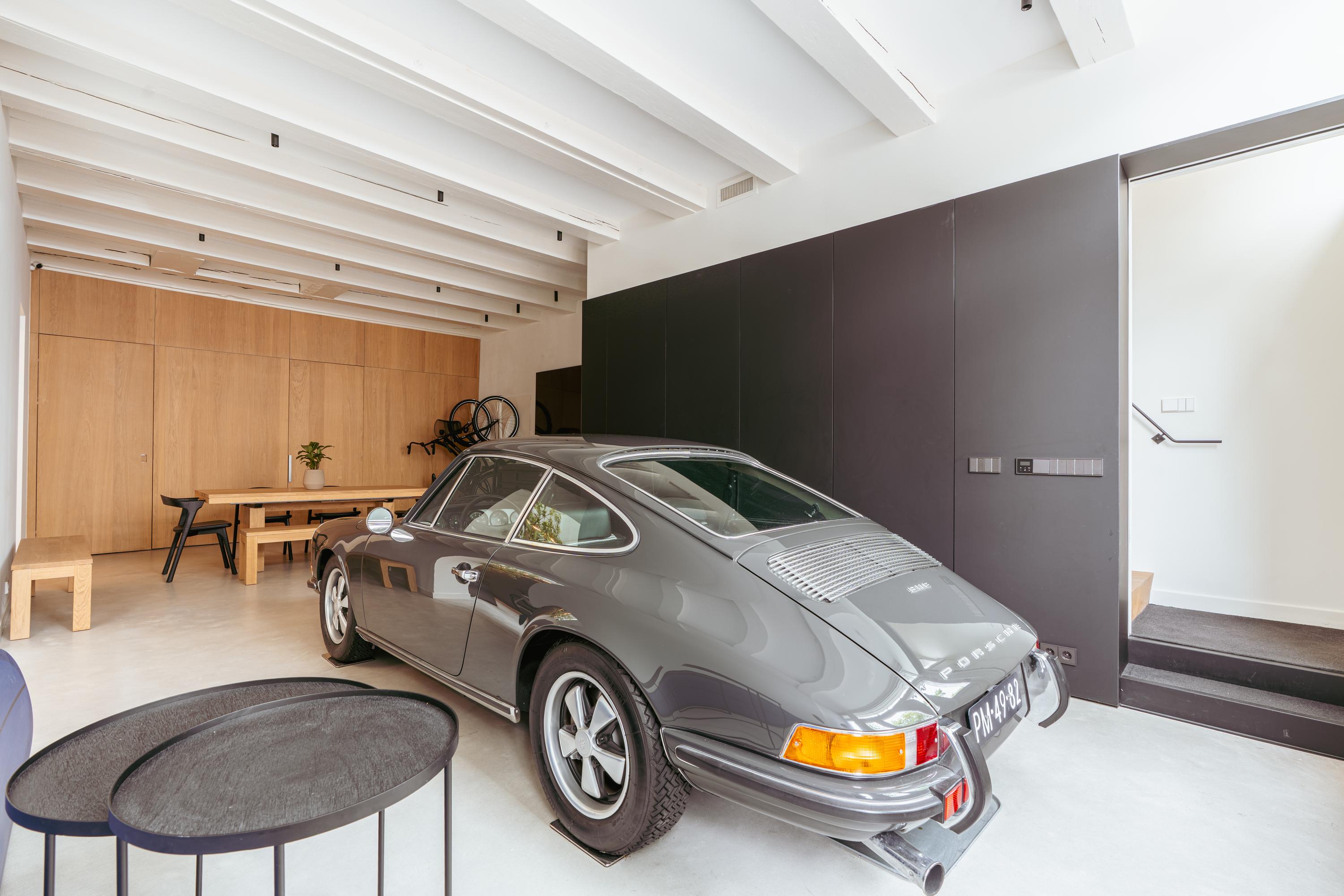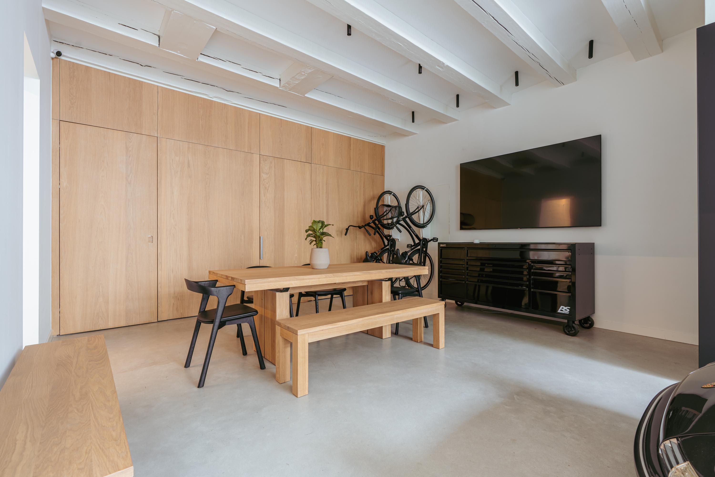The entrance provides access to both the residence and the multifunctional commercial space on the ground floor. This space is finished with great attention to detail, exuding character through wooden elements, exposed ceiling beams, and high-quality materials. Large double doors at the front can be fully opened, creating an inviting look and allowing for ample natural light. Inside, the space is practical yet stylishly arranged. A compact but luxuriously finished kitchenette, a neat toilet, and a separate laundry and technical room complete this floor. A large skylight at the rear brings in abundant daylight, adding to the open and airy feel. Rear access to a private outdoor space is available, as well as a second entrance directly from the street — providing flexibility for use as a studio, home office, or practice space.