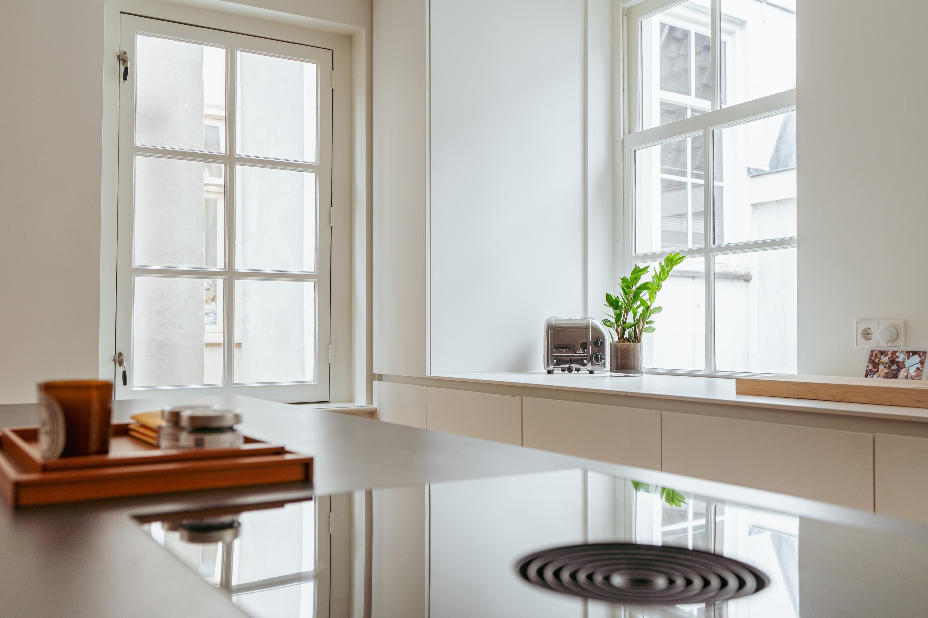 This floor is entirely dedicated to living and entertaining. At the rear is the modern kitchen — the heart of the home. It includes high-end built-in appliances: fridge, freezer, combi oven and microwave, Quooker tap, and a sleek induction cooktop with integrated extractor fan. Ample storage keeps the space minimalist and tidy. The centrally placed island includes a bar area for informal dining. At the front is the living area, where large windows offer a sweeping view over the canal. The combination of natural light, warm wooden floors, and subtle finishes create a calm, inviting ambiance. French doors open to a hallway with a separate toilet, and a staircase leads to the third floor.
