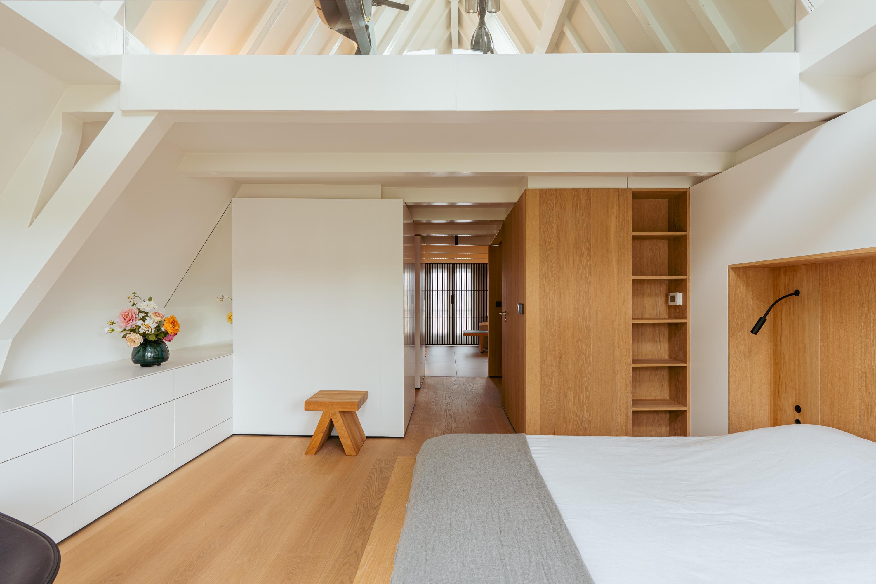 This upper floor is dedicated to a luxurious master suite — a private sanctuary of peace, space, and comfort. A central walk-in closet features custom cabinetry that is both functional and stylish. At the front is the cozy bedroom, where original ceiling beams and impressive ceiling height immediately draw the eye. Tall windows extending into the gable enhance the sense of openness and bring in wonderful natural light. Built-in wardrobes contribute to the clean, elegant look. At the rear lies the spectacular bathroom — a true wellness retreat at home. Here you’ll find a striking freestanding Agape Spoon Woodline bathtub, a double vanity with stylish cabinetry, a spacious walk-in shower, a steam cabin, and a built-in recliner for ultimate relaxation. The space is finished with warm materials and thoughtful design elements, including integrated lighting for a hotel-like atmosphere. Beautiful wooden sliding panels provide both shading and aesthetic appeal, offering privacy without blocking light. The toilet is separate from the bathroom.