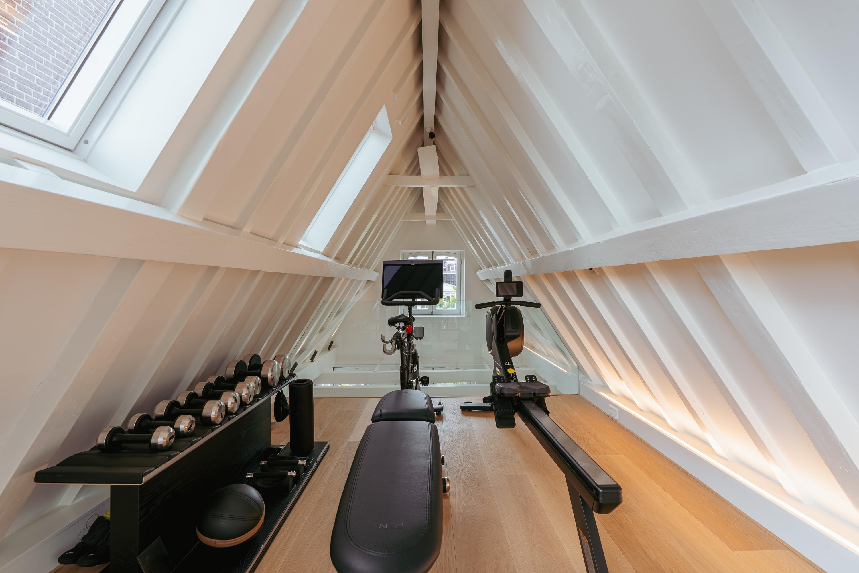 Located in the roof, this top floor is currently used as a gym. Thanks to the open mezzanine, there’s a visual connection with the master bedroom below, contributing to a feeling of space and cohesion. The sloped rooflines add character, while generous ceiling height and large windows ensure a bright and pleasant ambiance. This is a flexible space, easily converted into an office, creative studio, additional bedroom, or relaxation area. French doors at the rear lead to a quiet and private balcony, a peaceful spot to unwind and enjoy the sun in the heart of the city.
