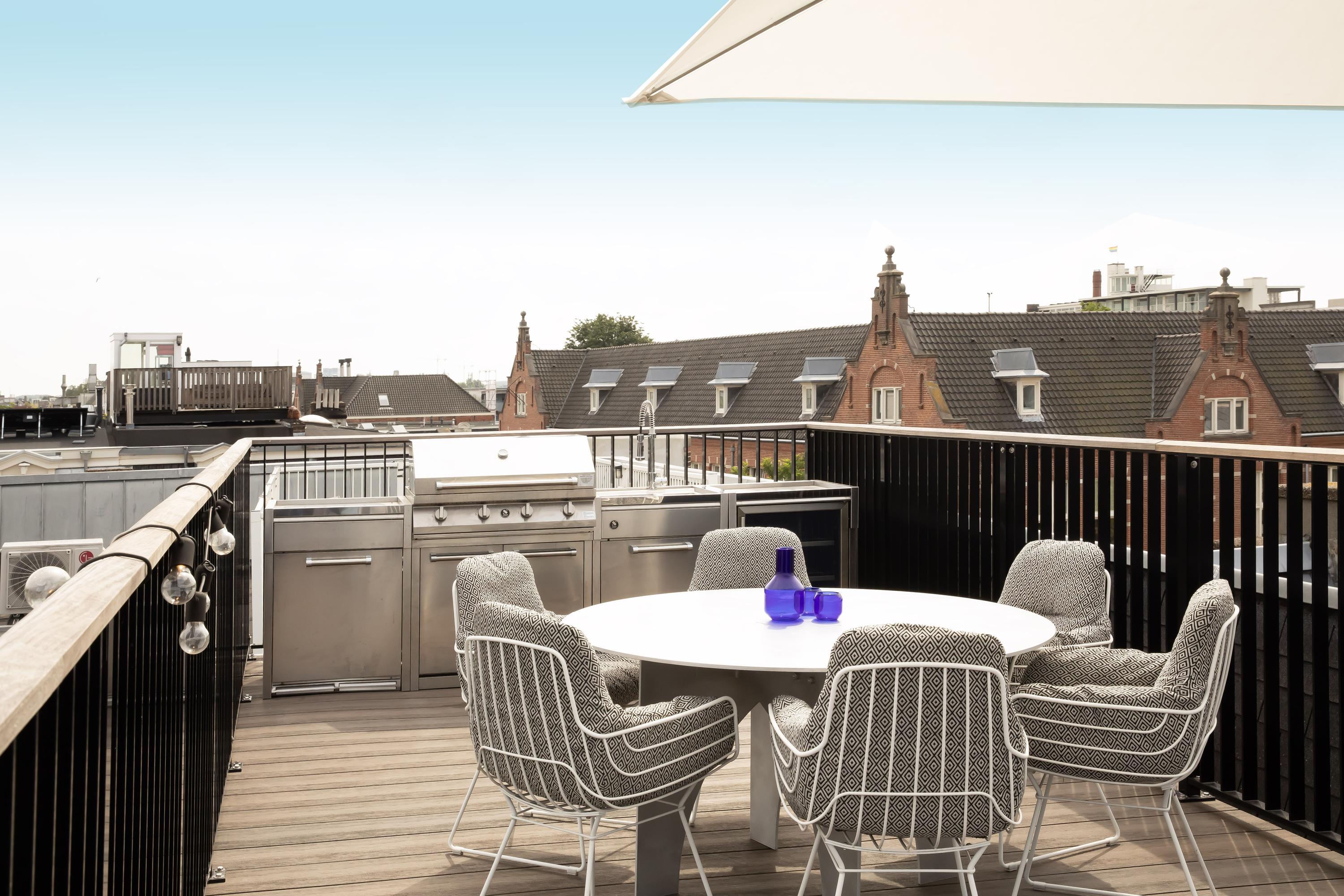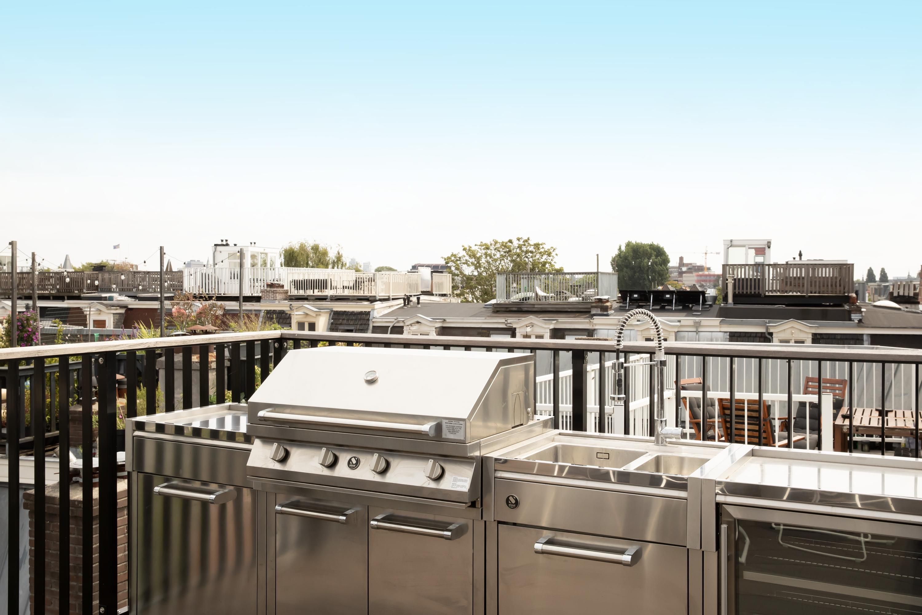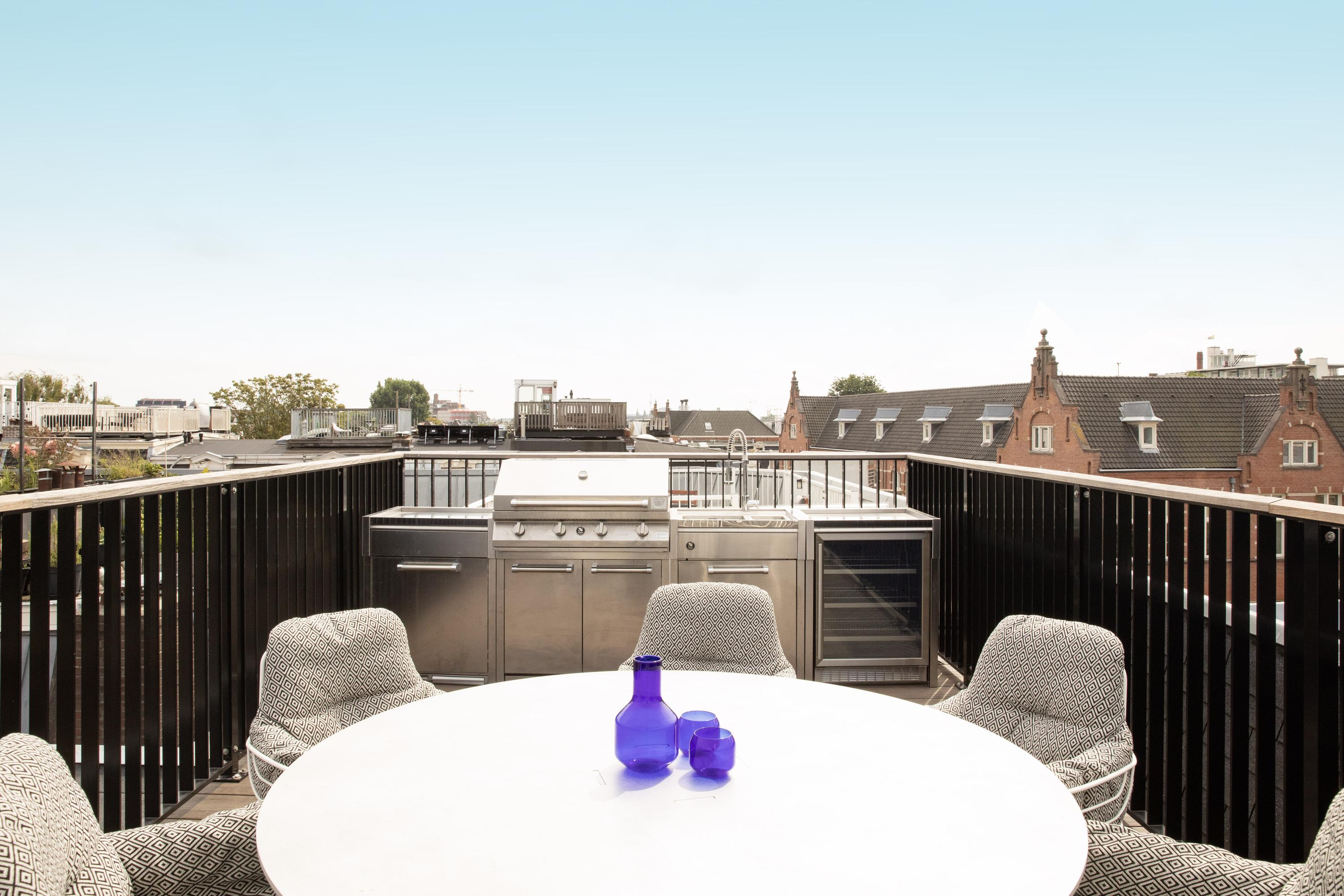 The absolute highlight of this property is the expansive roof terrace, offering a stunning panoramic view of the city. Here you can enjoy the sun until late in the evening. The terrace is equipped with a luxurious outdoor kitchen with grill, sink, ice machine, and wine cooler – the perfect setting for relaxing evenings and atmospheric dinners.