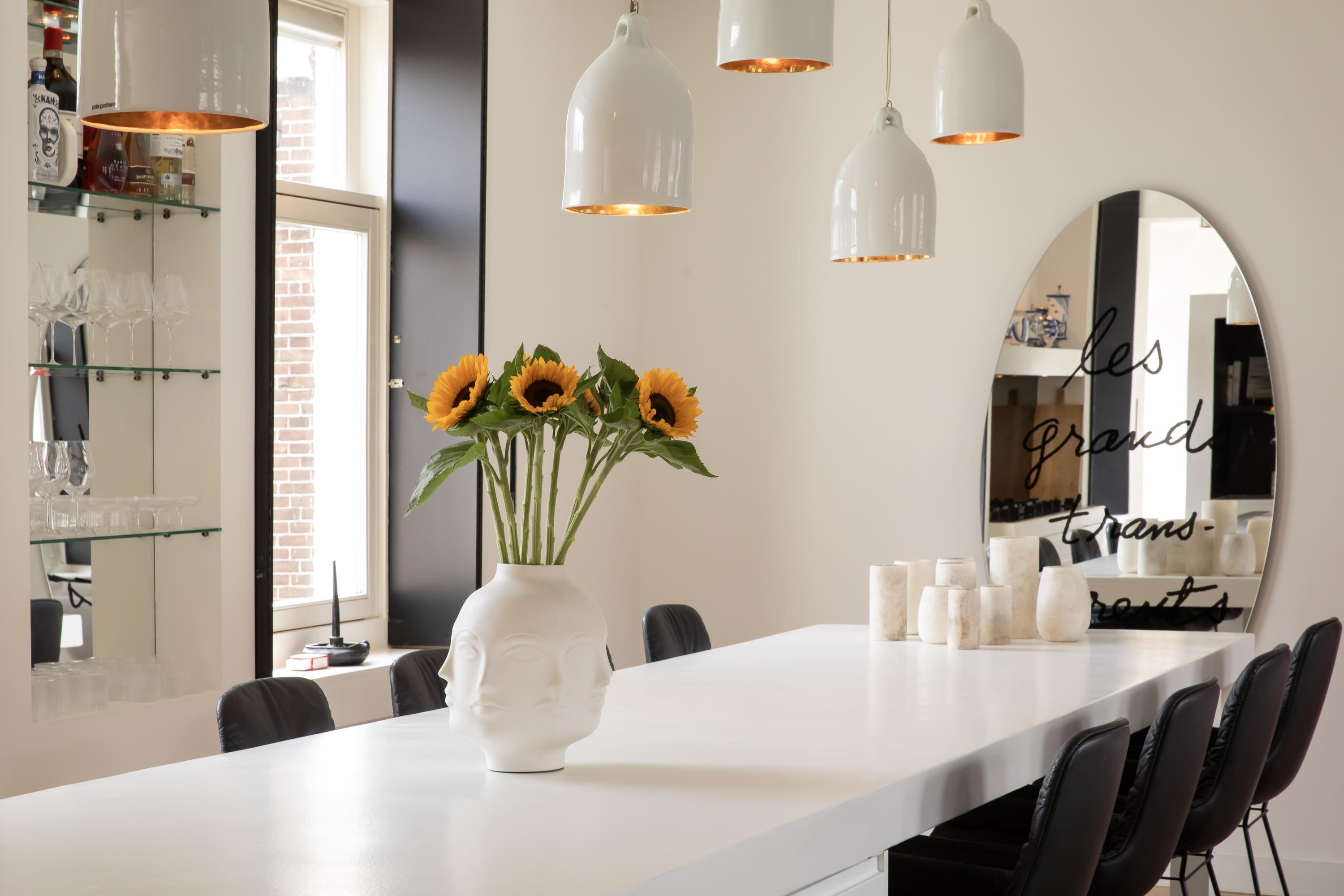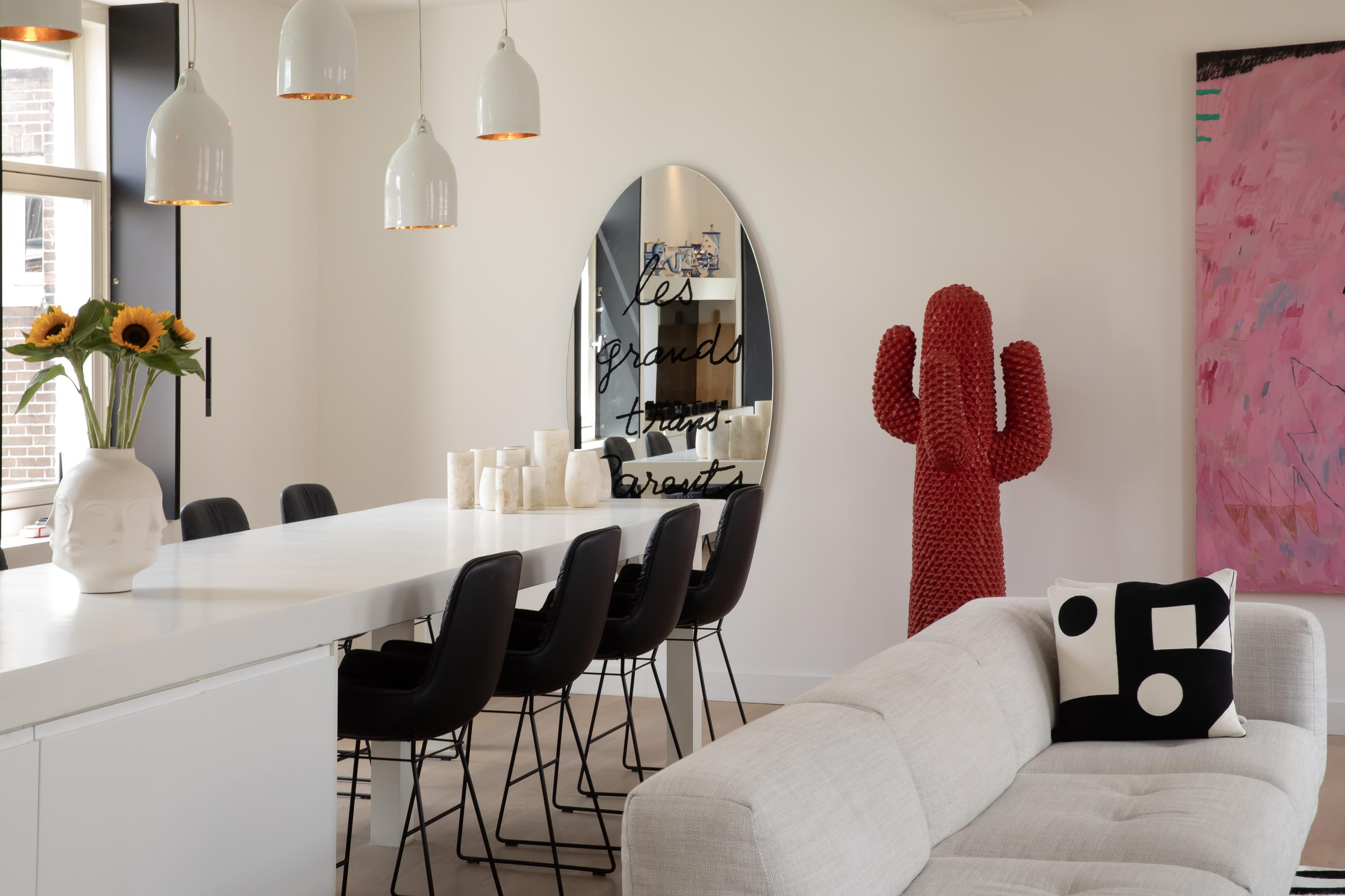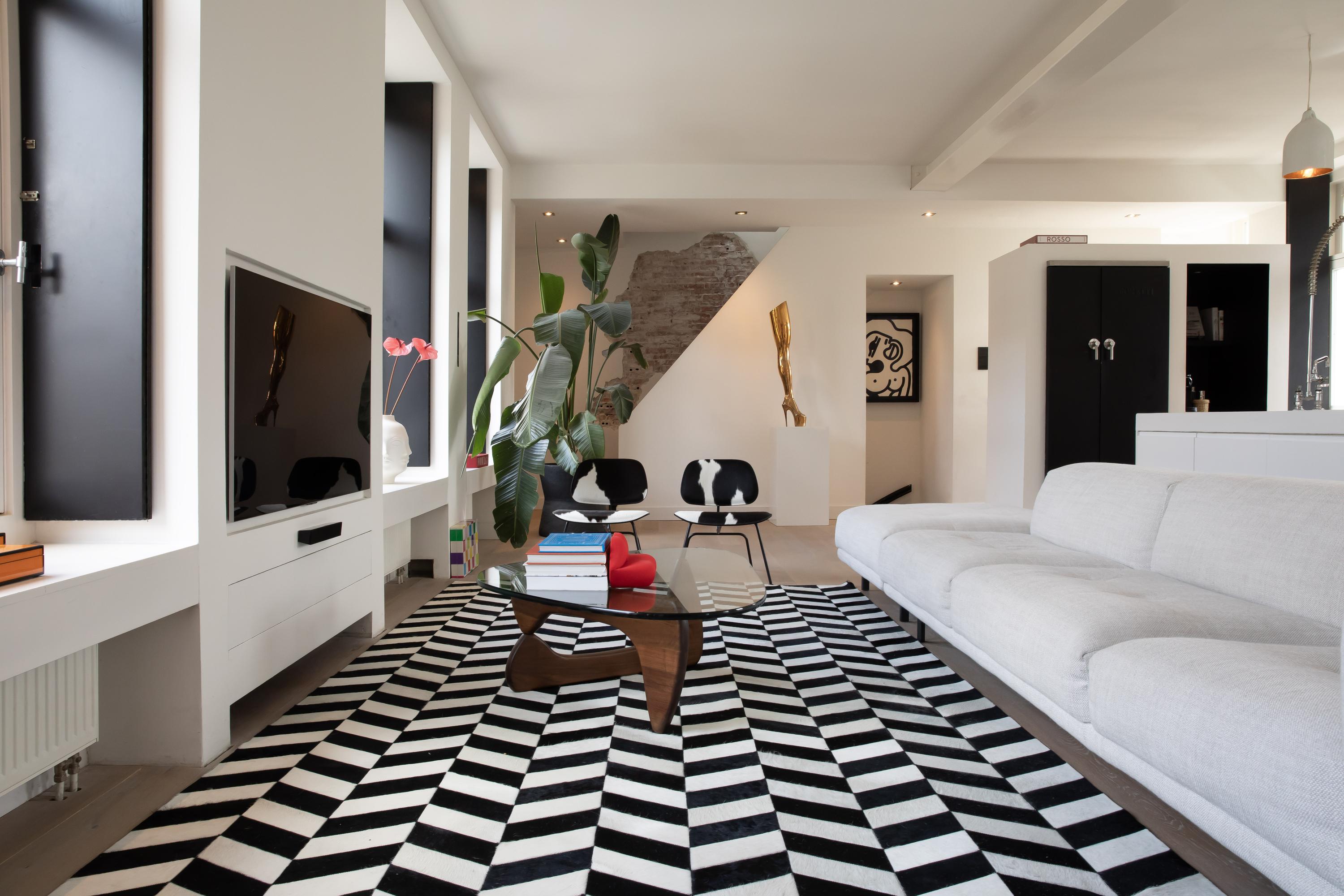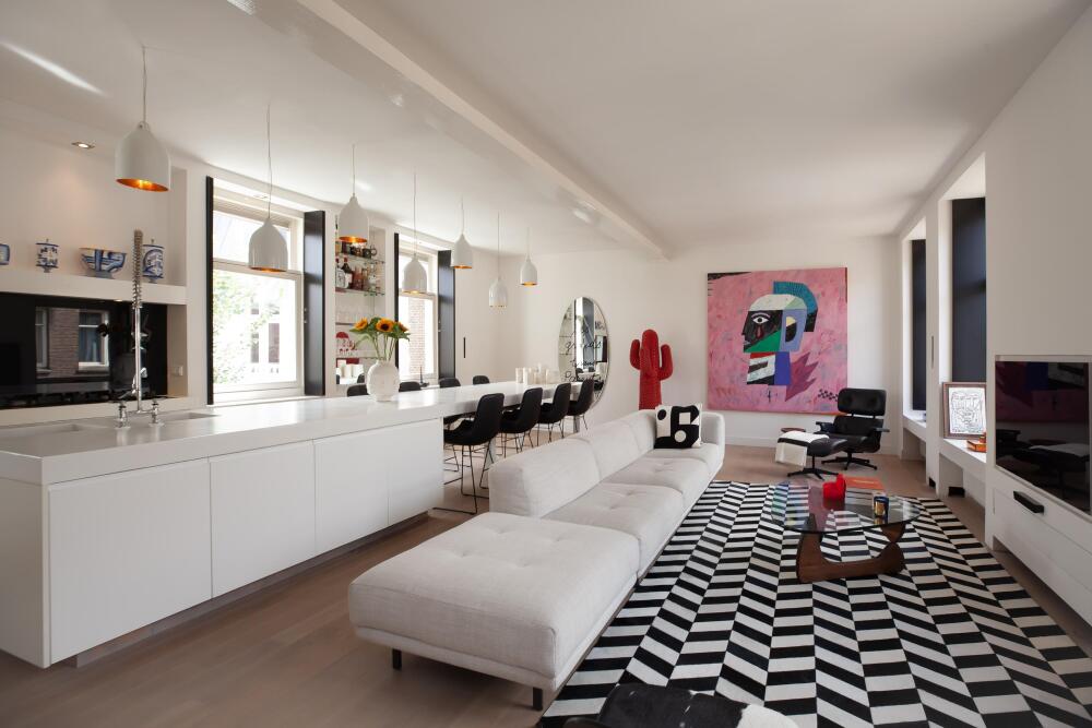 The staircase leads directly into the spacious open-plan living room on the third floor. The room is extra wide and features no fewer than four windows – double the amount typically found in Amsterdam – allowing abundant natural light to flow in.