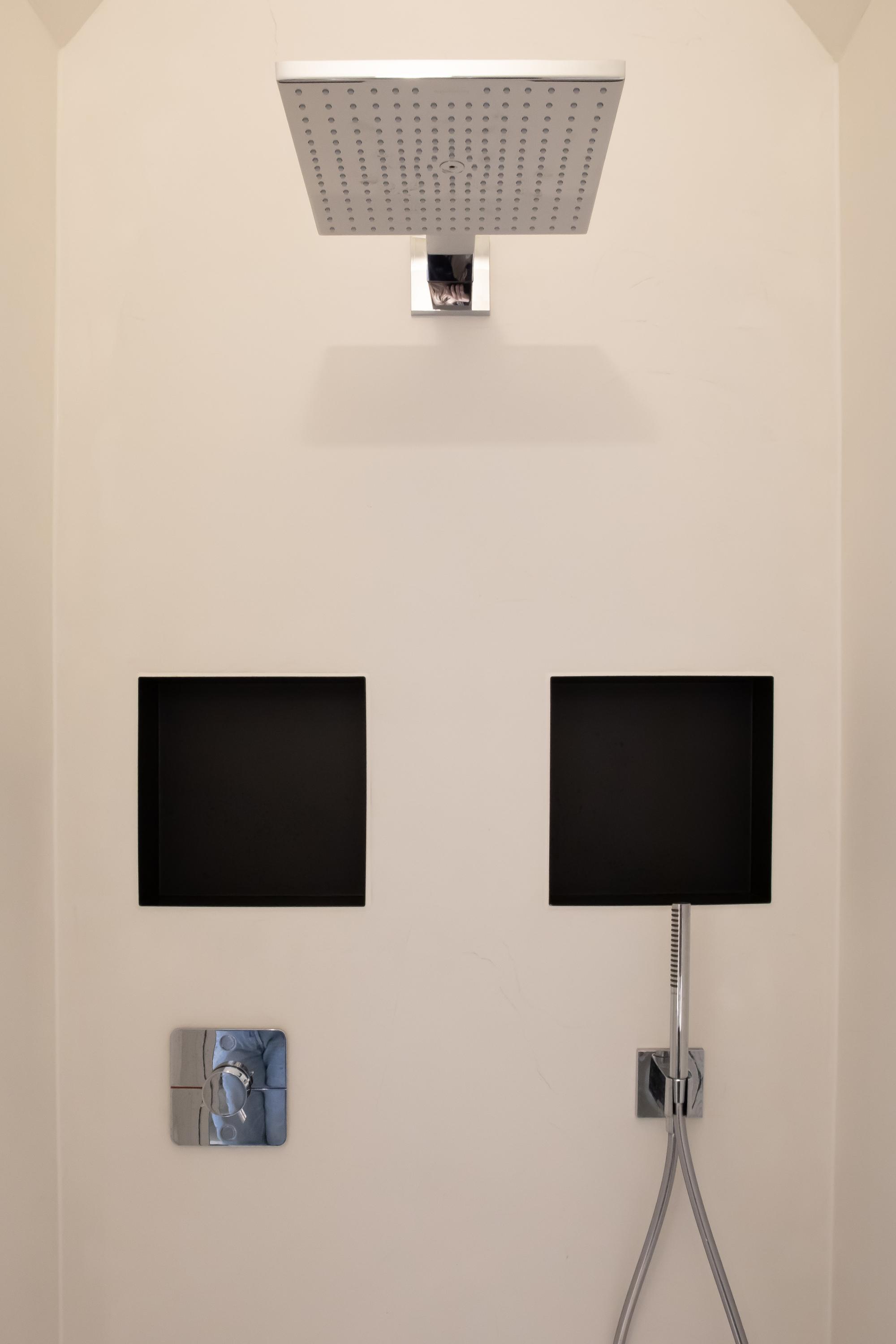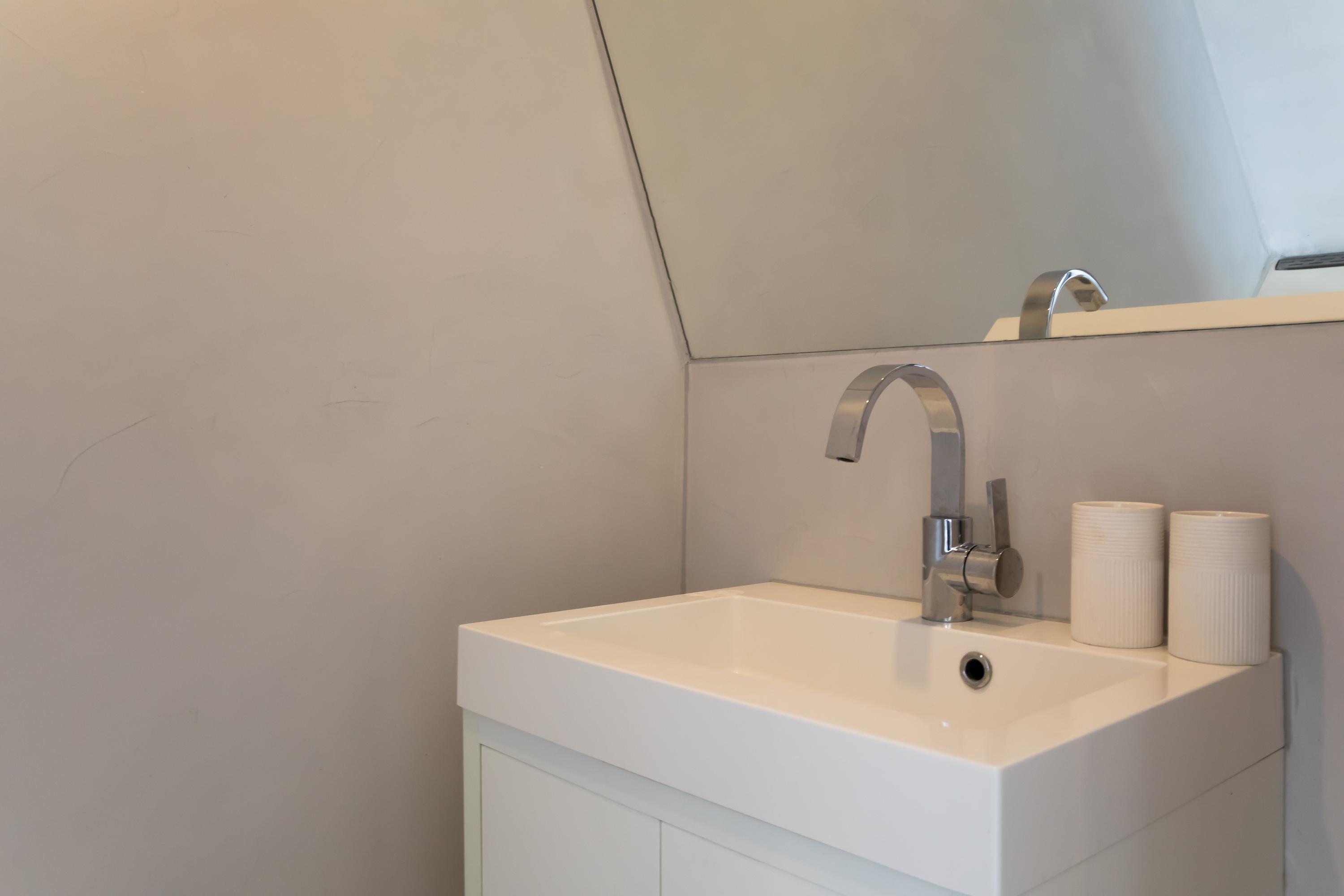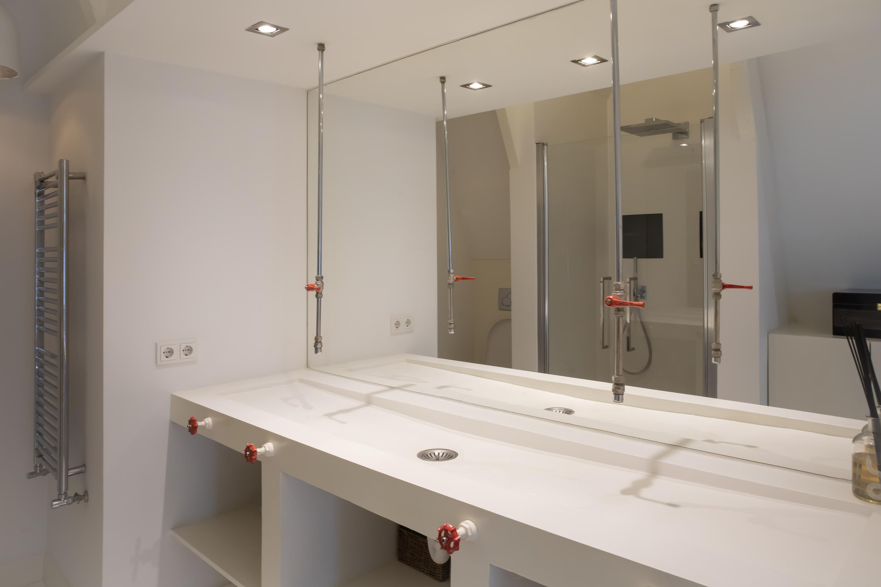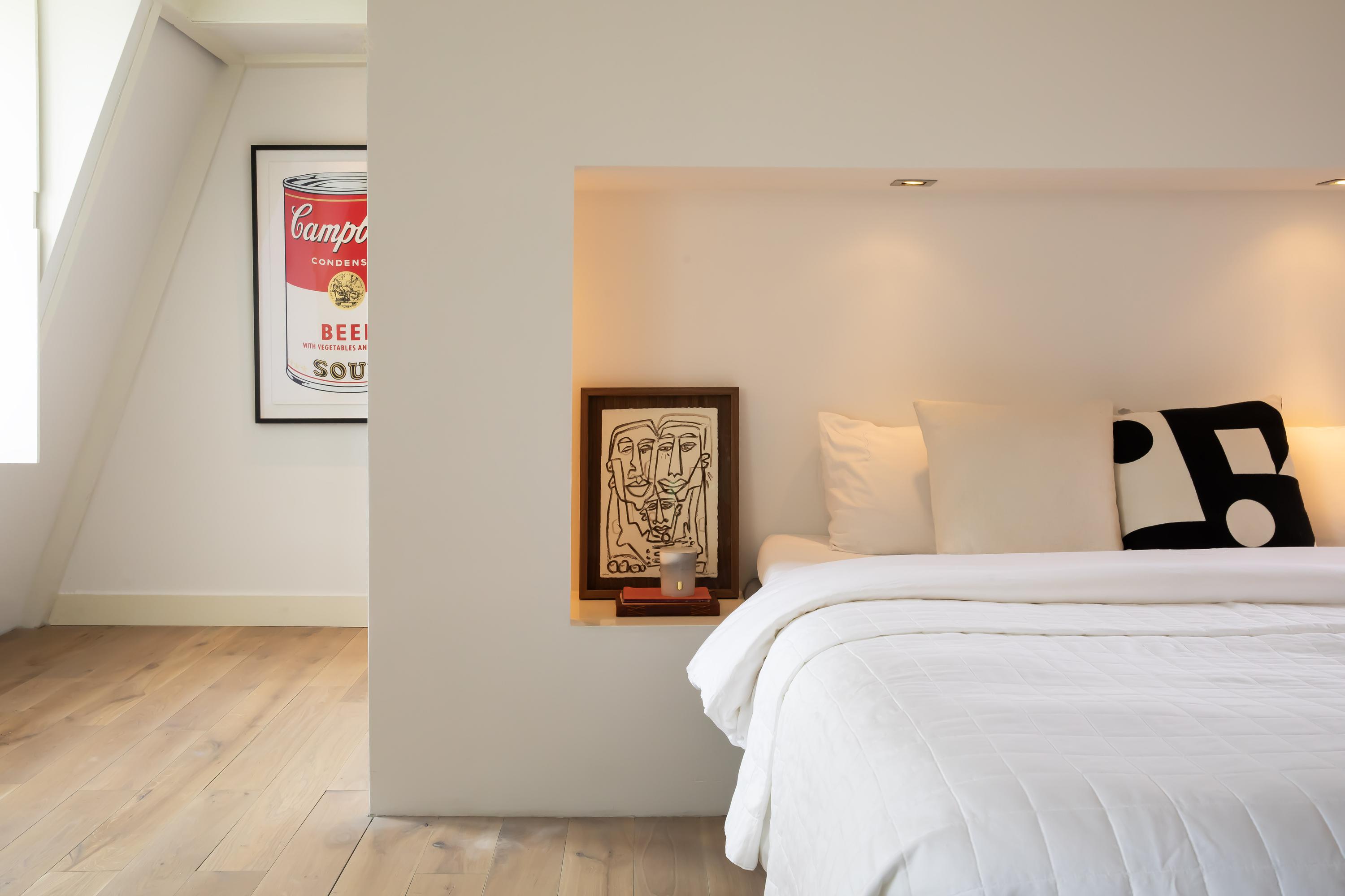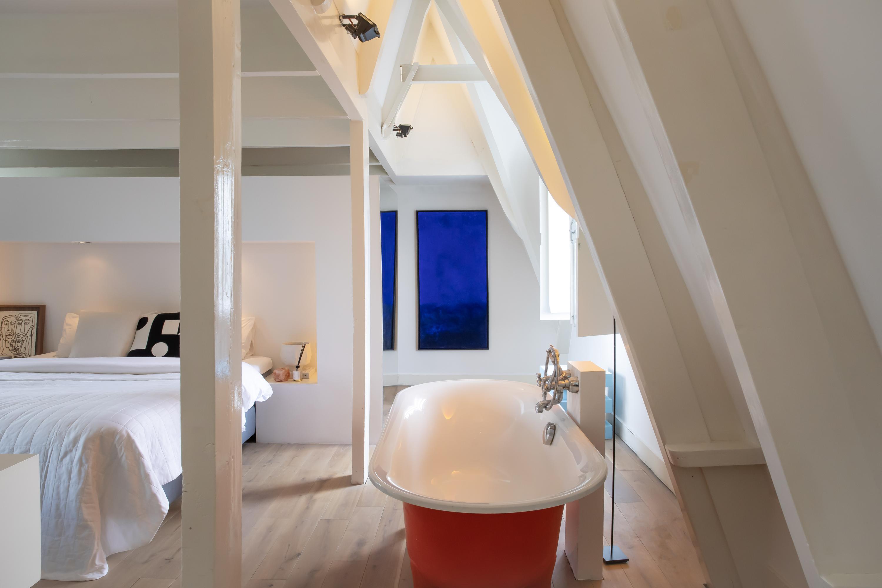 On the top floor you will find the spacious master bedroom, complete with a stylish built-in bed unit with integrated lighting, a freestanding bathtub, air-conditioning, and a characteristic beam construction. The en-suite bathroom features industrial details, a double sink with cabinet, walk-in shower, and toilet.
