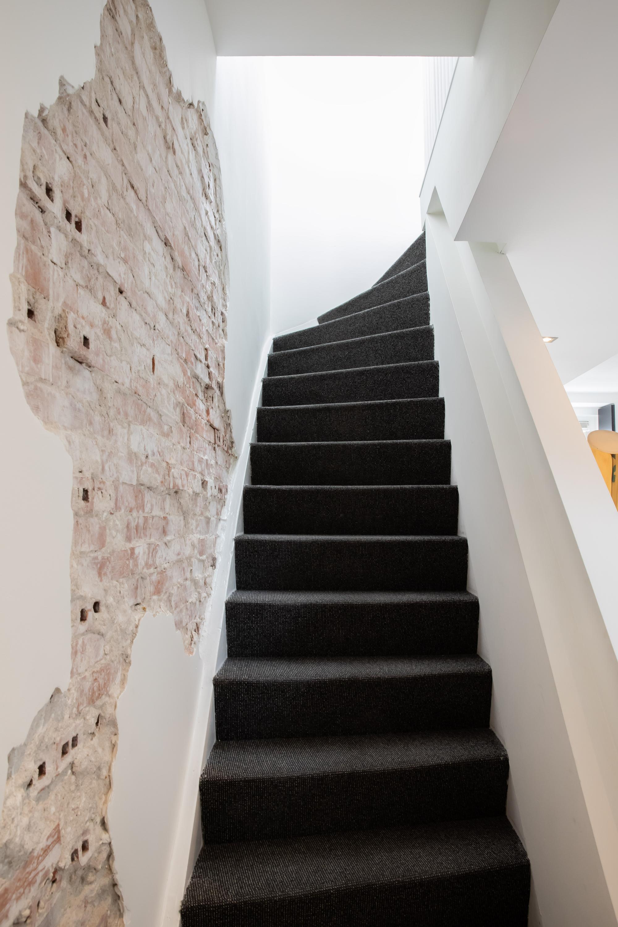 This floor also includes a separate toilet with washbasin and a convenient storage room. An elegant staircase with a partially transparent brick wall leads to the fourth floor.