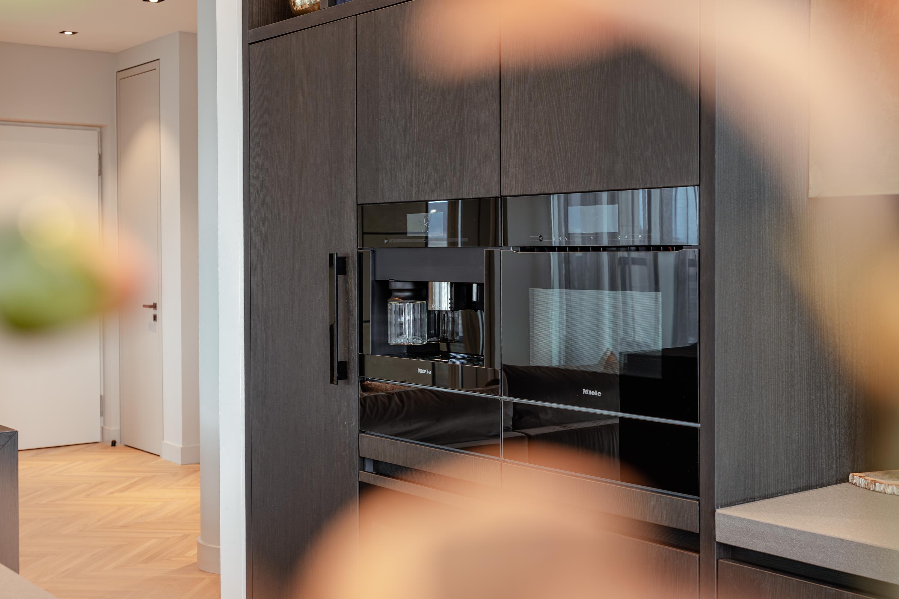 The open-plan kitchen with cooking island forms the heart of the home. Fully equipped with premium Miele appliances, including a wine cooler, steam oven, and coffee machine, it flows into the dining area and the large terrace, where you can enjoy a truly unique view over Dam Square.