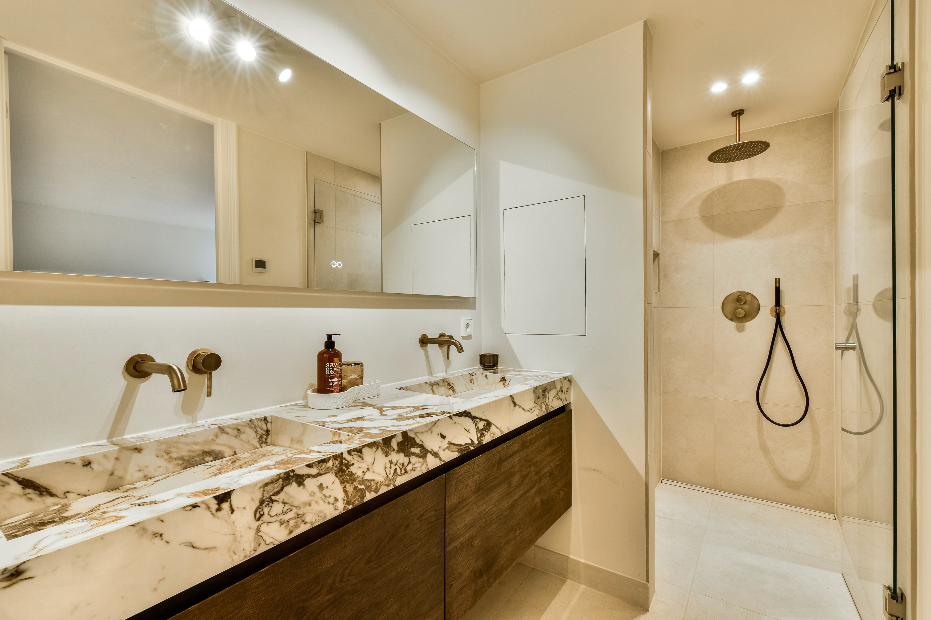 The basement houses three bedrooms and two modern bathrooms. The spacious master bedroom features large windows that flood the room with natural light and includes a practical built-in wardrobe. Both bathrooms are luxuriously designed with walk-in showers and double washbasins; one bathroom also boasts a bathtub. This level additionally includes a separate toilet and a dedicated laundry room.