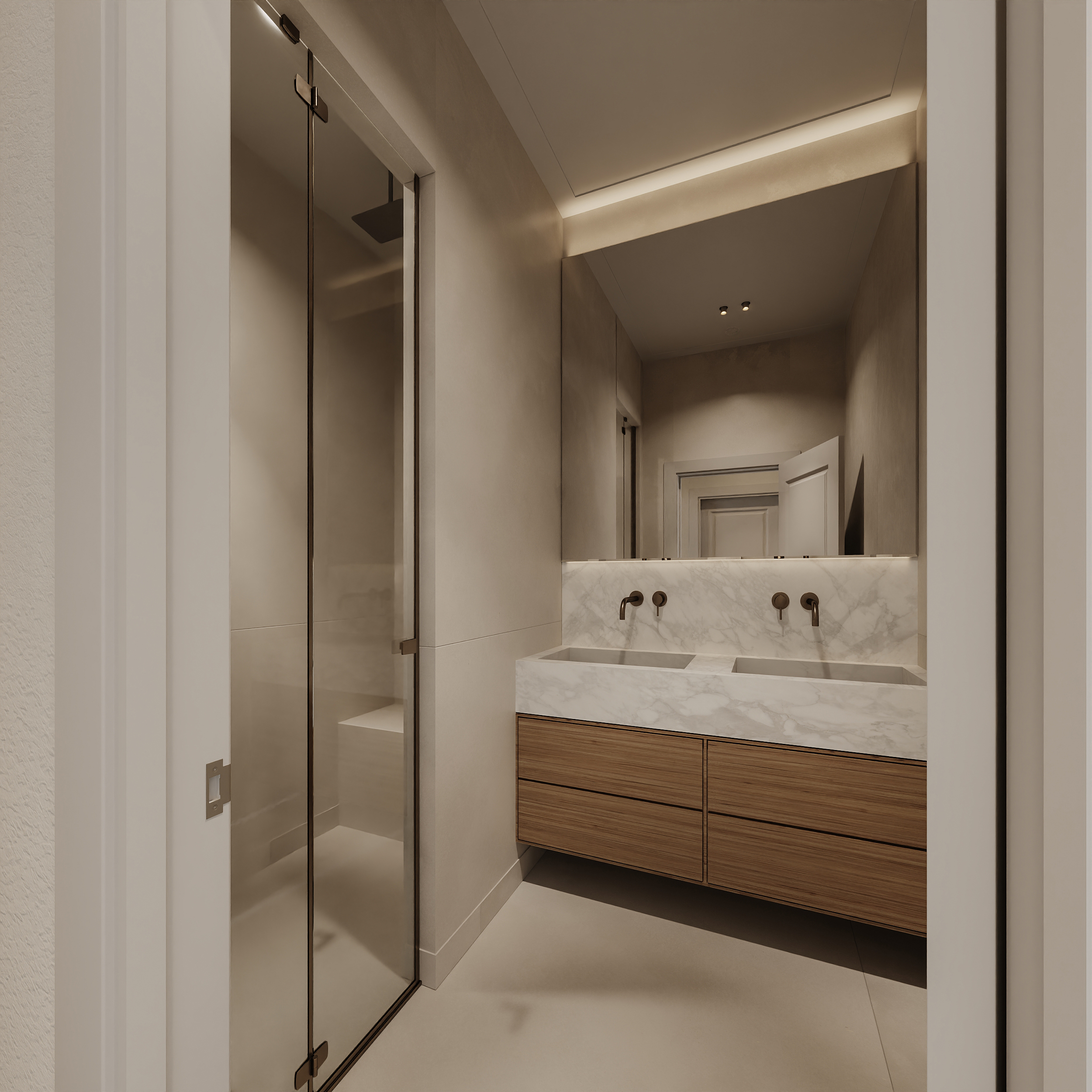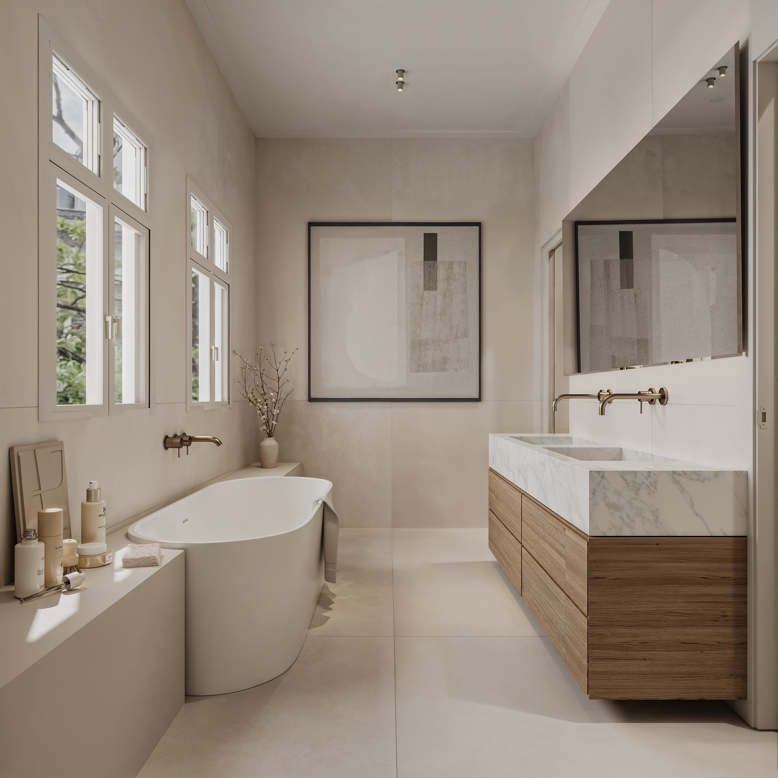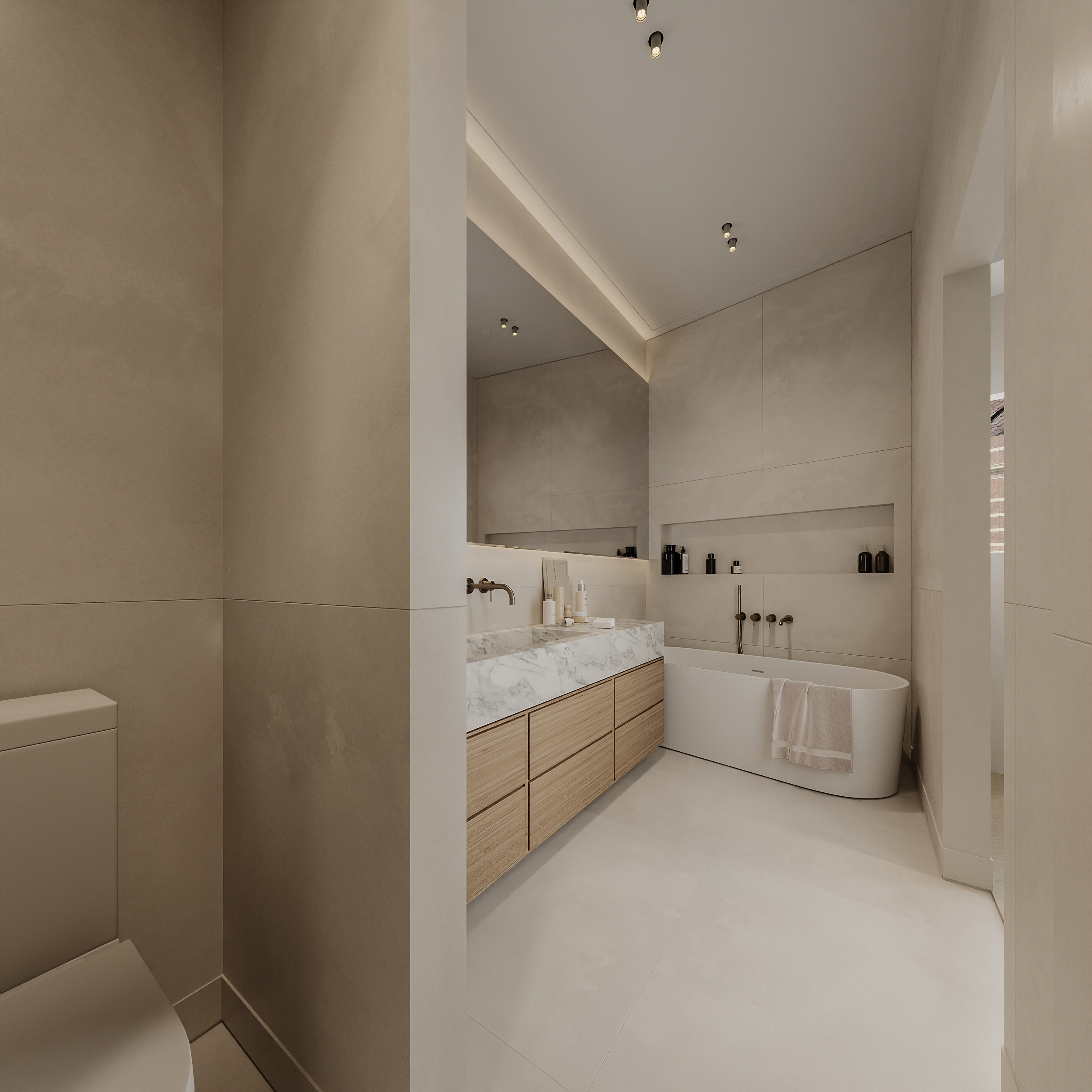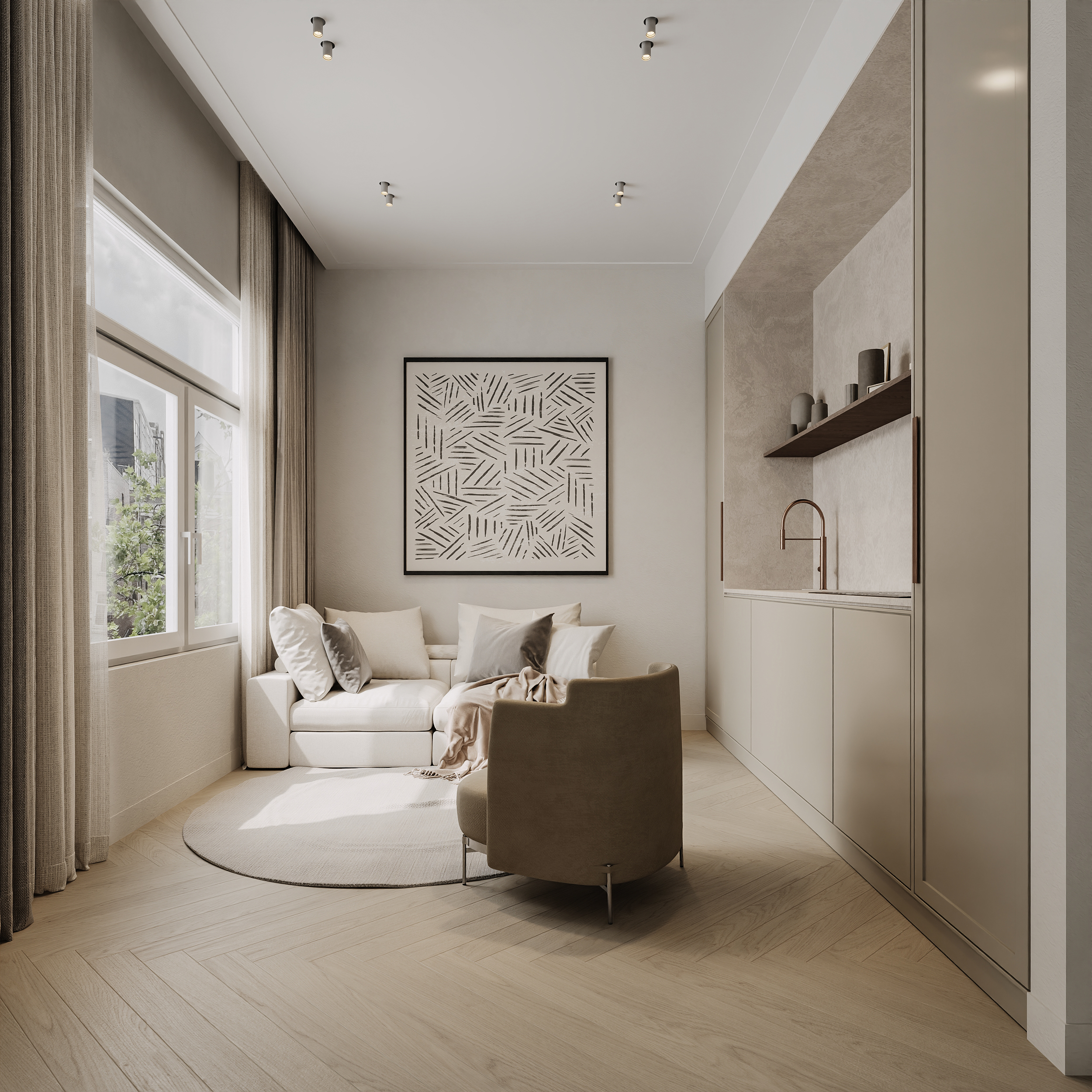 Please note: the images shown are artist impressions (renders) and are intended to give an impression of the atmosphere and possibilities of the home. The apartment will of course be delivered fully finished to a high standard, including kitchen, bathrooms, and all fixed fittings.