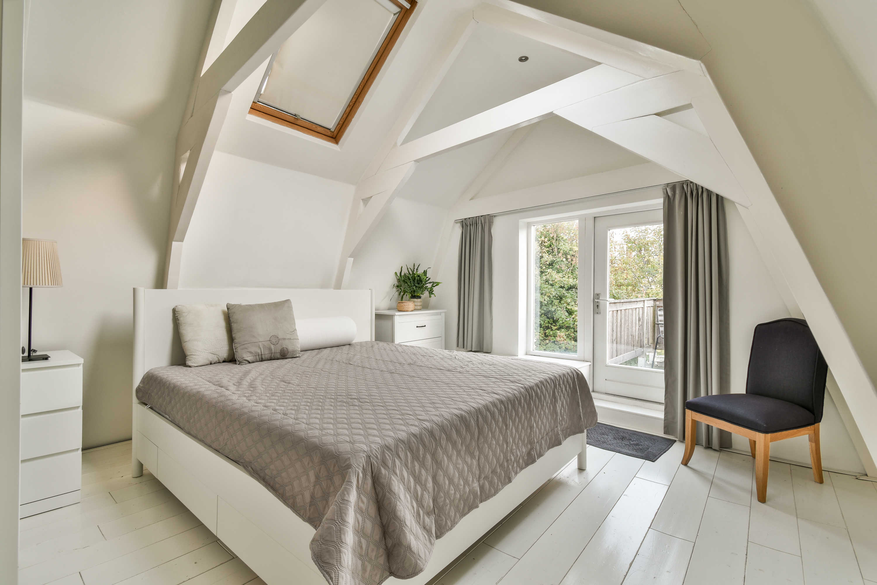 The second floor stands autonomous, accessed by a private entrance, with living and dining spaces arranged to maximise light. A separate kitchen and dedicated study or home office complete the level. The third floor, marked by its distinctive roof structure, dormer windows, and skylights, accommodates two sizable bedrooms and a bathroom, with the principal bedroom granting access to a south-facing balcony of approximately 5 m².