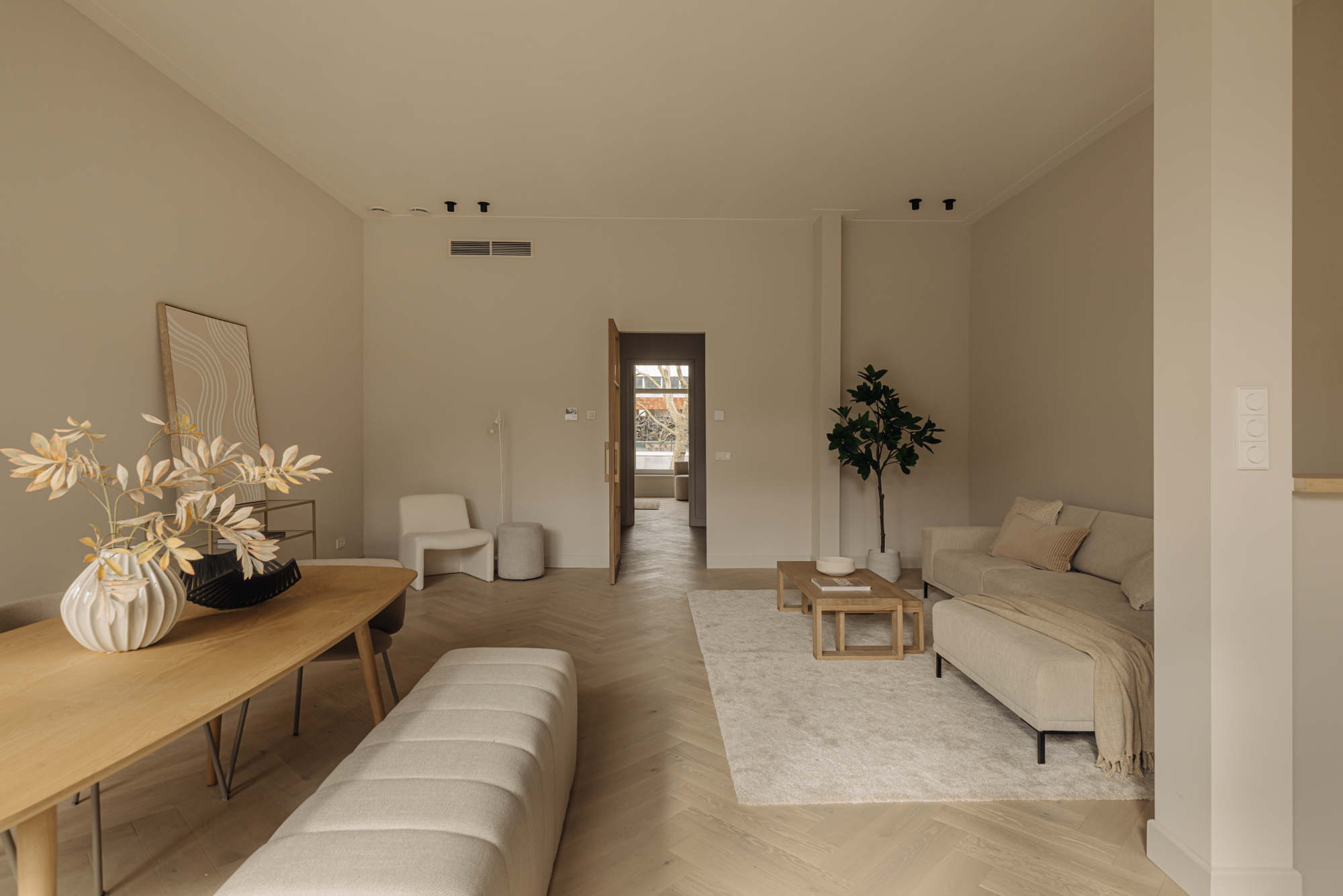 A luxury, 182-m² double ground-floor apartment with four bedrooms, two bathrooms, a balcony, terrace, internal storage space and a front and back entrance. The apartment features carefully selected, high-end materials that create a sense of warmth and comfort. Luxury herringbone floors, high ceilings, subtle tones in the kitchen and bathrooms and a well-thought-out lighting plan create a harmonious and inviting ambiance. The kitchen, with its clean lines and ample storage space, is a perfect combination of style and practical functionality. The building itself is a freehold property.