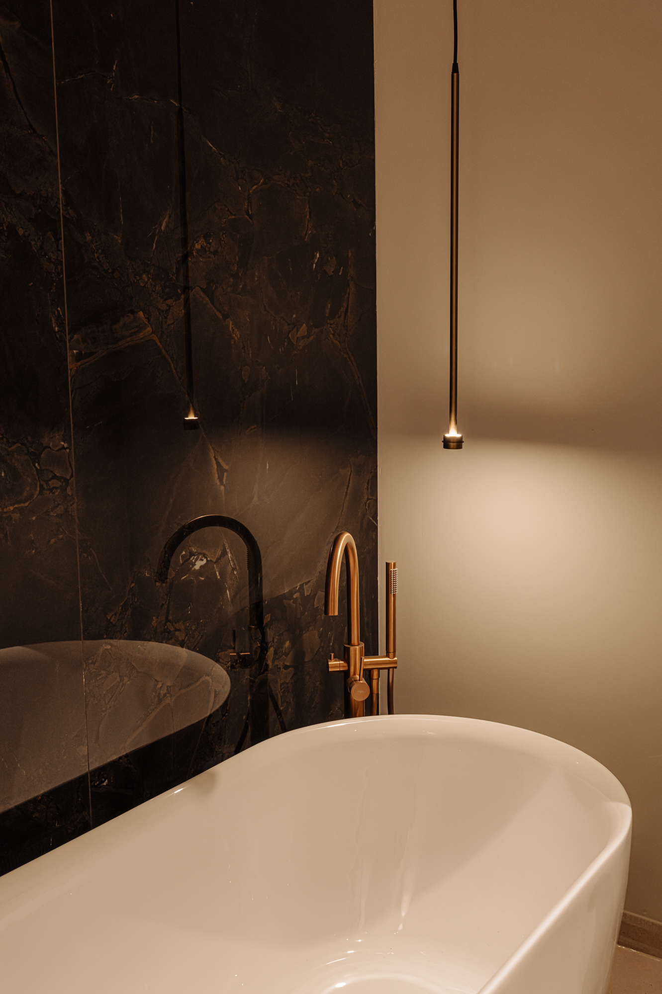 The two bedrooms at the back are flooded with natural light. They are so spacious that it would be easy to create a third bedroom. They have been beautifully finished with original wooden beams, which contribute to the apartment’s distinctive charm. The Master bedroom has its own en-suite bathroom with a double washbasin, a large bath and walk-in shower and a toilet. This bathroom is the epitome of comfort and luxury. The second bathroom is elegant too and has a double washbasin unit and a walk-in shower.