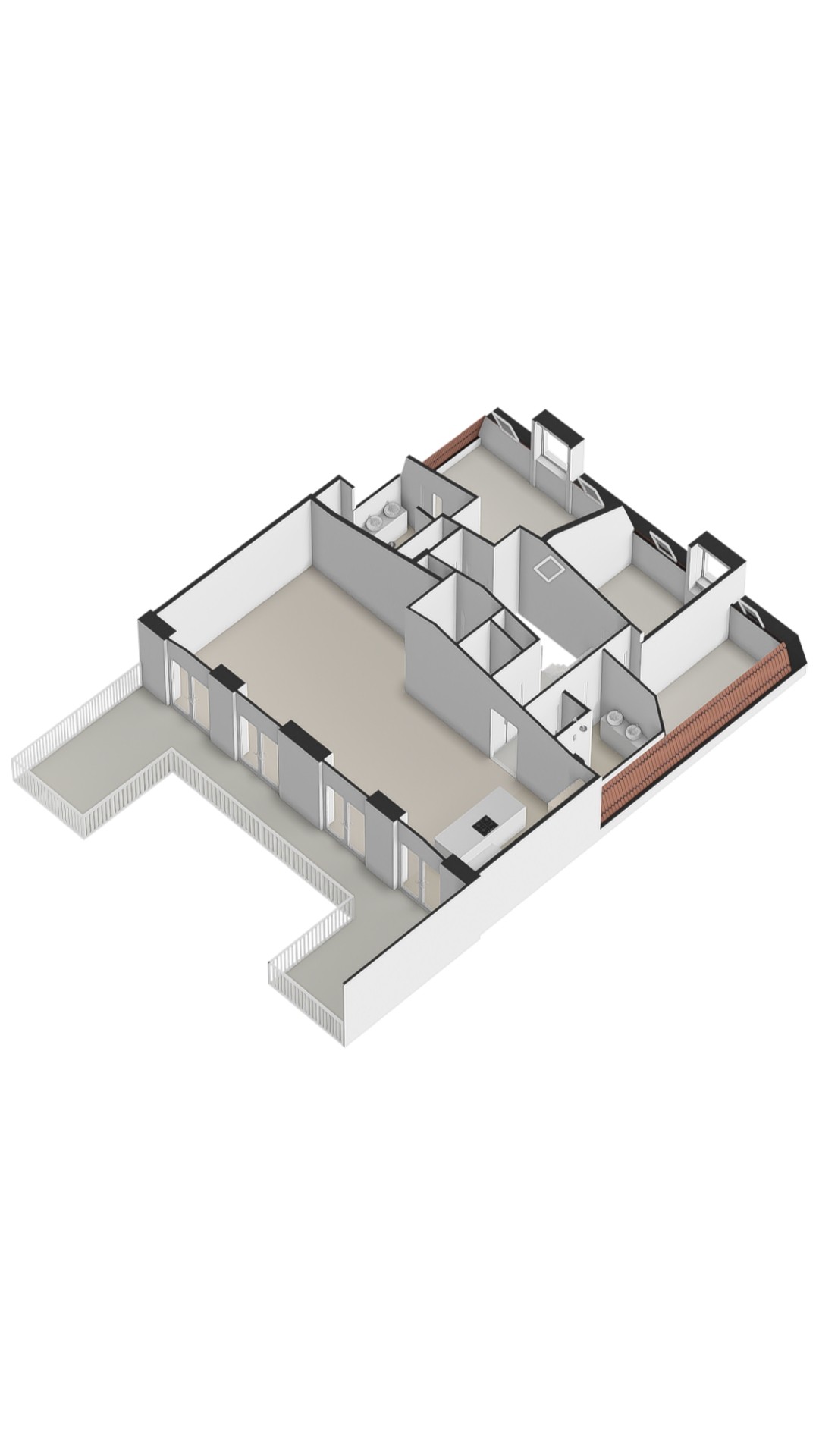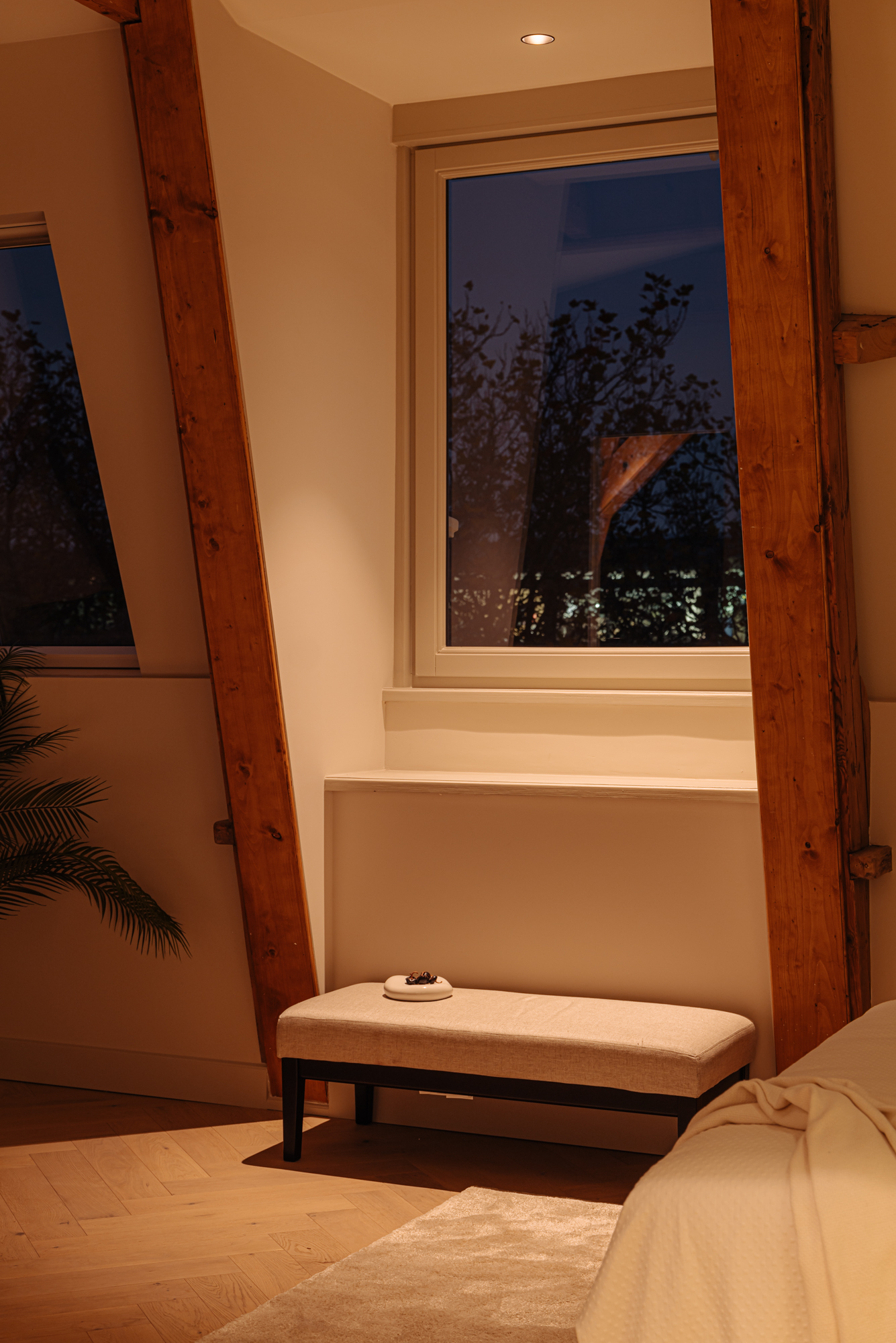 The front door to the apartment opens into a landing that gives access to storage space, a separate guest toilet and all the apartment’s other rooms. There is a large, bright living room (approx. 53 m2) and an open-plan kitchen of Italian design with a cooking island at the front of this floor. The luxury kitchen is equipped with a comprehensive range of built-in appliances and balances style and functionality perfectly. The sophisticated combination of white units with marble worktops and large units with the warm shade of walnut give the space a beautiful, atmospheric feel. A number of double doors open out onto the apartment’s sunny roof terrace.