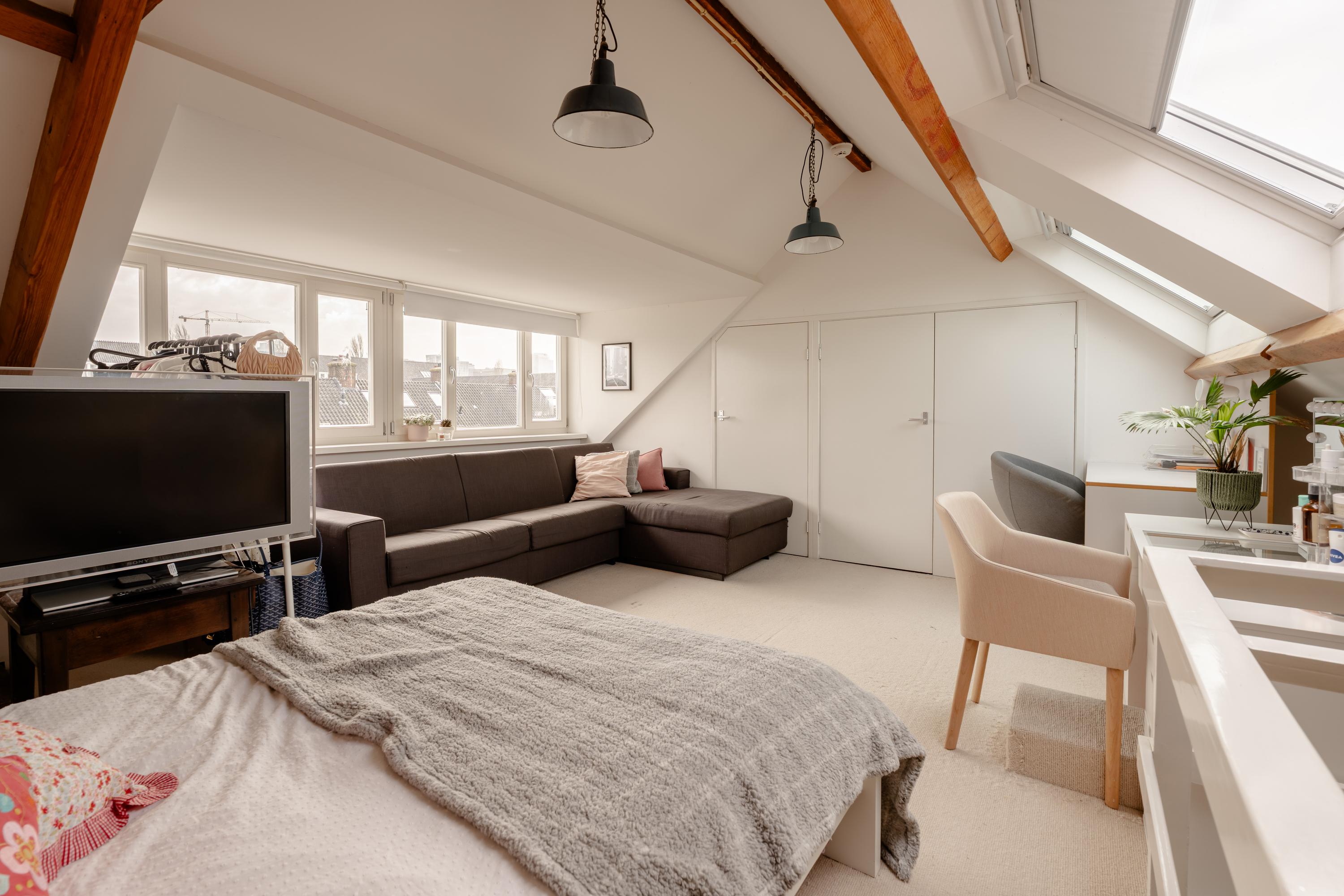 The room is currently arranged as a bedroom with a sitting area, but could easily serve as a master bedroom, studio or multifunctional space. Practical storage space is available in the knee walls.