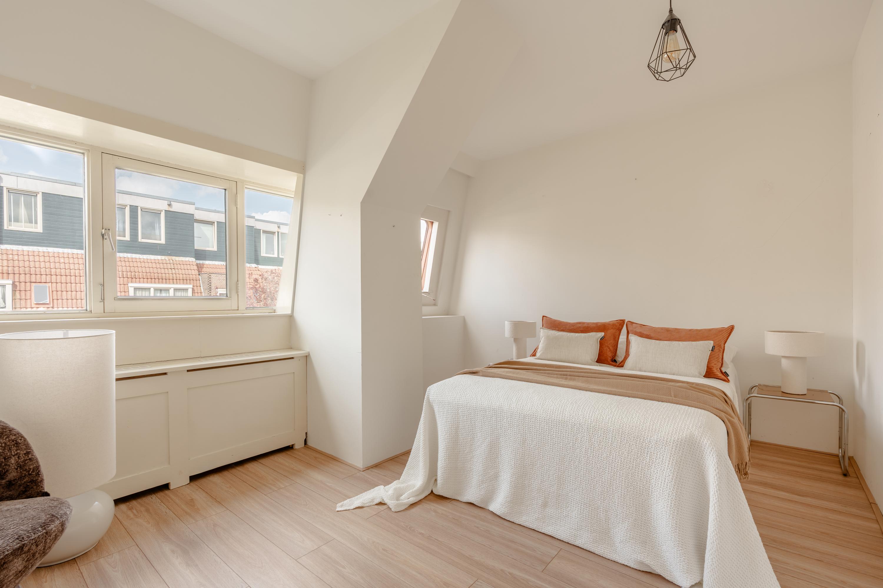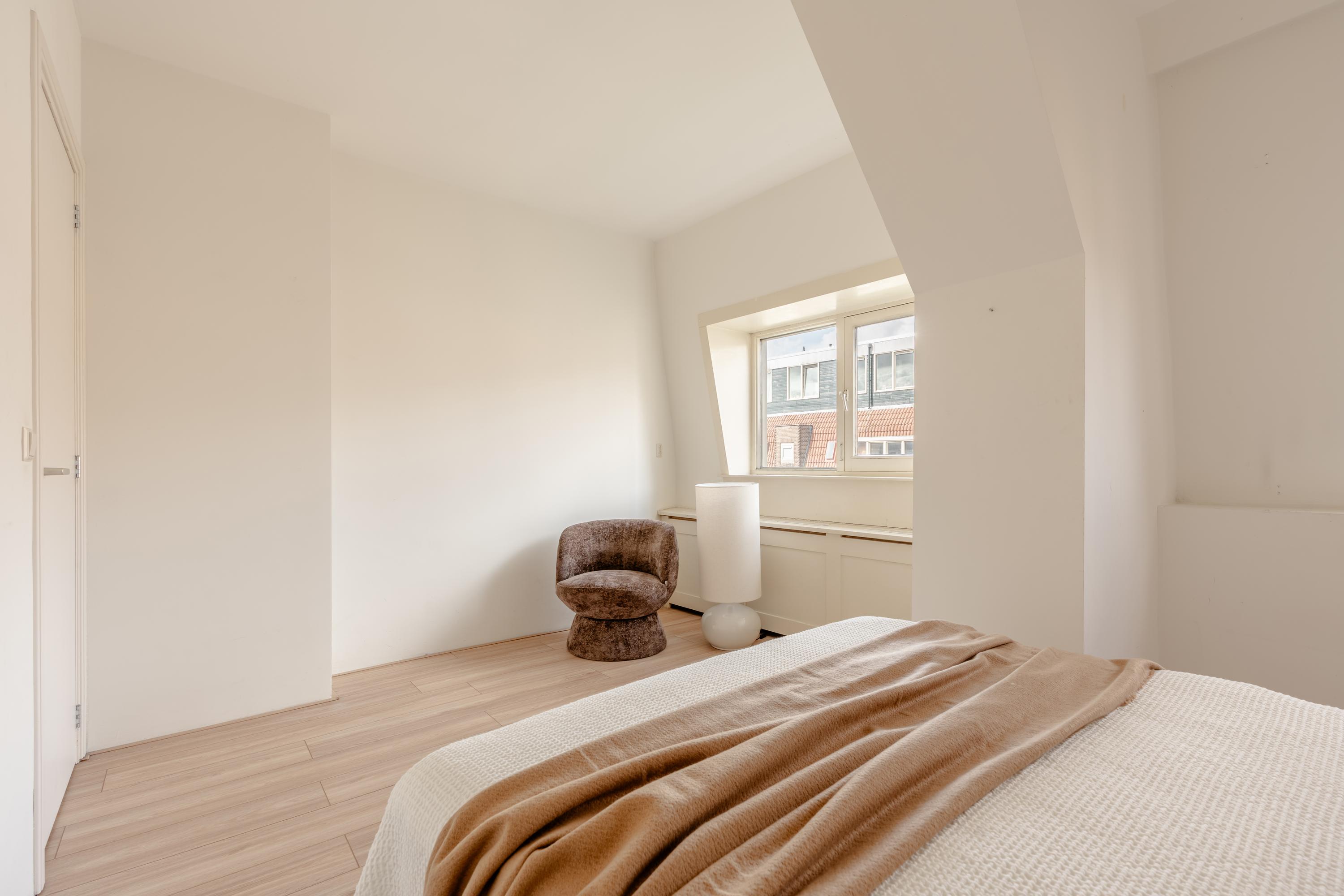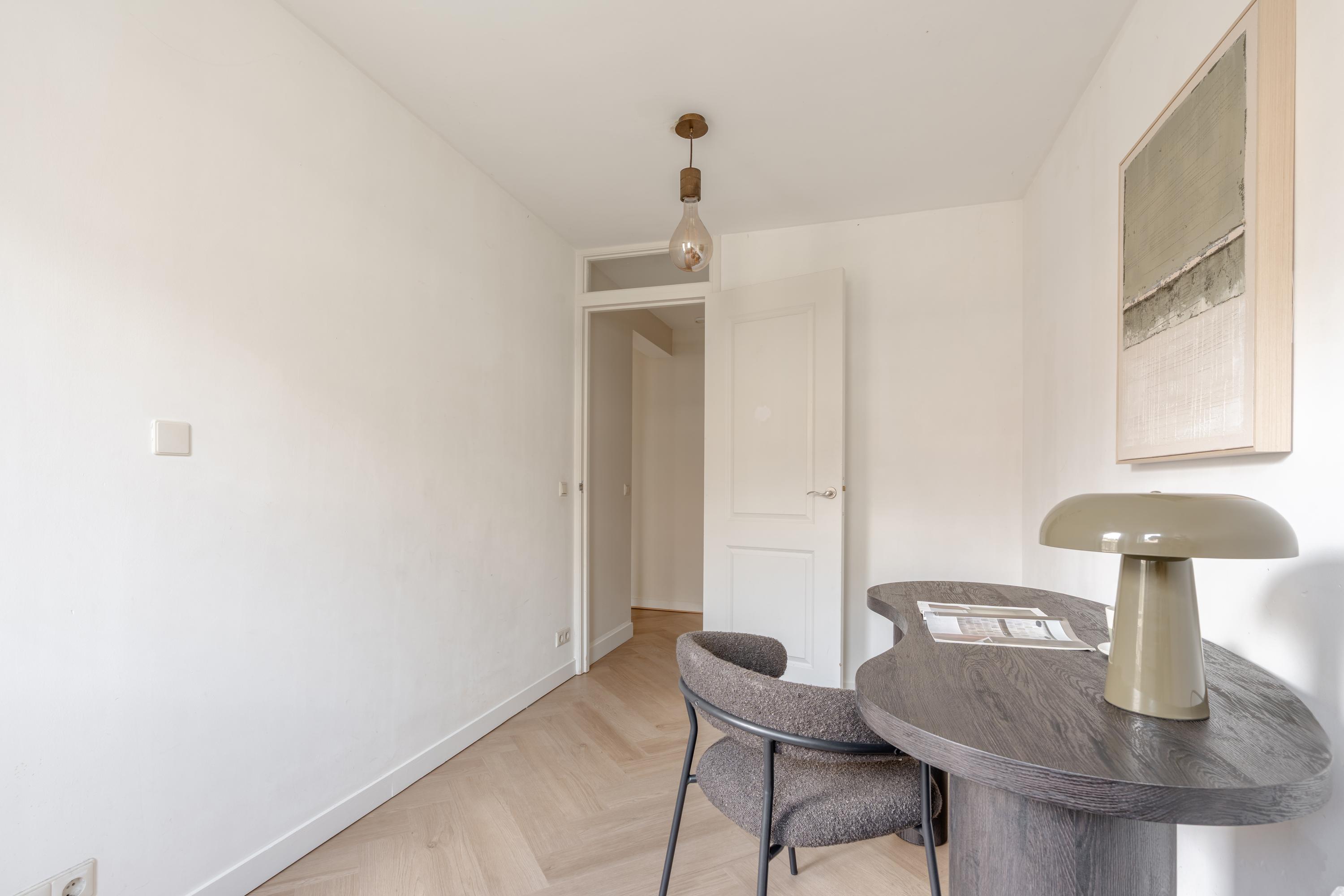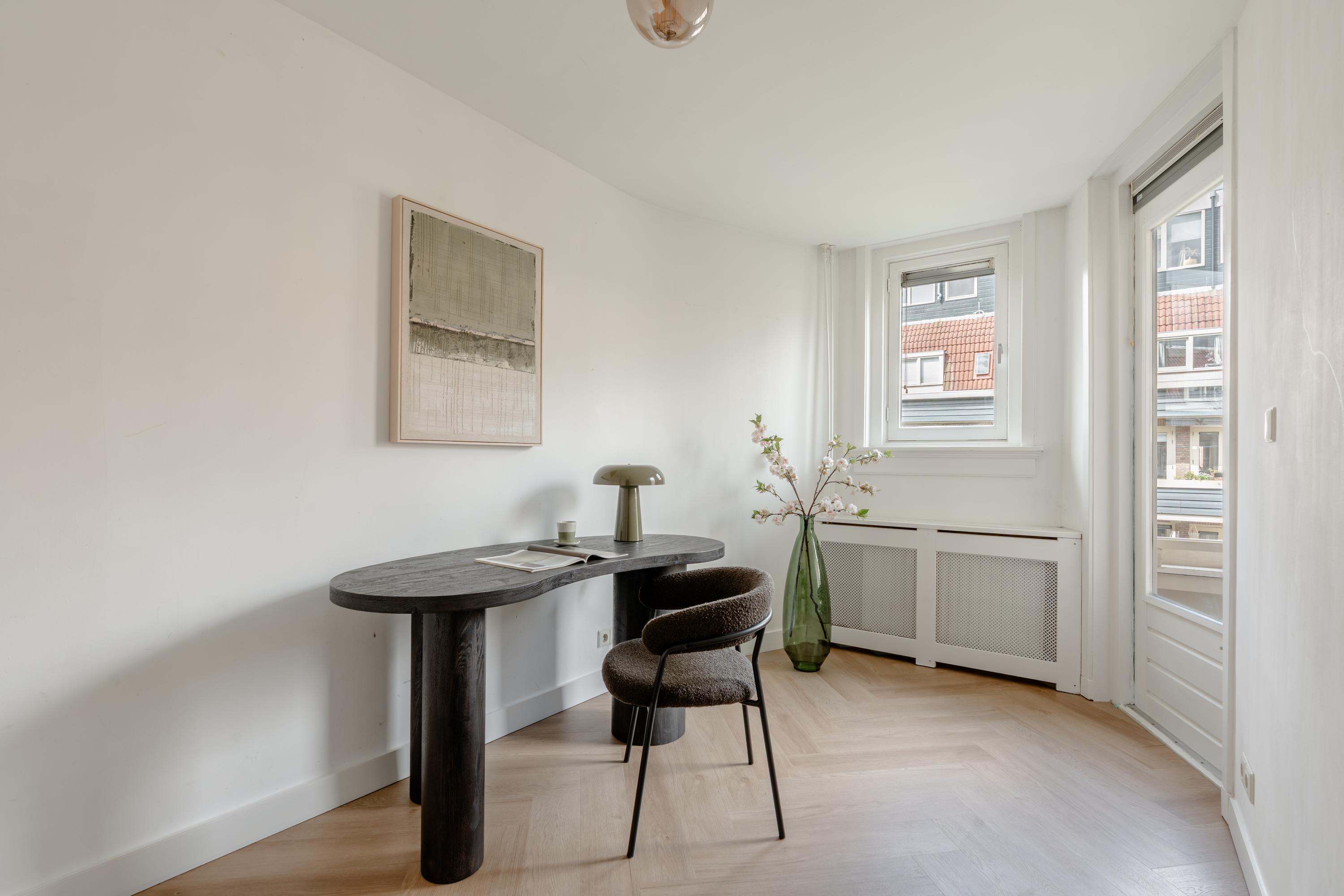 The living room at the front offers ample space to create a comfortable seating area. The charming bay window with opening windows allows for plenty of natural light and offers pleasant views over Jozef Israelskade and the water. At the rear, you will find the kitchen, situated in a pleasant open space yet separate from the living room. This makes it an ideal place to cook in peace and enjoy dining. Thanks to the three sets of French doors opening onto the balcony, this area is exceptionally bright. The kitchen is fully equipped, including a refrigerator, freezer, dishwasher, and a four-burner gas stove. The wide balcony, facing northwest, overlooks the quiet inner courtyard and provides a lovely place to relax. Adjacent to the kitchen is a bedroom that also has access to the balcony. This room can be flexibly arranged, for example as a home office, study, or children's room. The bathroom is also located on this level and features a bathtub, toilet, walk-in shower, and washbasin.