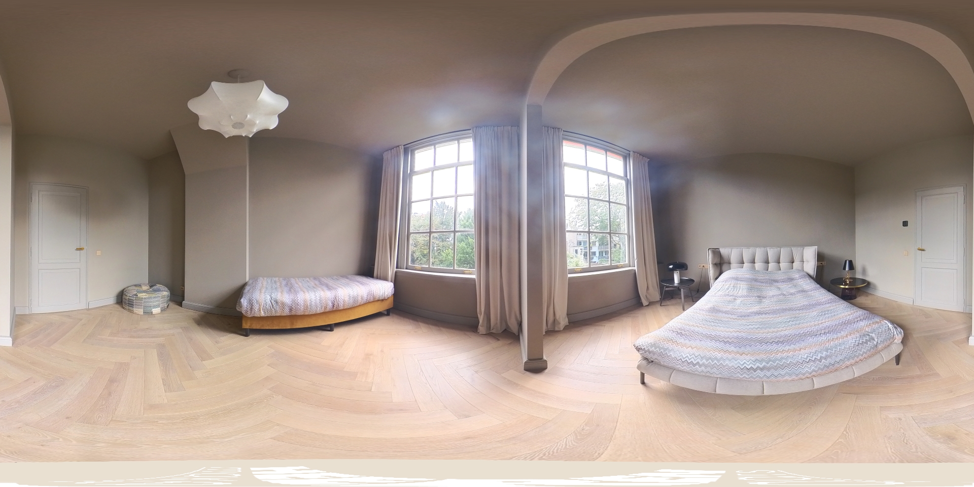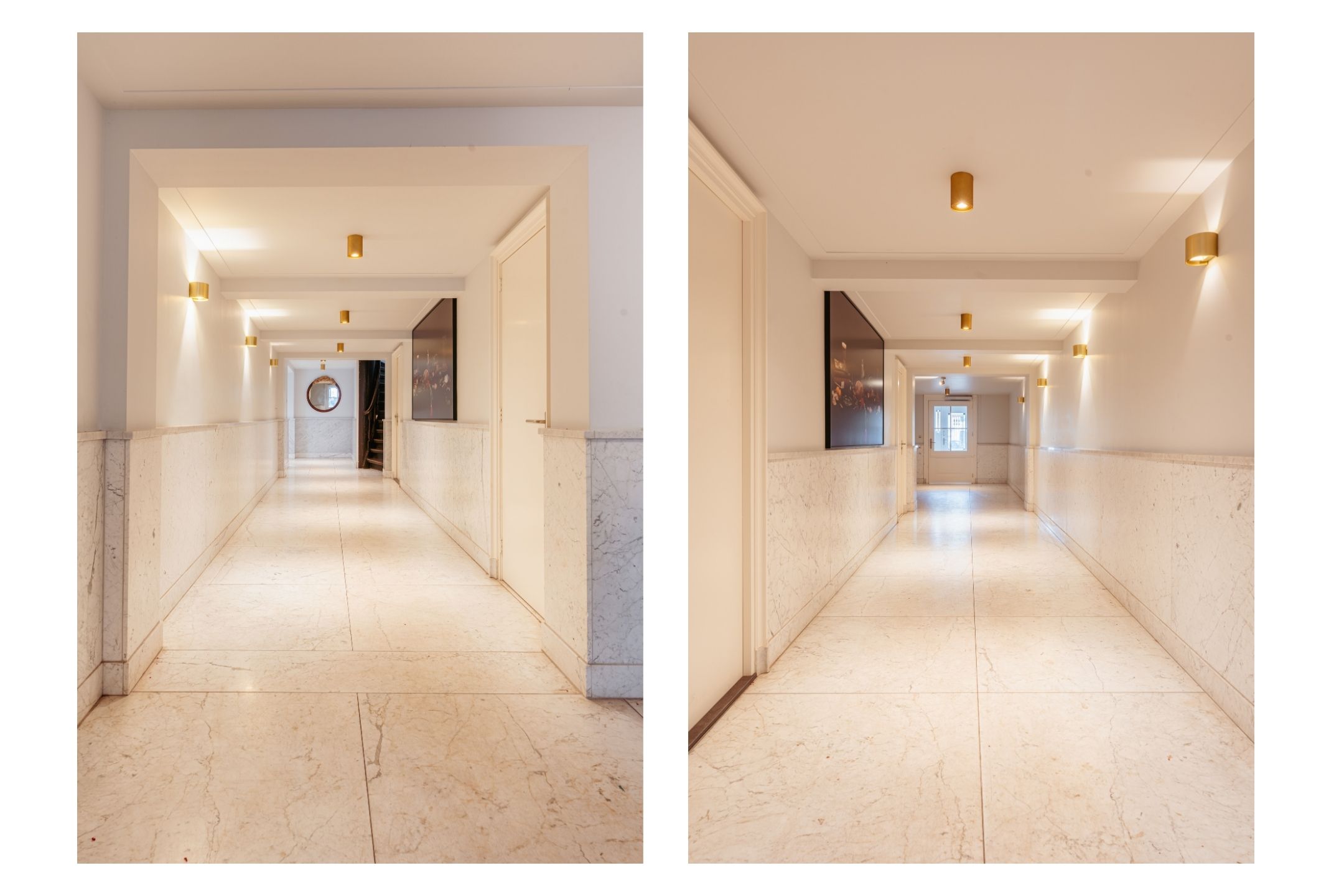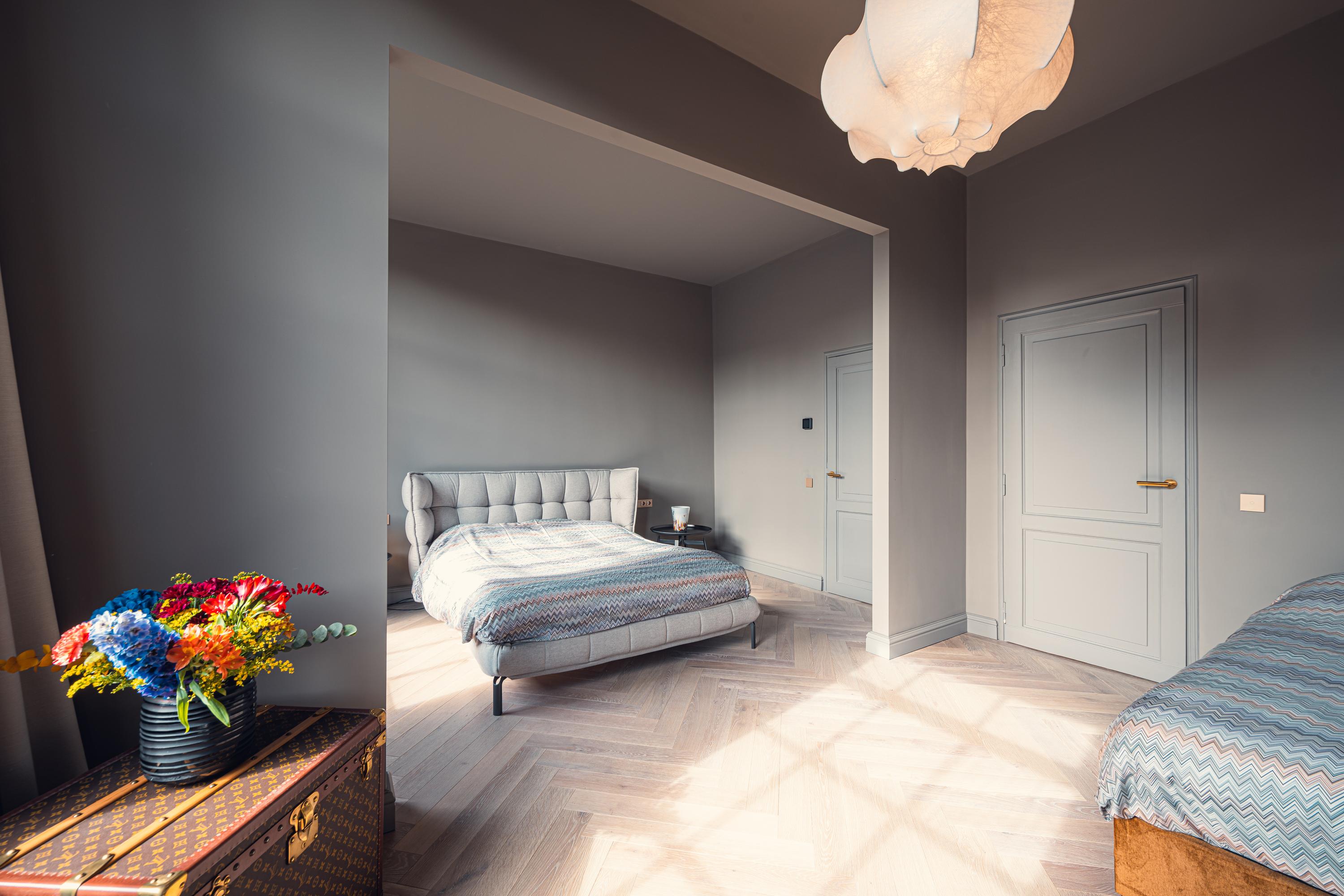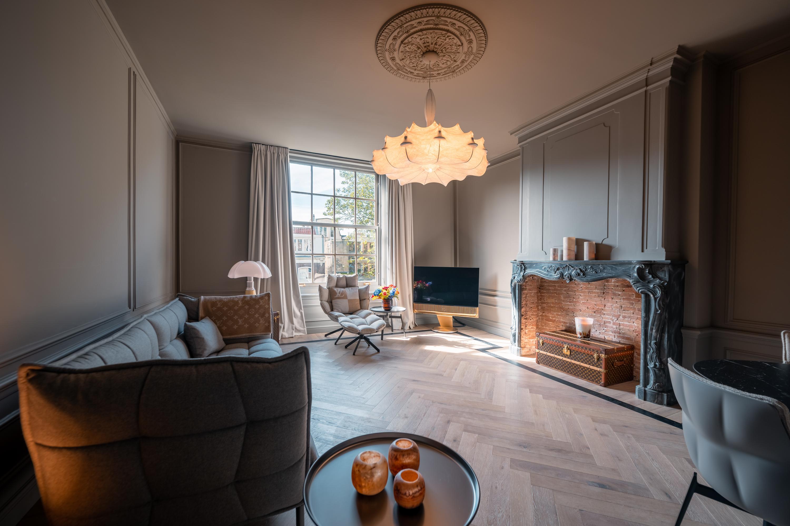 Apartment Amsterdam Canal District South is found on Keizersgracht, in a distinguished national monument dating to 1690. This 84 m² residence occupies the second floor of an immaculately maintained canal house, renovated in 2022 and 2023 with an eye for understated luxury and architectural continuity. Crossing the marble entrance hall, one enters a space defined by refined details: high ceilings, paneled doors, herringbone wooden floors with black inlay, and a harmonious palette animate the generous living room. The original classical ceiling rose and marble fireplace frame a sense of historical resonance, juxtaposed with the comfort of modern underfloor heating throughout.