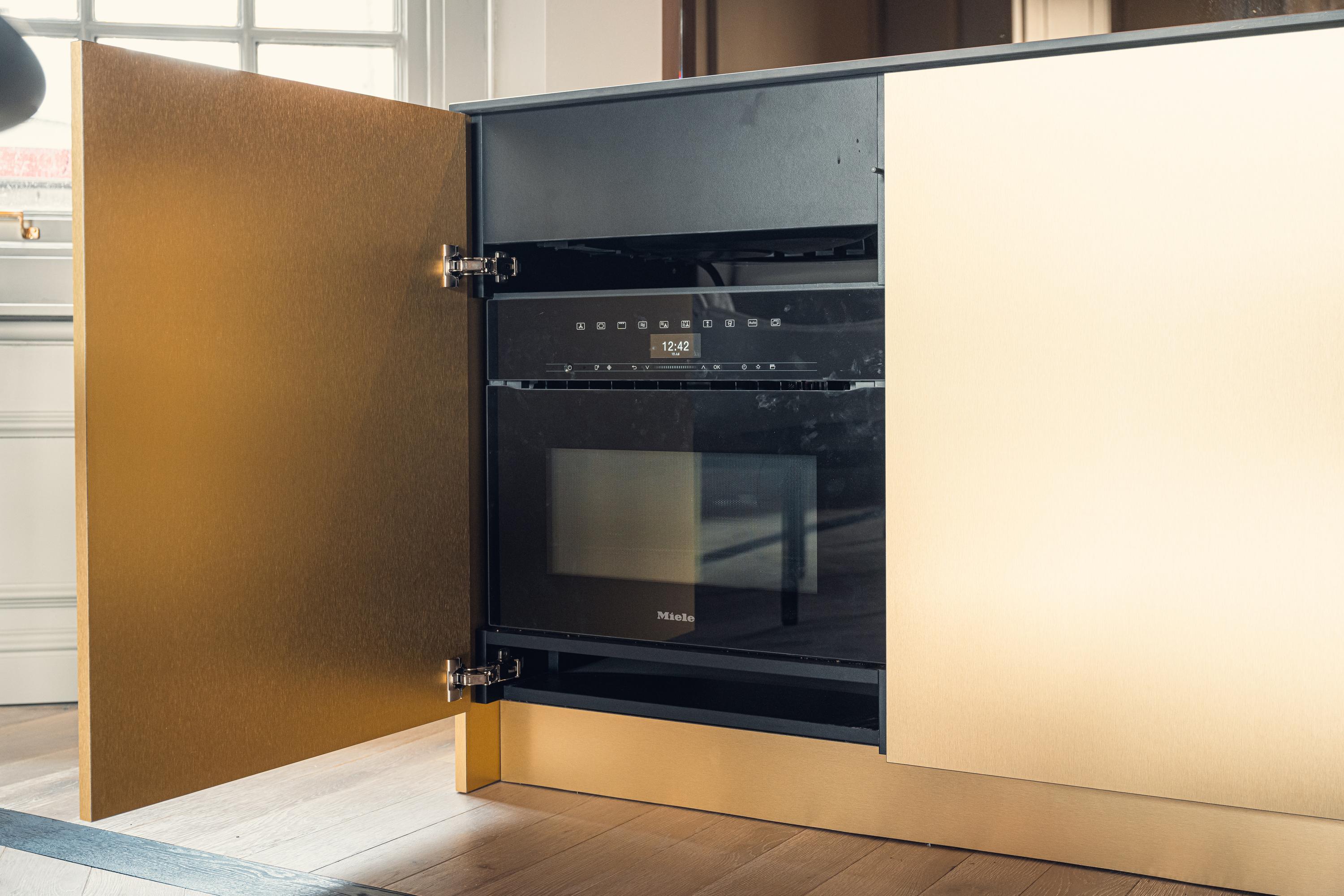 The contemporary kitchen, custom-built with gold-toned finishes and equipped with Miele appliances, Quooker, and Bora induction, connects seamlessly to the living area—designed for both daily ease and sociable evenings. The custom hallway storage and large, light-filled bedroom epitomize intelligent use of space, with the option to restore a second bedroom. In the bathroom, Italian designer furnishings, a freestanding tub, walk-in rain shower, and golden accents create a private retreat reminiscent of a boutique hotel.