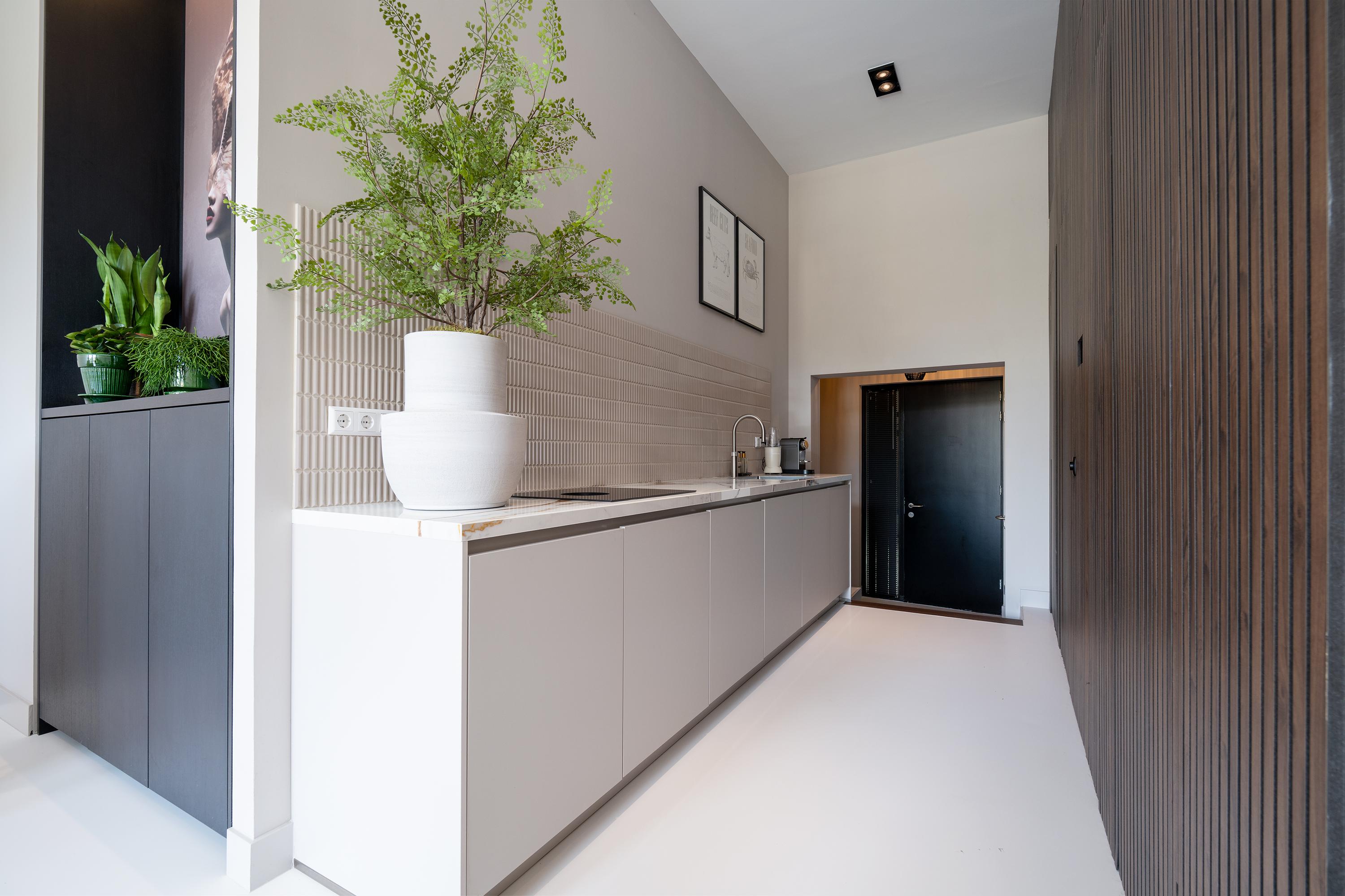 Spacious central hallway, utility room with washer/dryer setup in custom-built cabinetry (both AEG machines available for takeover), master bedroom with a high-end custom wardrobe by De Maatfabriek, second bedroom/guest room, modern bathroom with walk-in shower, second toilet, and washbasin. This level is ideal for sleeping or working, with ample natural light and windows that open in both bedrooms.