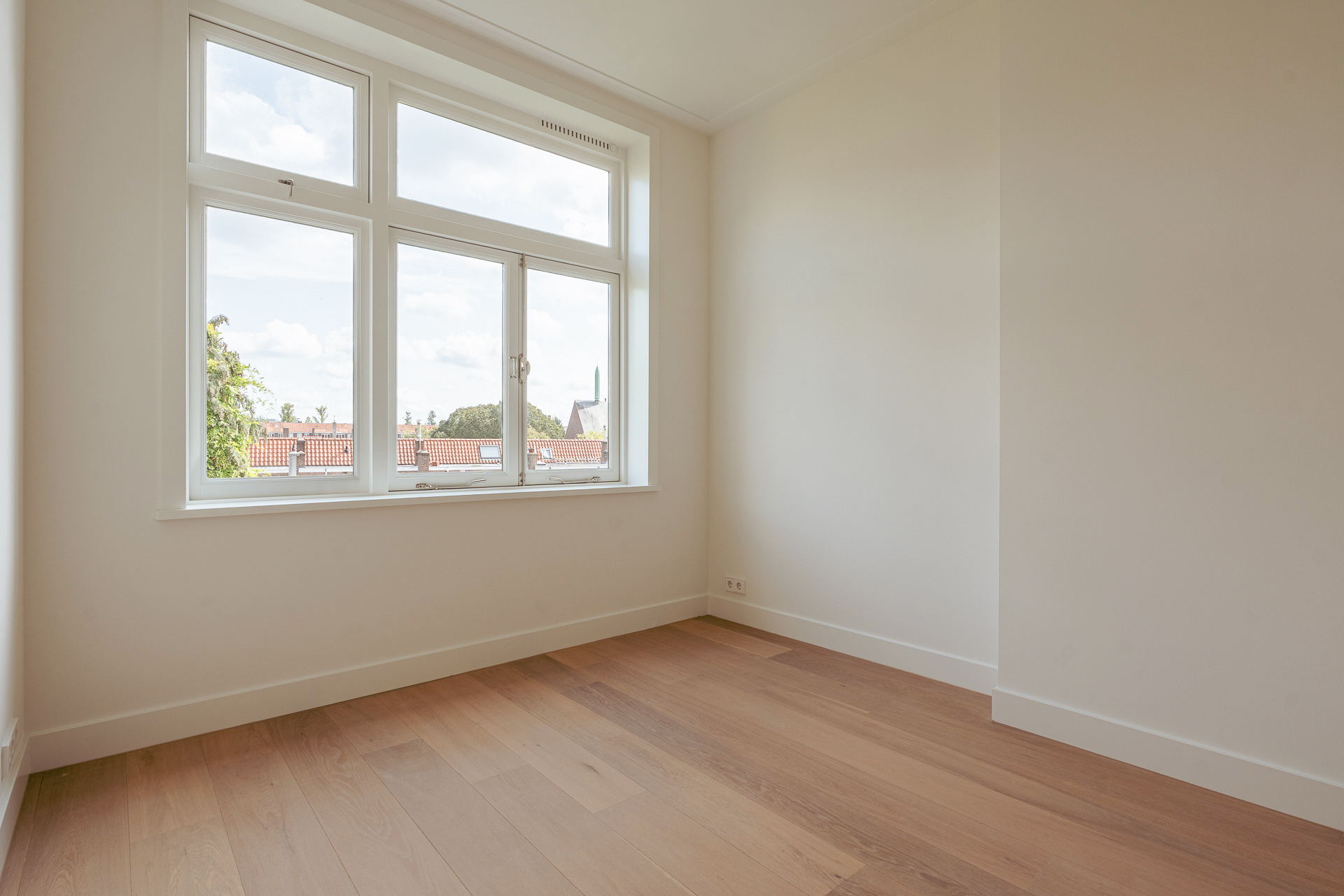 On the third floor lies the heart of the home. From the spacious hallway, with a practical built-in wardrobe and separate WC, you enter the bright and expansive living room with open-plan kitchen. This room extends across the full width of the property (over 7 metres) and, with large windows on both sides, is flooded with natural light and offers wonderful, unobstructed views over Olympiaplein.