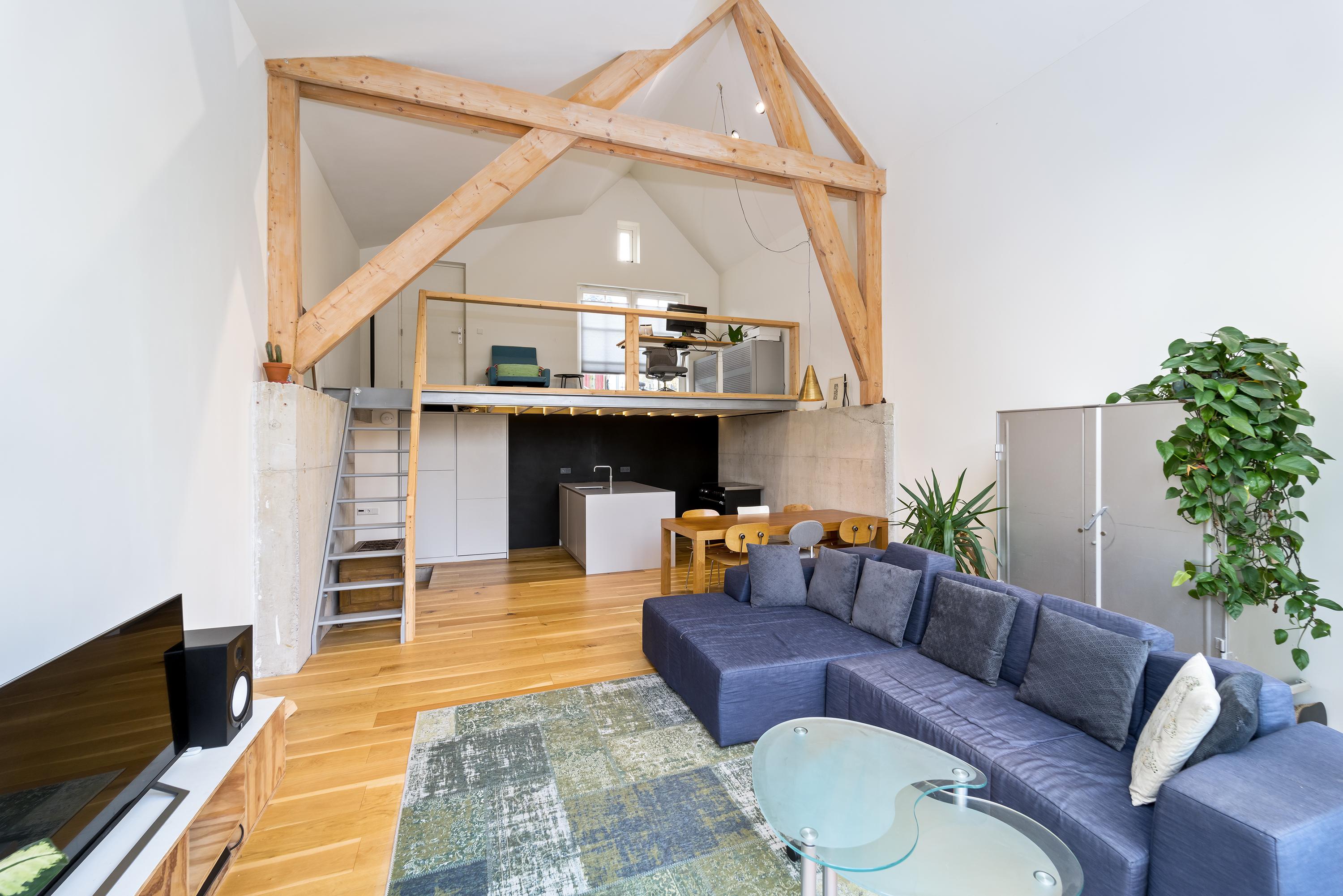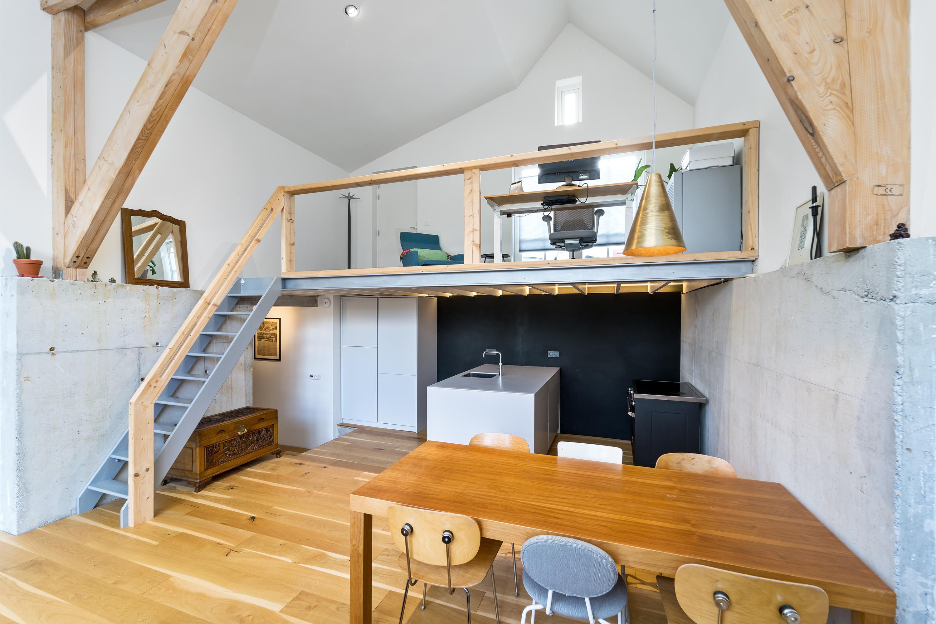 The spatial experience distinguishes itself by soaring ceilings in the main living area, punctuated by a lofted office that brings both light and versatility. Beneath, a bespoke kitchen anchors the heart of the home. Modern materials—oak floorboards, visible timber beams, raw concrete, and steel—contrast and complement one another, creating a tactile, lived-in palette. Throughout, home automation and energy-efficient LED lighting weave modernity through every layer, while double glazing and triple insulation foster a measured comfort.