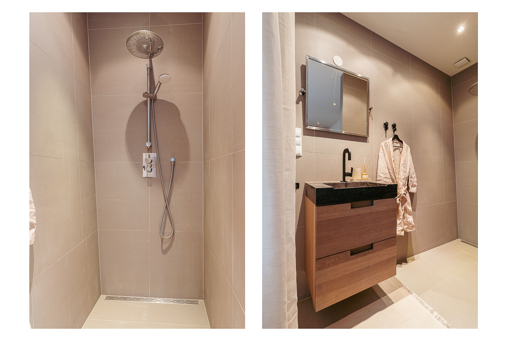 The staircase at the front leads to the first floor. At the front of the house lies the spacious primary bedroom, featuring large windows and French doors overlooking the canal. The room is warmly styled with a wooden feature wall and offers additional space for a work area. Adjoining the bedroom is a modern bathroom equipped with a walk-in shower, vanity unit and high-quality finishes.