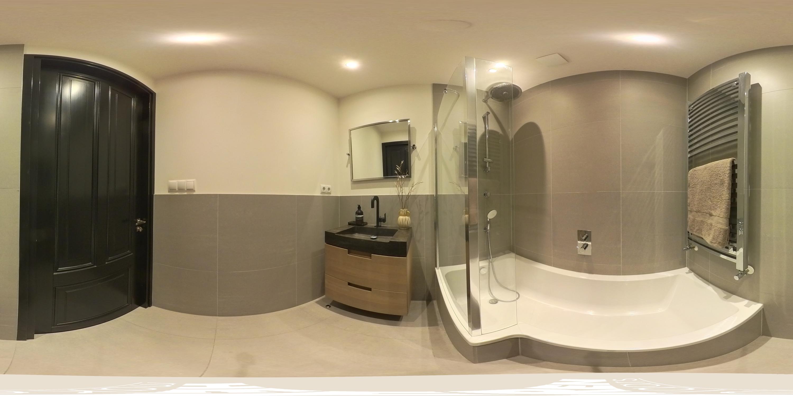 At the centre of this floor is the spacious kitchen-diner of approx. 39 m², fitted with a large cooking island and luxury built-in appliances including a dishwasher, 5-burner gas hob, fridge-freezer, microwave and oven. Warm wood elements, a stone worktop and sleek design give the kitchen a high-end and welcoming look. The island provides generous workspace, and the custom-made cabinetry offers ample storage. At the front, there is plenty of room for a large dining table, perfect for long dinners, drinks and cosy evenings with friends and family.
