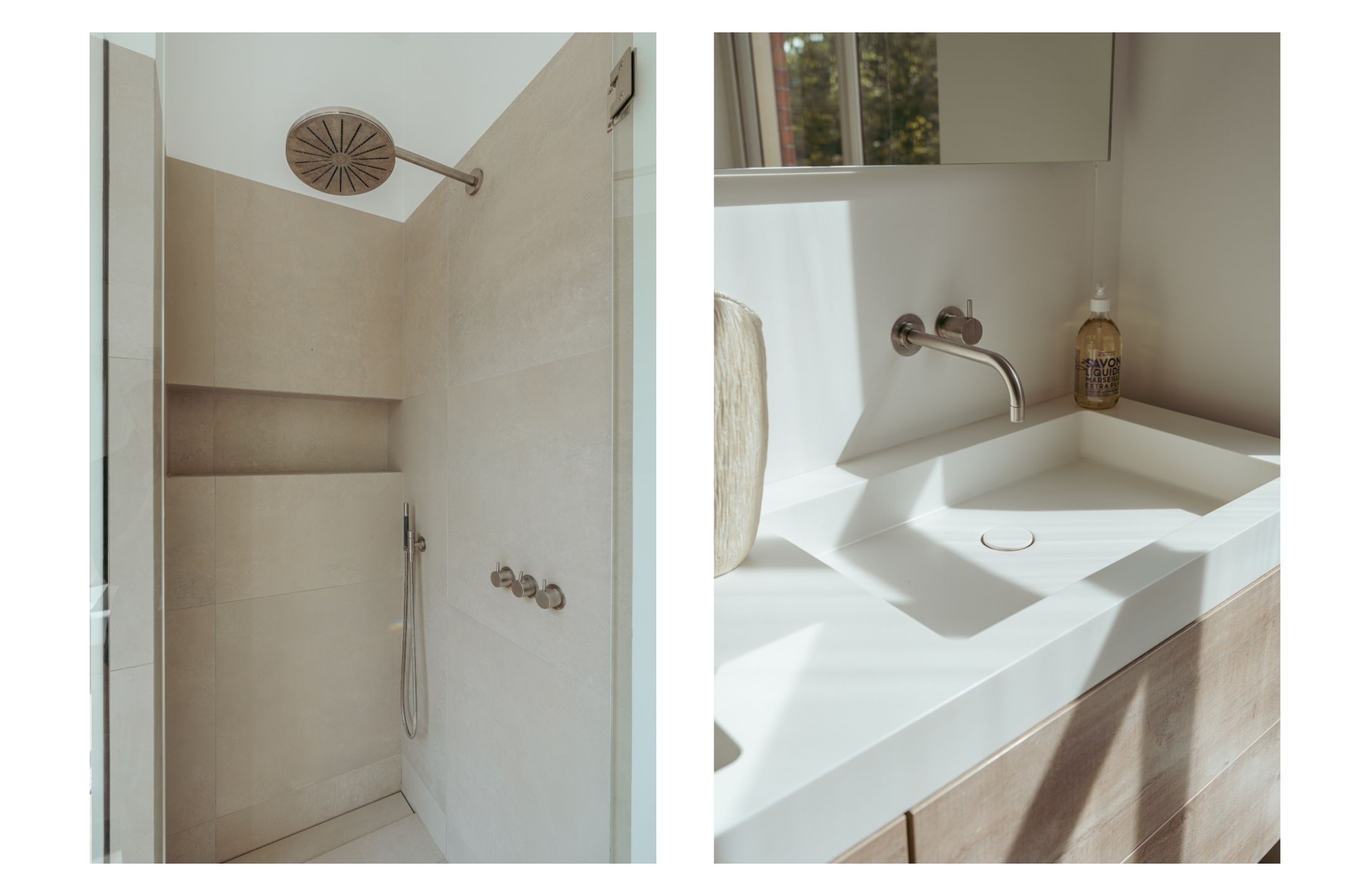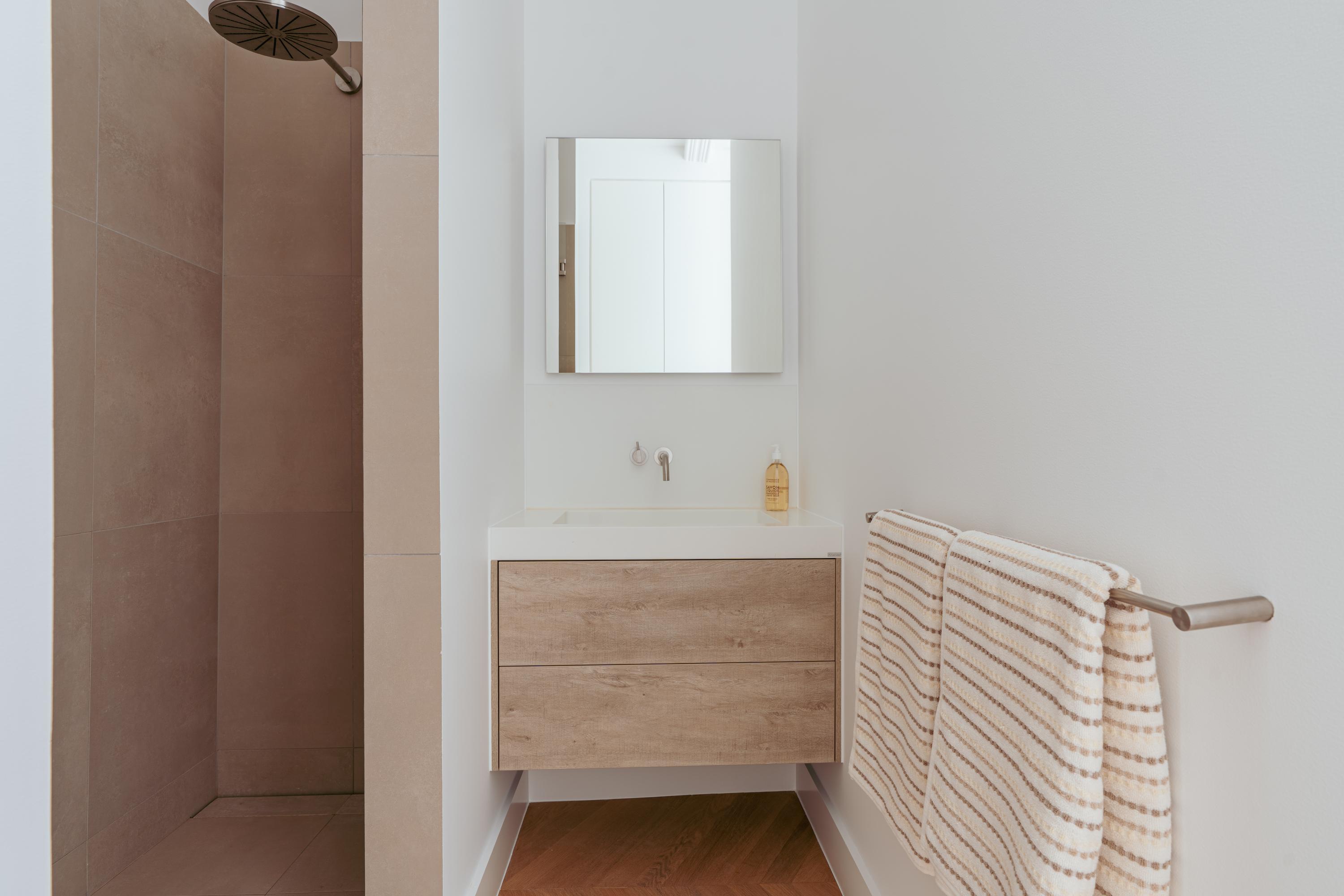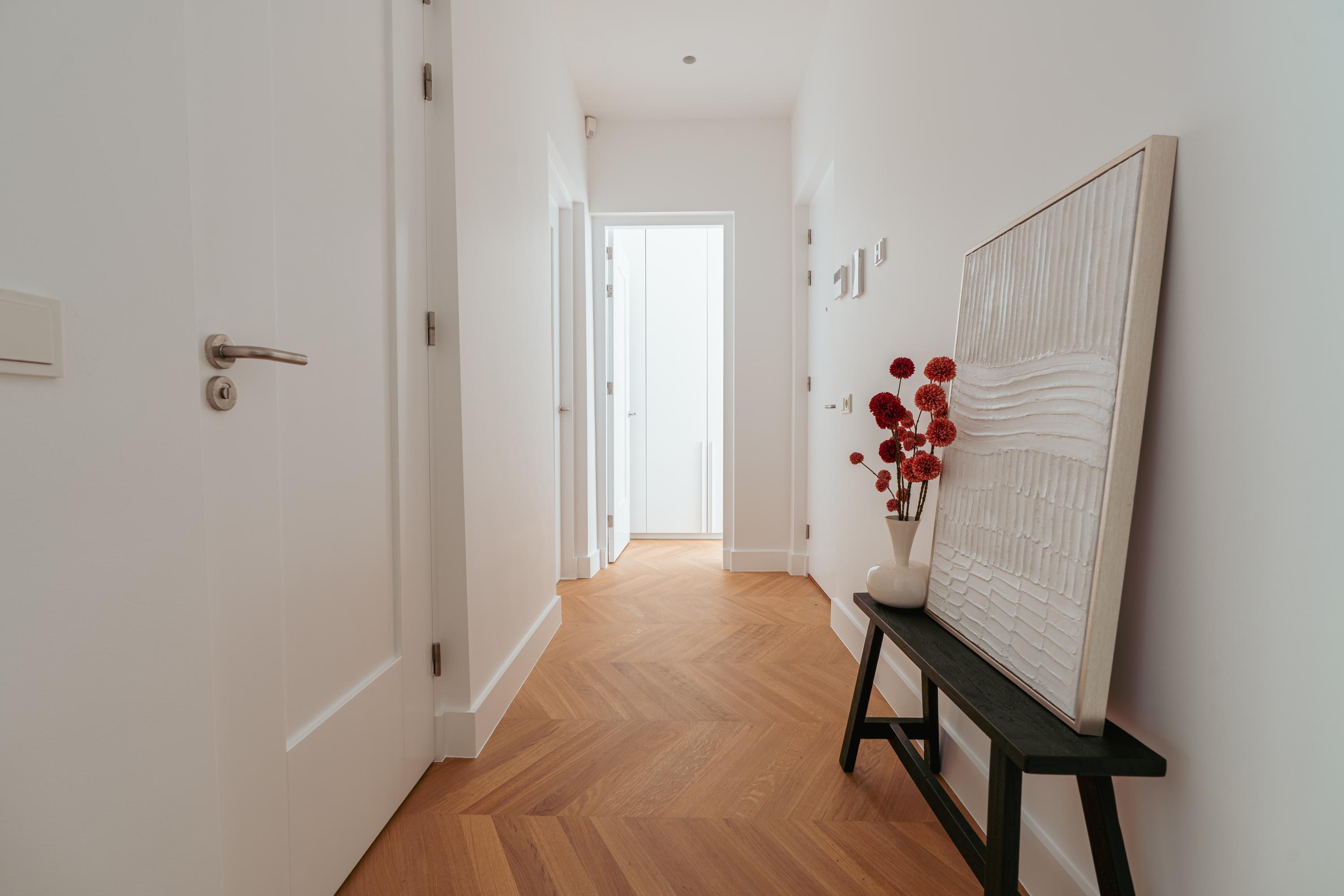 On either side of the hallway are two generously sized bedrooms. The master bedroom features custom-built wardrobes and a private en-suite bathroom with a walk-in shower and a double washbasin with vanity unit. The second bedroom also includes a built-in wardrobe and a private en-suite bathroom with a walk-in shower and washbasin with vanity. Additionally, there is a separate toilet with a washbasin and a practical storage room with connections for a washing machine and dryer.