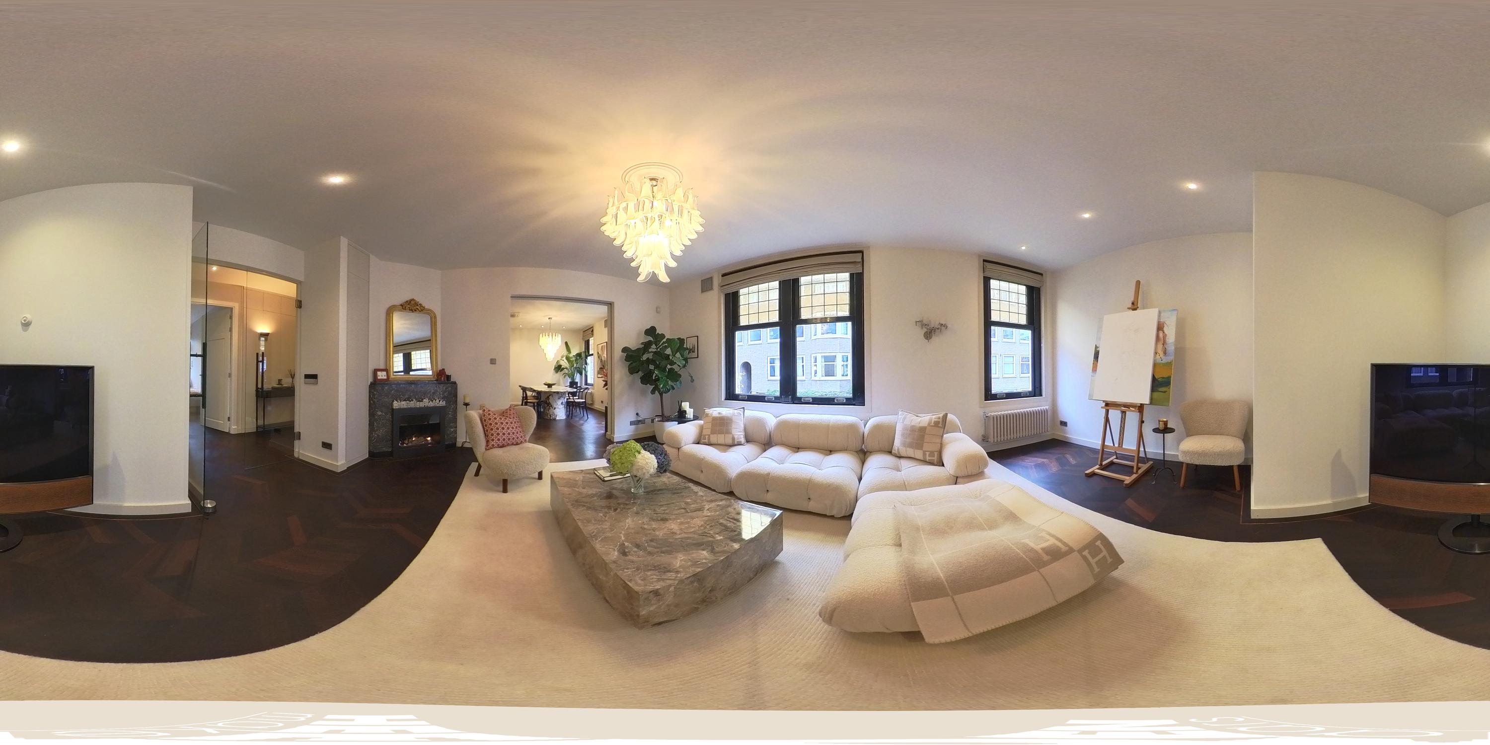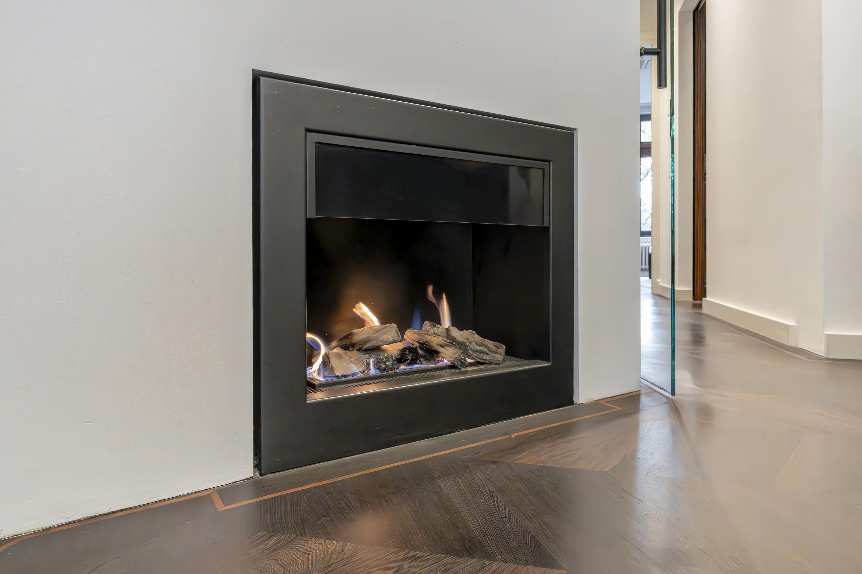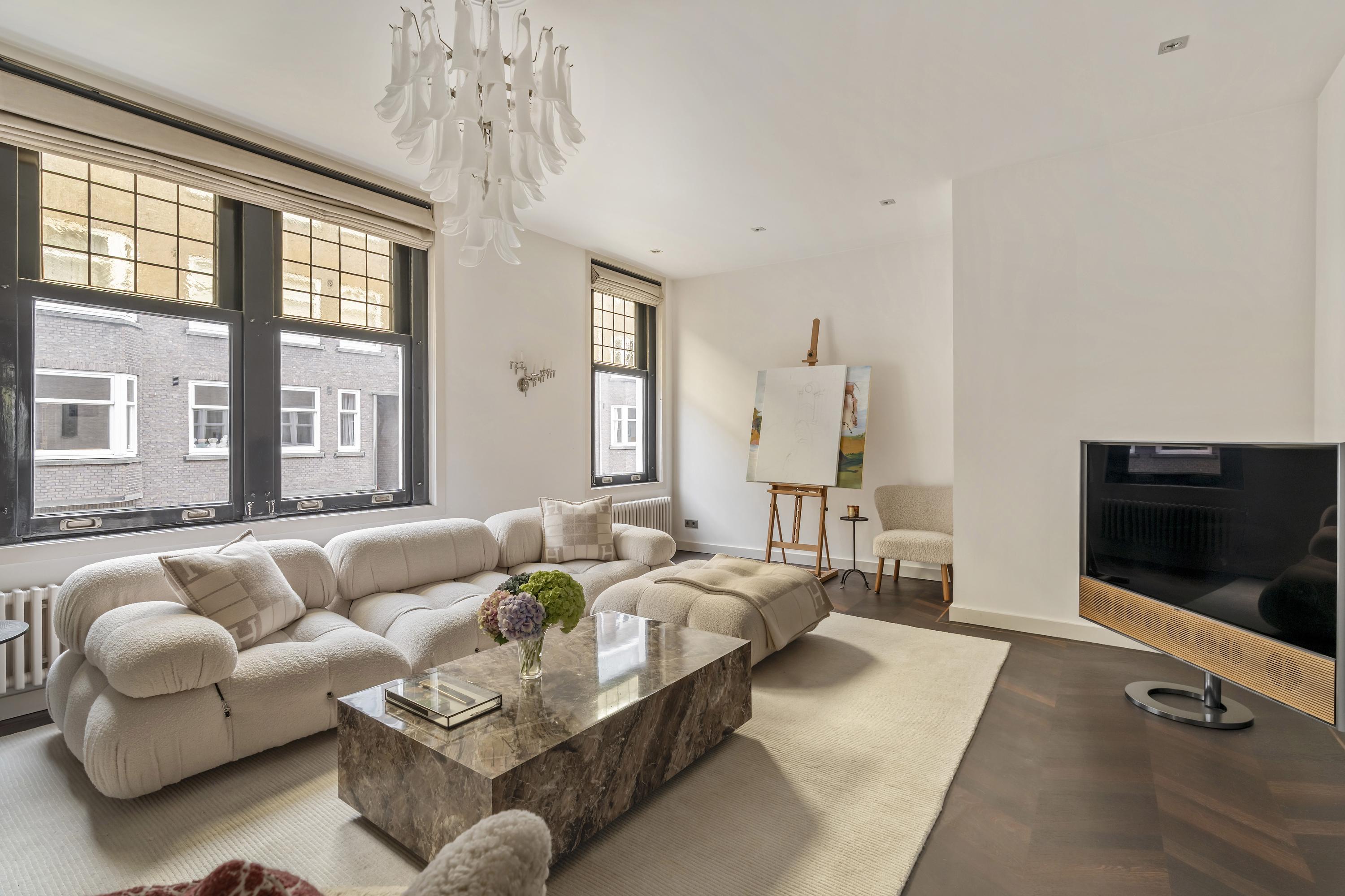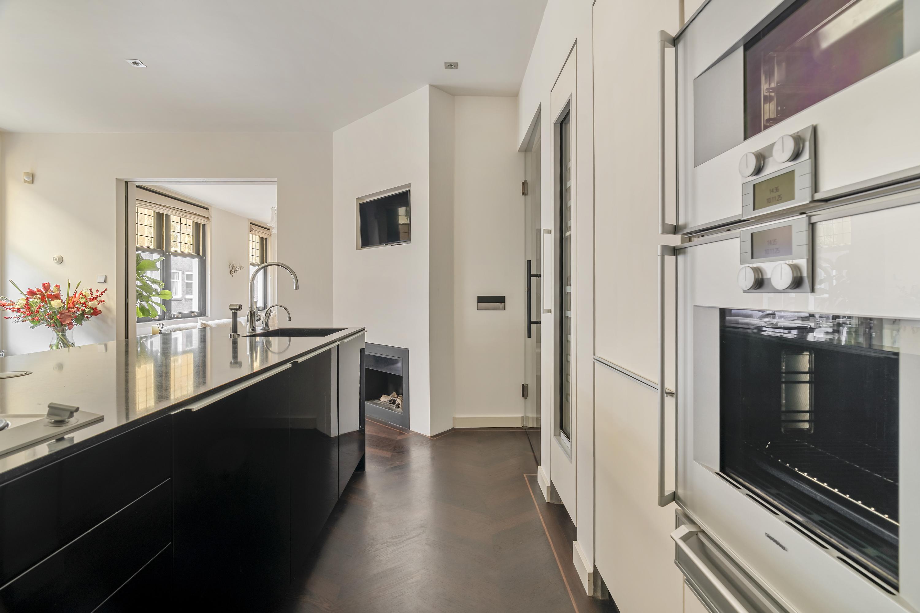 The apartment is accessed via an open entrance hall that leads directly into the home. The hallway features custom-made hardwood built-in cabinets, both practical and elegant, with space for the washing machine and dryer. A separate toilet with a washbasin is also located here. At the front of the apartment lies the spacious living room, an inviting area featuring a charming gas fireplace and characteristic stained-glass windows. The electric French doors and sliding doors leading to the kitchen, both equipped with subtle designer lighting, create a seamless transition between the living and cooking areas. The kitchen, designed by Poggenpohl, forms the true heart of the home. It is equipped with top-of-the-line Gaggenau appliances, including a plate warmer, steam oven, oven, two refrigerators, a wine climate cabinet, a 3-burner gas cooktop with Teppanyaki plate, dishwasher, and a Quooker tap. The kitchen also includes an integrated air-conditioning unit. A second gas fireplace and built-in television make this not only a highly functional but also a warm and inviting space to cook and gather.