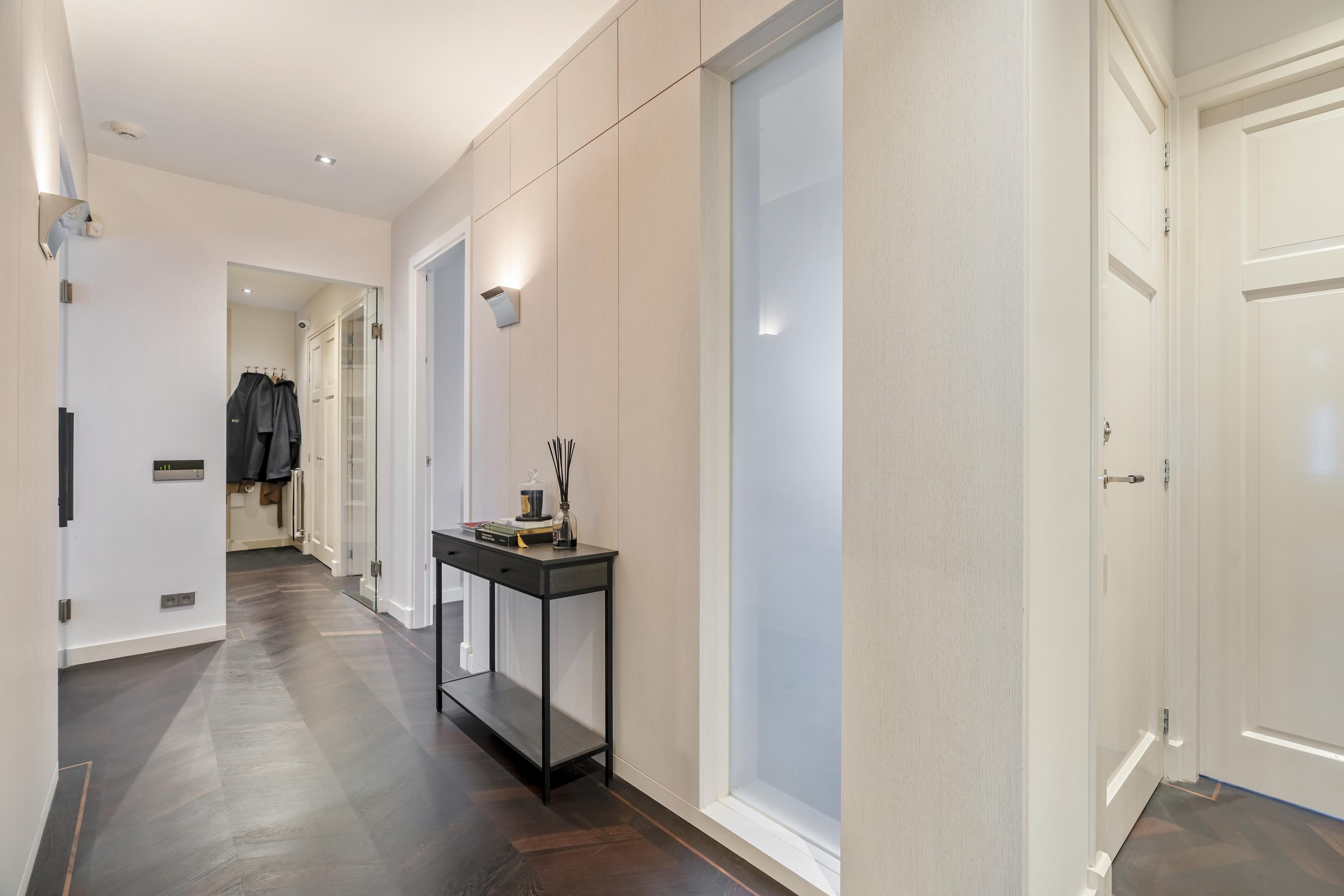 At the quiet rear of the apartment are three well-proportioned bedrooms and the modern bathroom. The master bedroom features built-in wardrobes, air conditioning, and electrically operated windows that allow natural light to fill the room. The second bedroom, also equipped with air conditioning, includes a custom-designed loft bed with integrated storage and a matching built-in desk. The third bedroom is ideal as a children’s room, guest room, or home office. All bedrooms offer access to the exceptionally wide balcony. A true eye-catcher is the generous walk-in closet, accessible via automatically controlled glass doors and executed in a luxurious, tailored design. Centrally located is the modern bathroom, equipped with a spacious bathtub, double washbasin with cabinet, and a large rain shower fitted with Axor taps. The designer radiator by Thermic adds both comfort and elegance. The lighting throughout the home is controlled via a Lutron system, developed in collaboration with Bang & Olufsen. The entire apartment features a beautiful and solid Wenge hardwood floor.